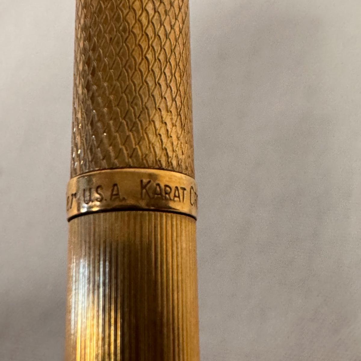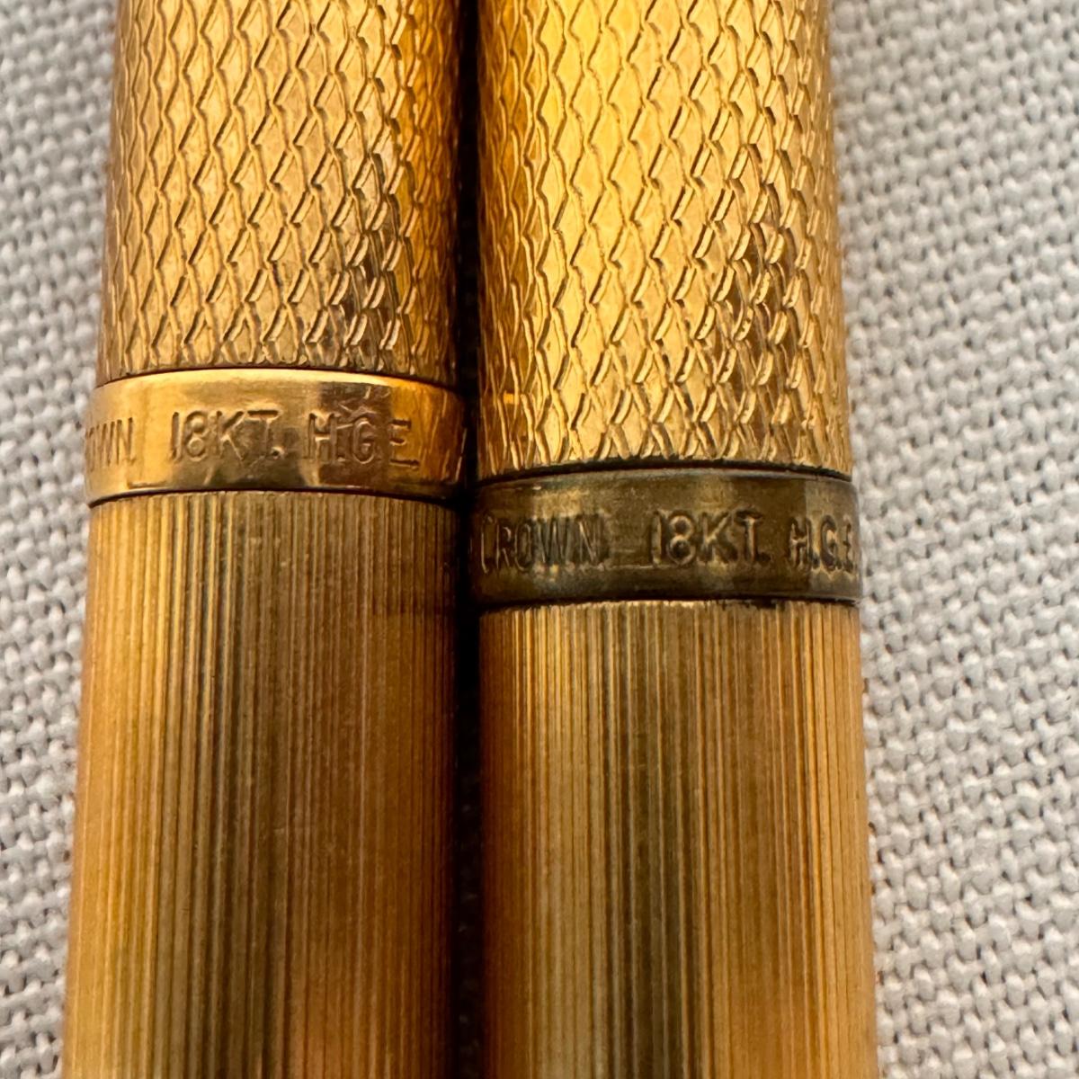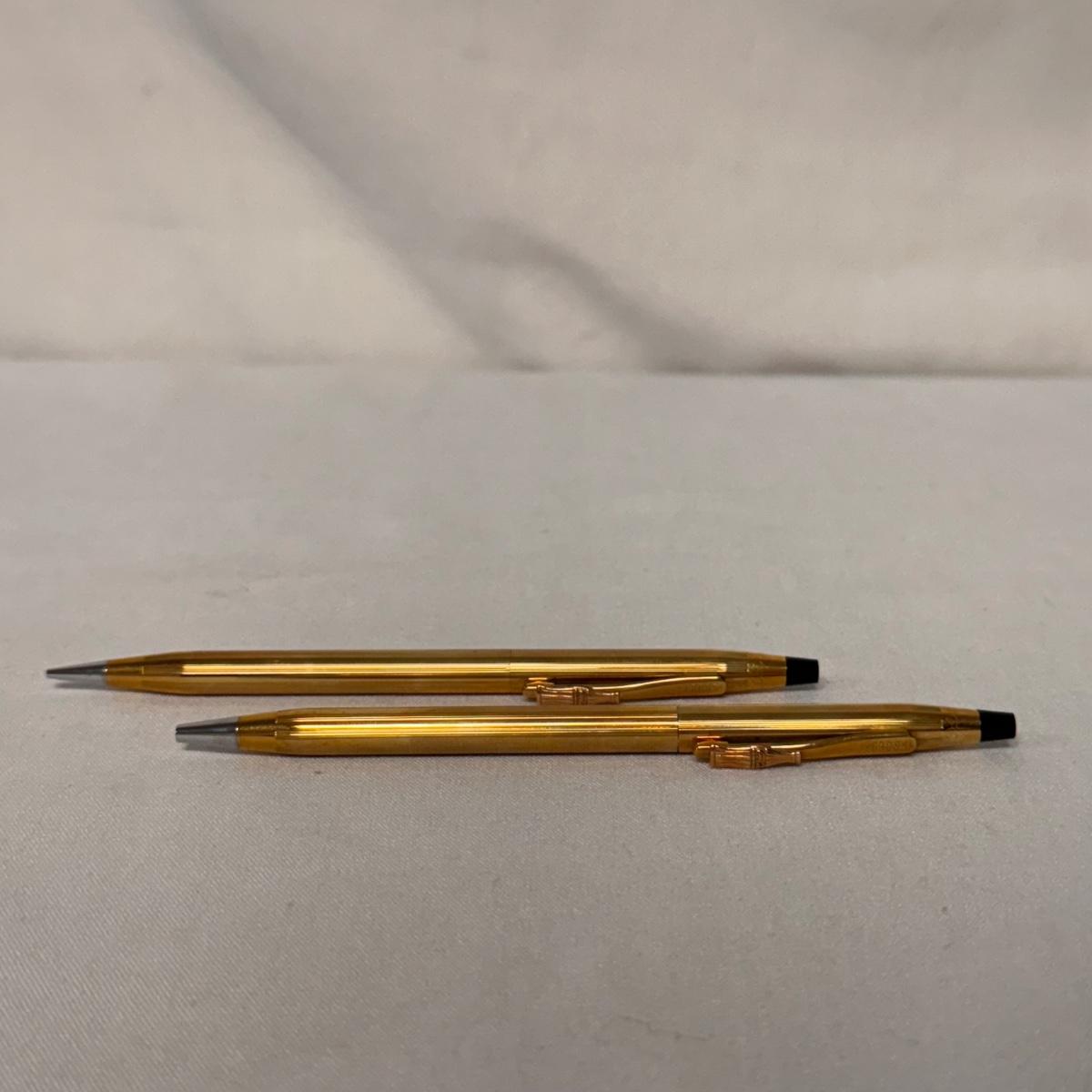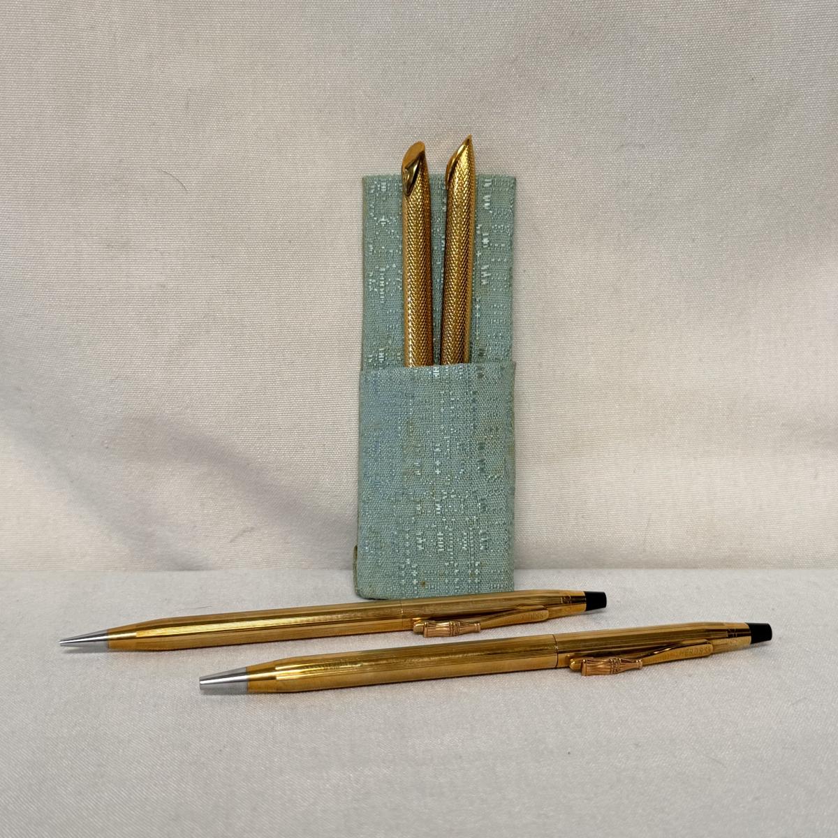 This lot includes one Kiesler pen and one Kiesler pencil. Both are marked with 18K H.G.E. It also includes one Cross pen and one Cross pencil - both are marked with 1/20 12kt gold. Shipping available.