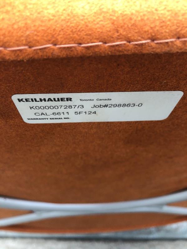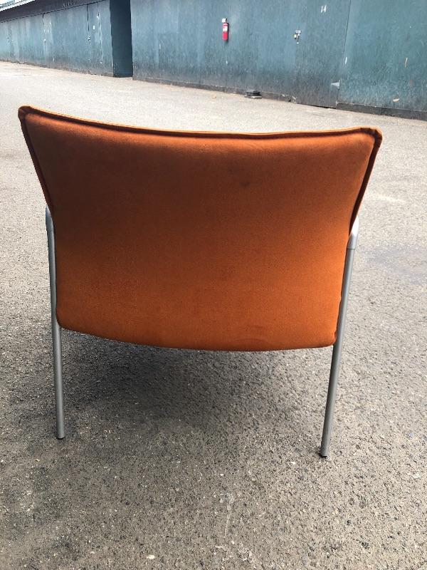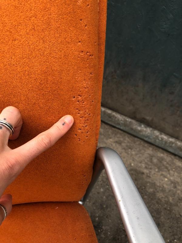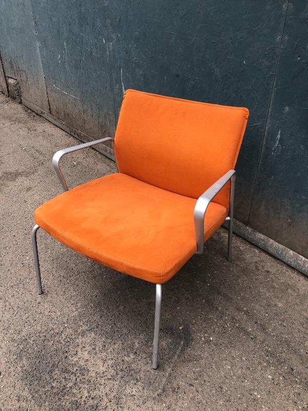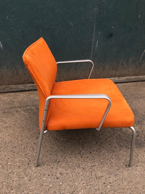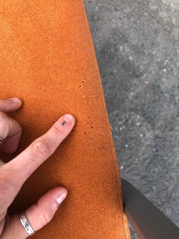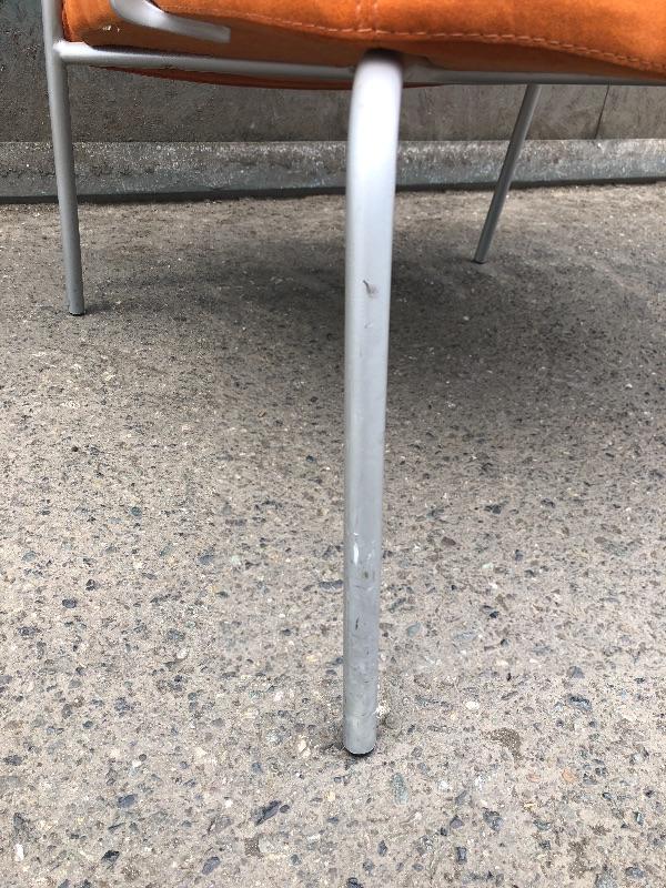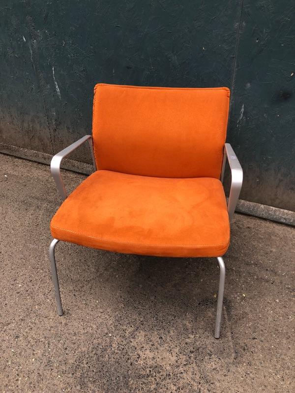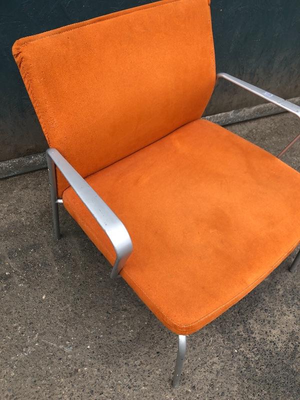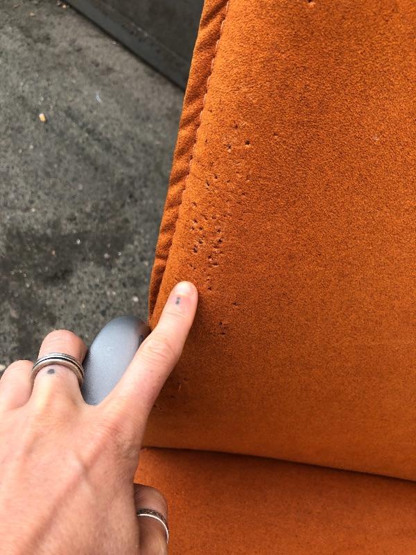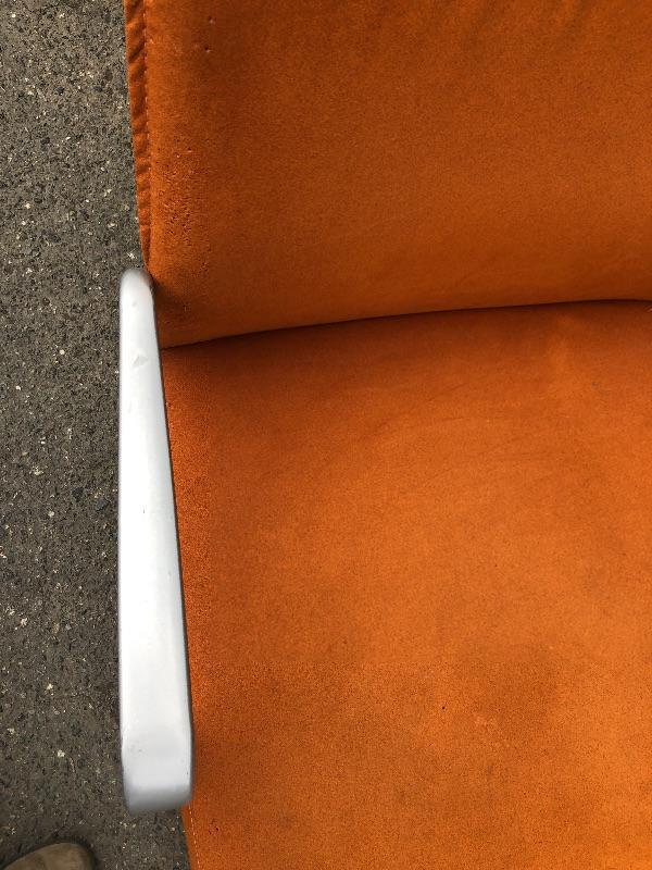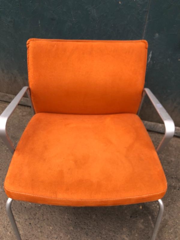 This suede chair would be a great pop of color in your home! There is a bit of damage around the edges of the suede that can be seen in the photos.