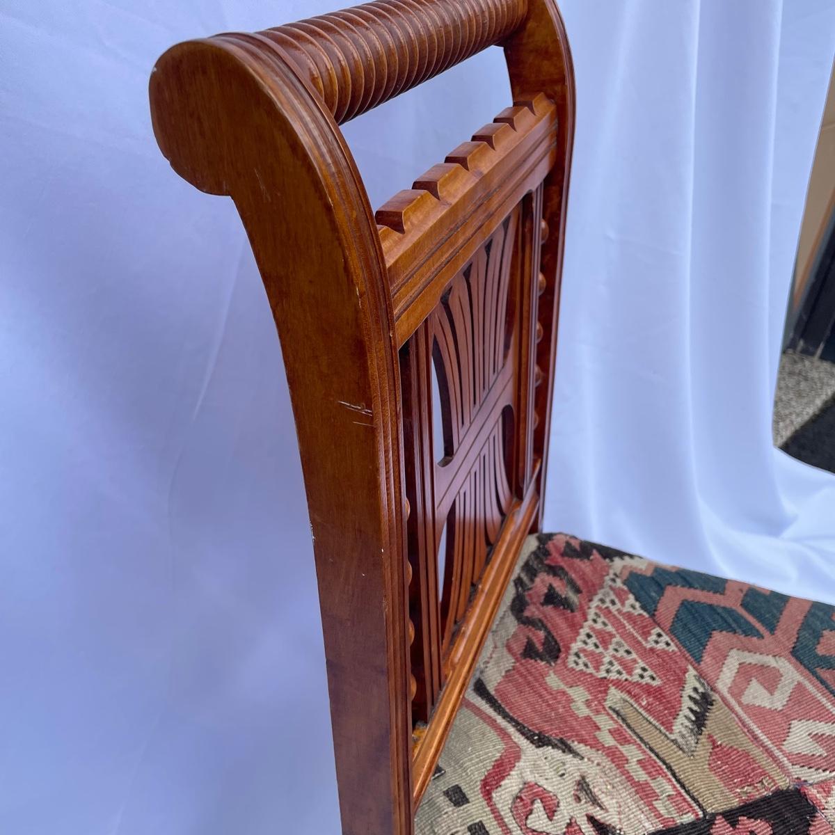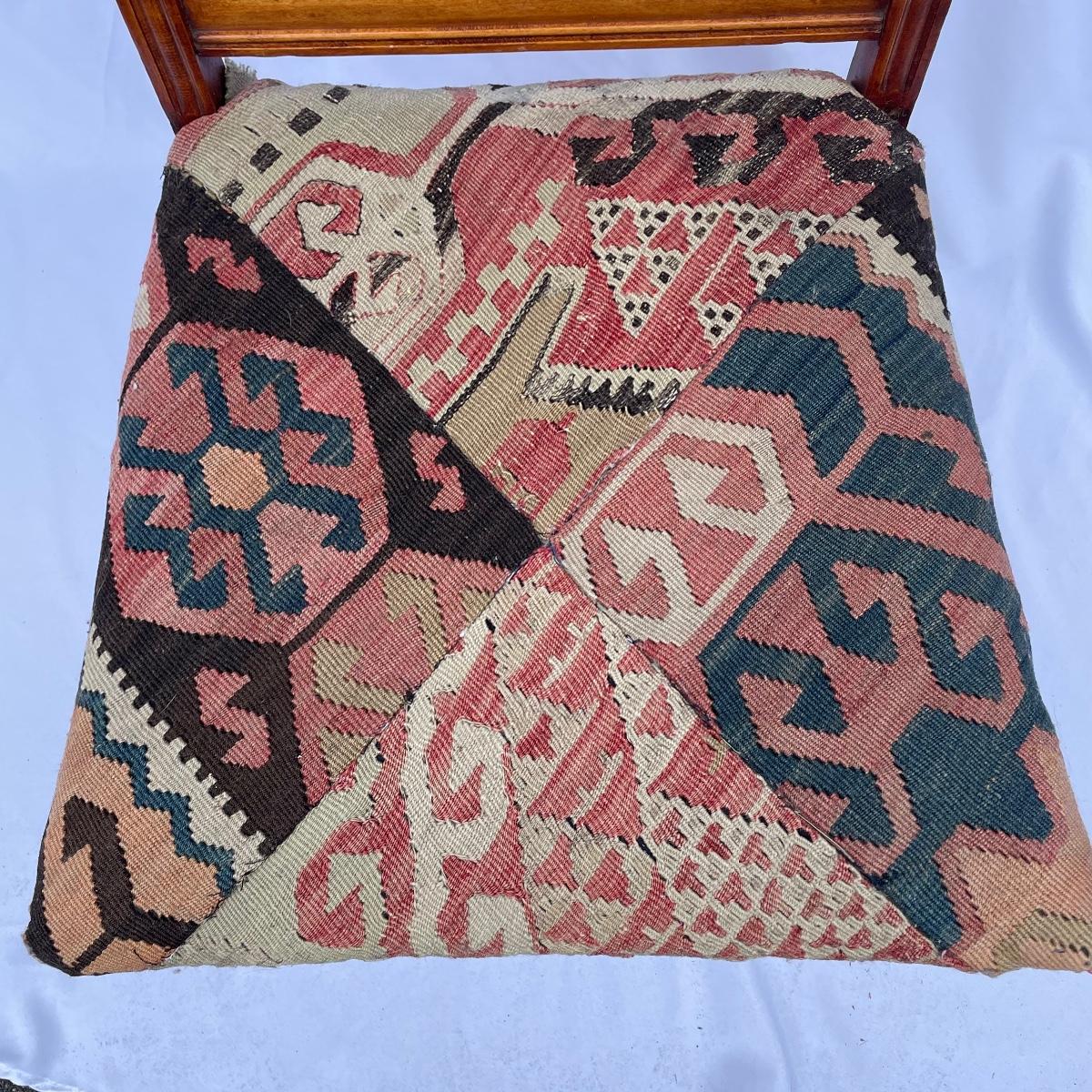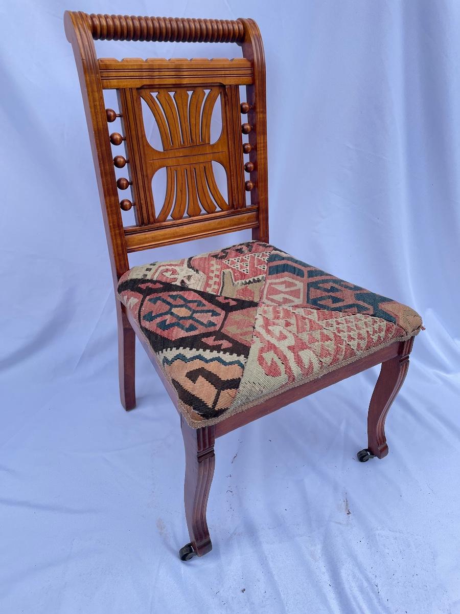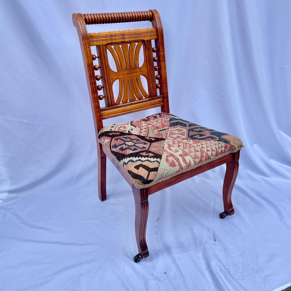 This solid wood chairs features some beautiful carved features and embellishments on the back rest of the piece. The seat has a kilim upholstery and the two front legs are on casters. See images as there is a corner of fabric loose at the back abs some small paint marks.