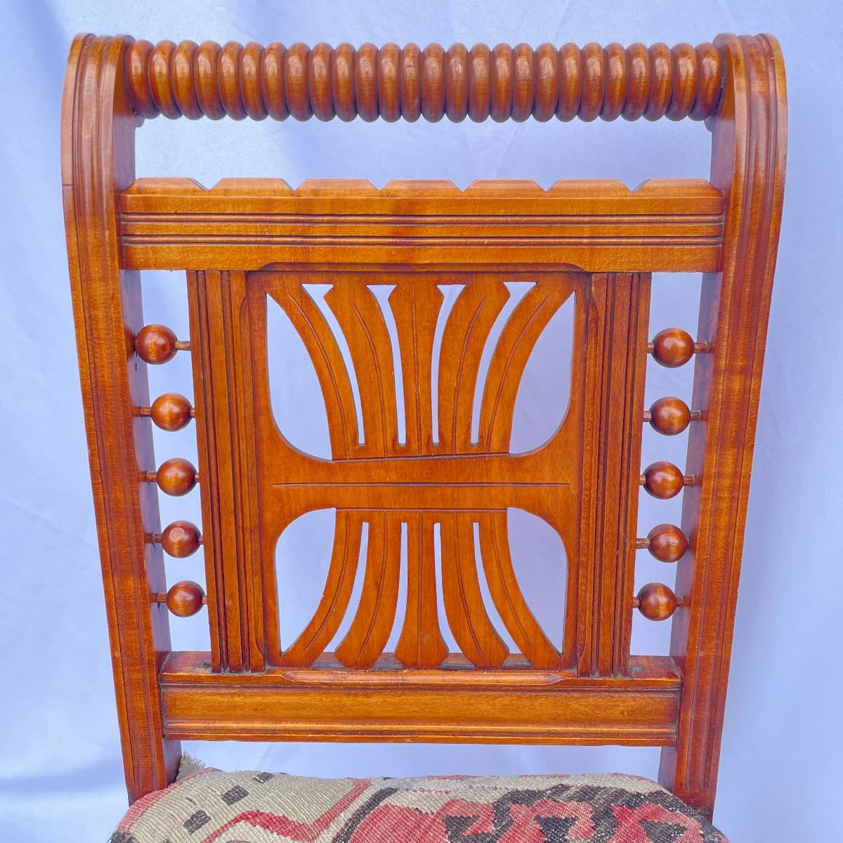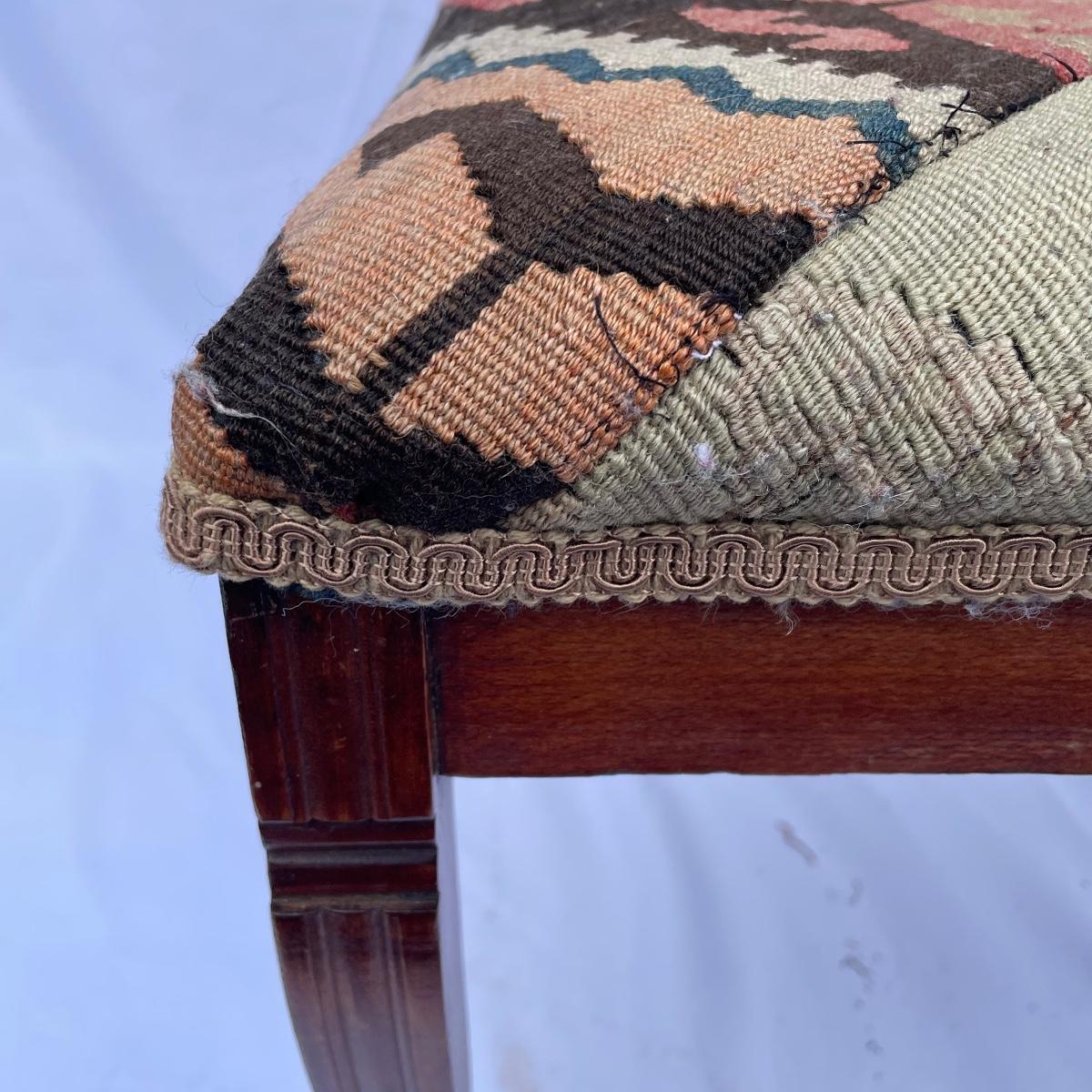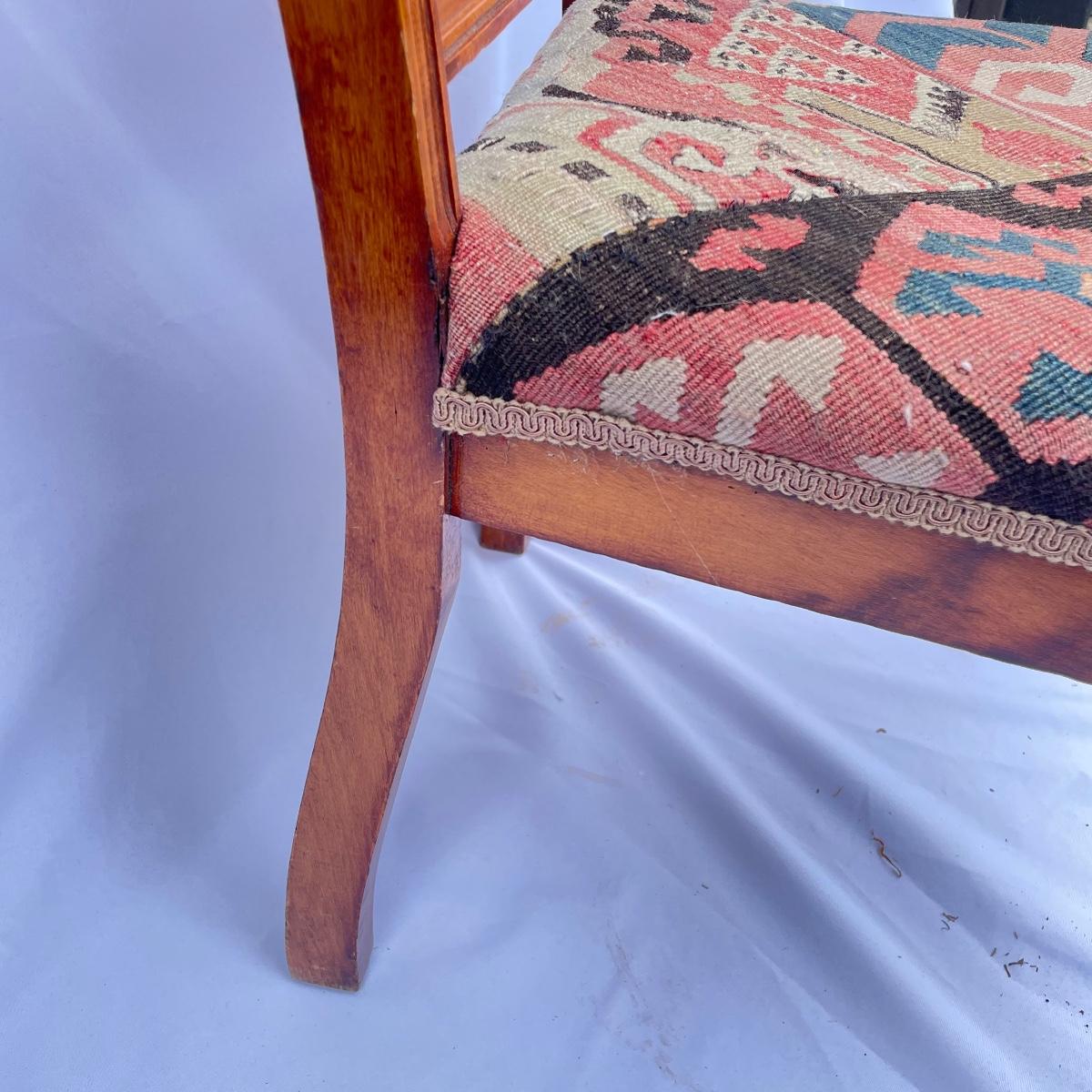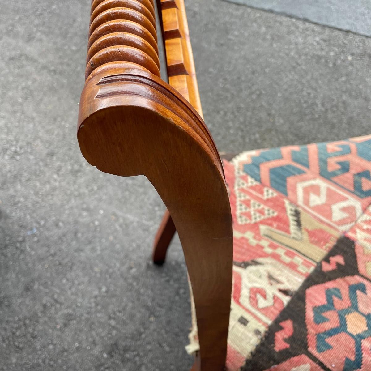 This solid wood chairs features some beautiful carved features and embellishments on the back rest of the piece. The seat has a kilim upholstery and the two front legs are on casters. See images as there is a corner of fabric loose at the back abs some small paint marks.