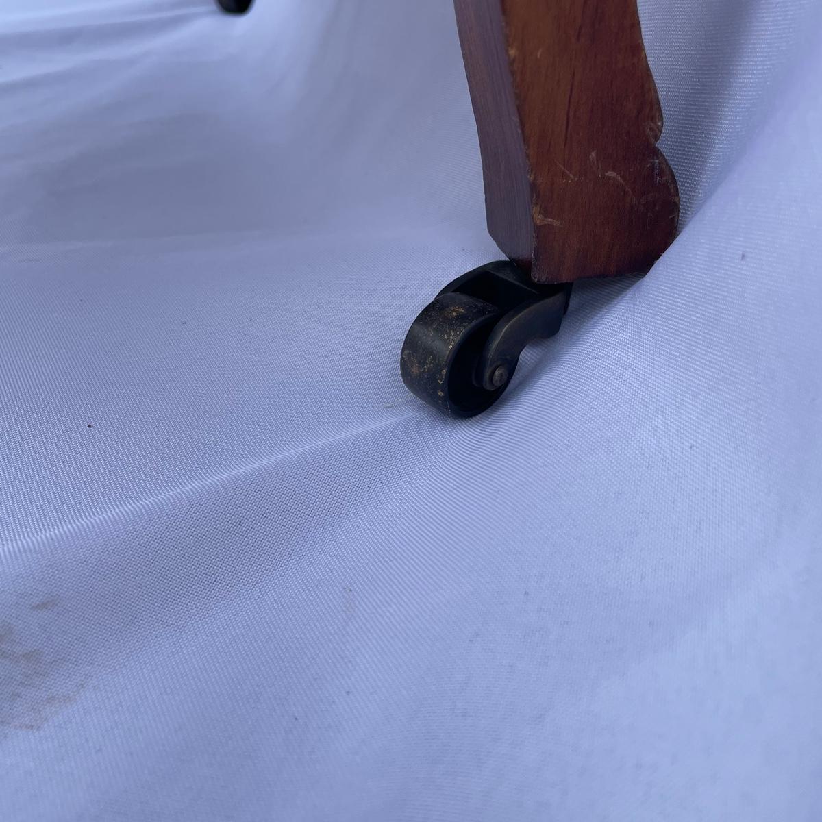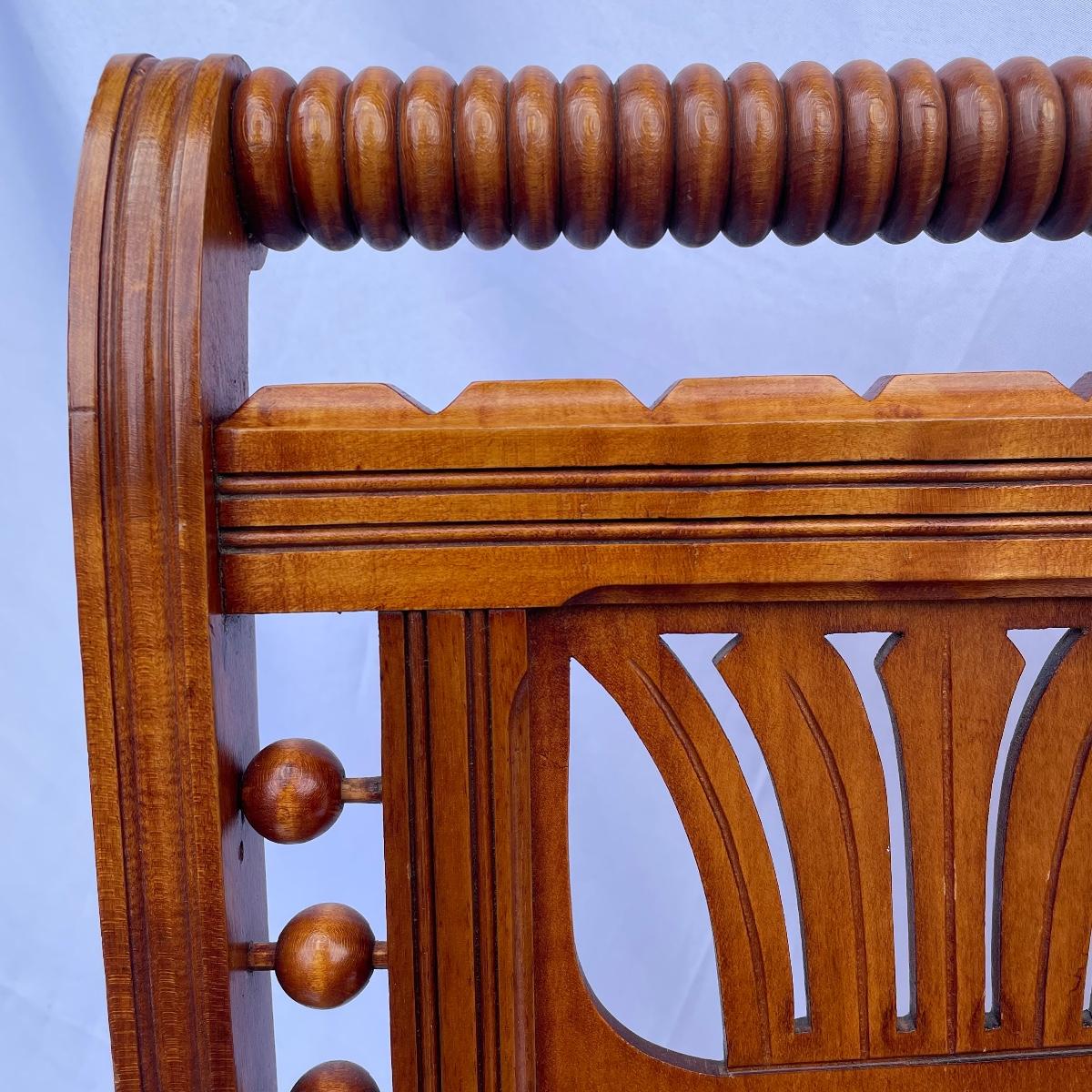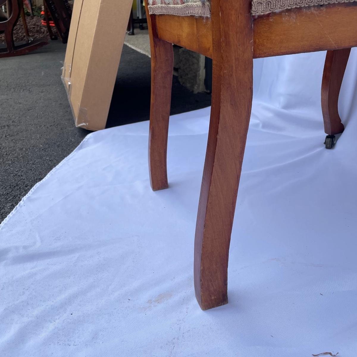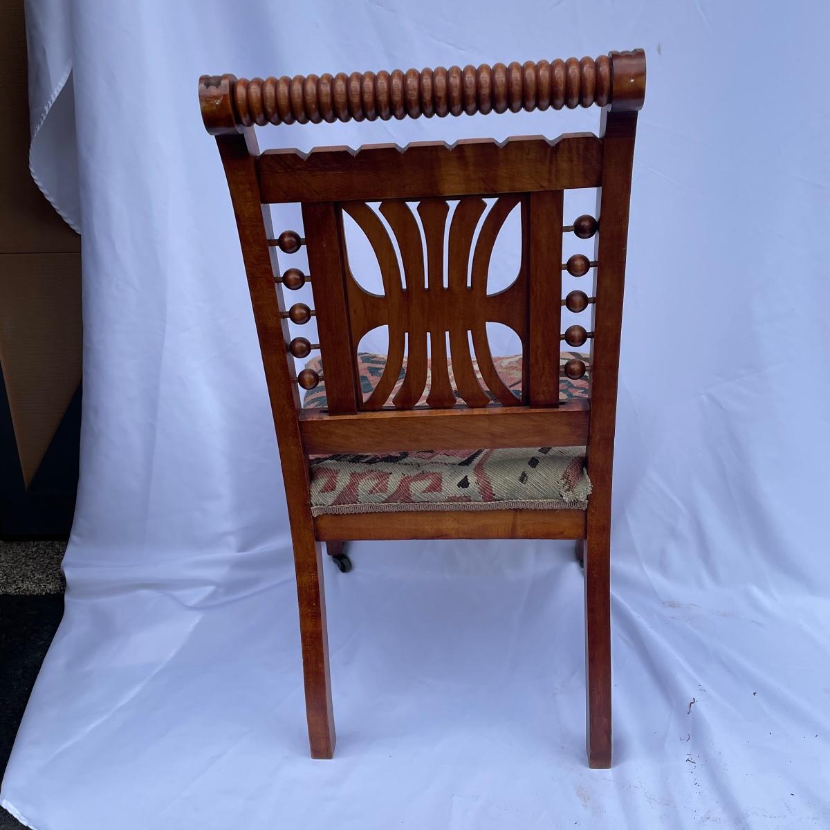 This solid wood chairs features some beautiful carved features and embellishments on the back rest of the piece. The seat has a kilim upholstery and the two front legs are on casters. See images as there is a corner of fabric loose at the back abs some small paint marks.