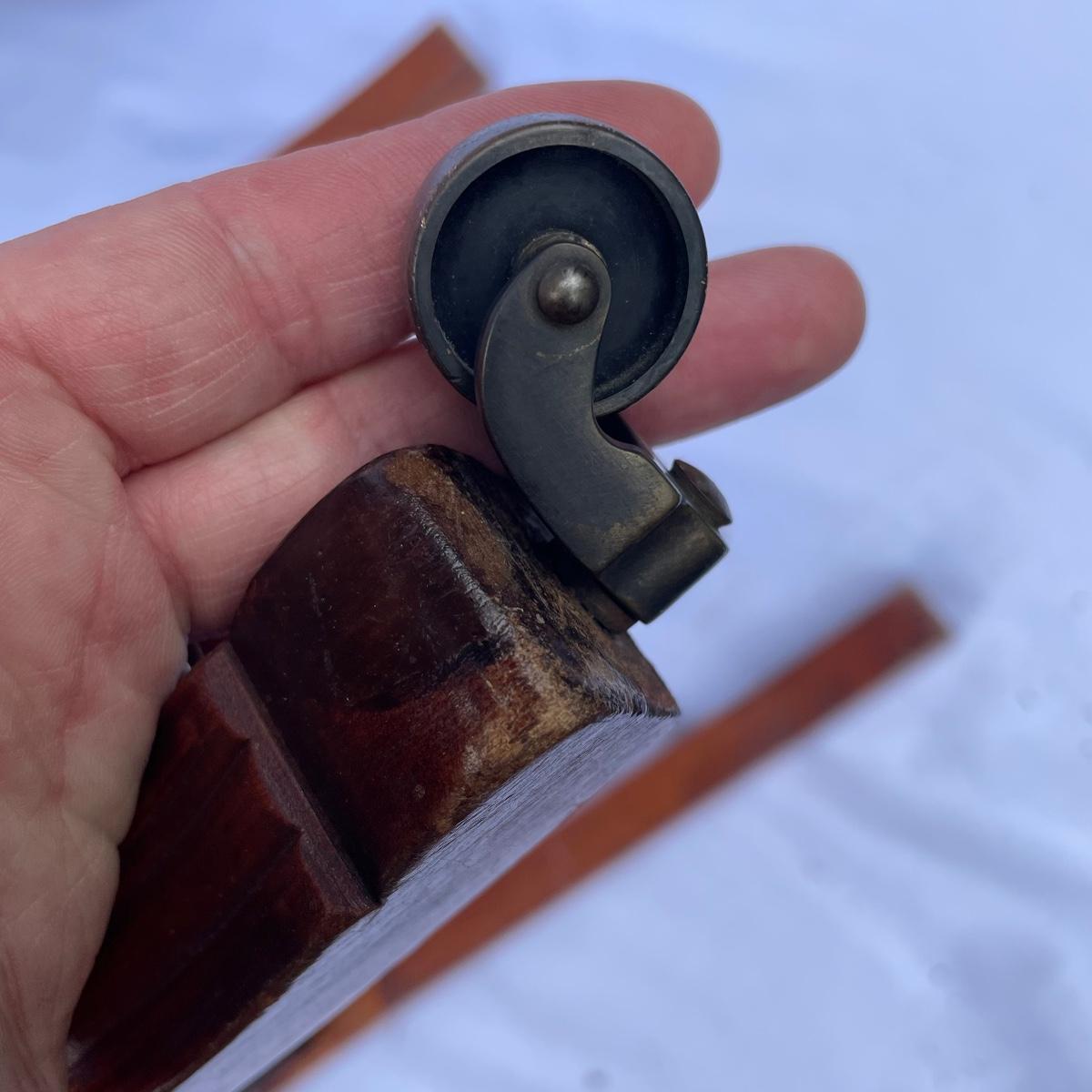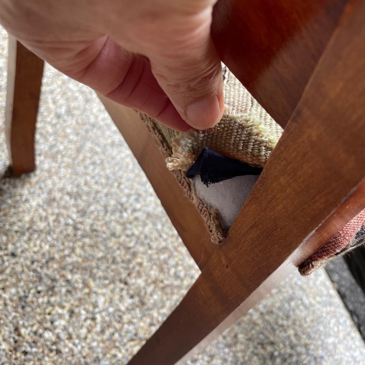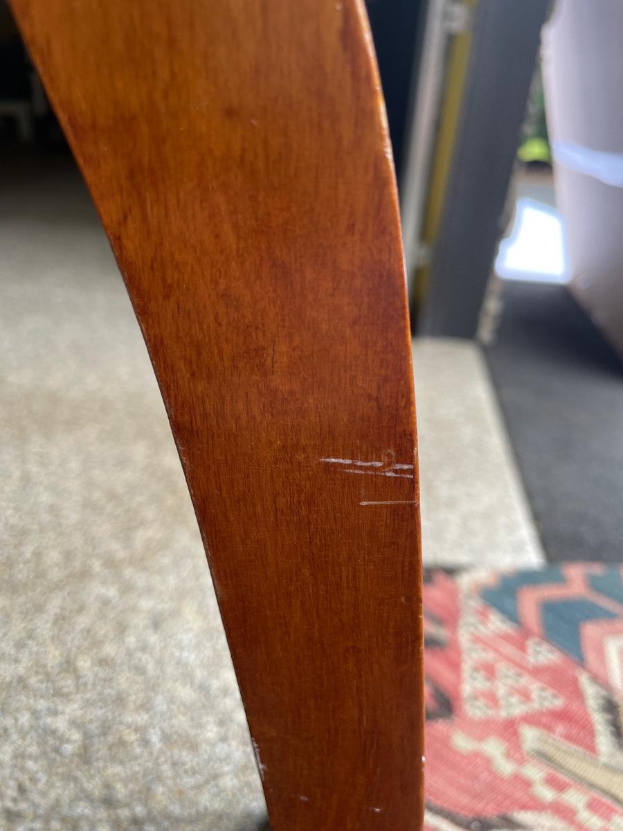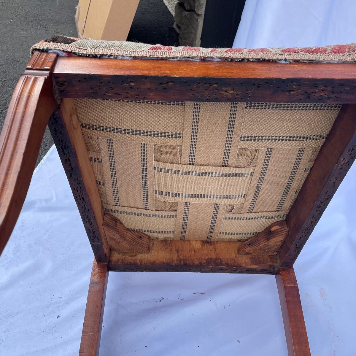 This solid wood chairs features some beautiful carved features and embellishments on the back rest of the piece. The seat has a kilim upholstery and the two front legs are on casters. See images as there is a corner of fabric loose at the back abs some small paint marks.