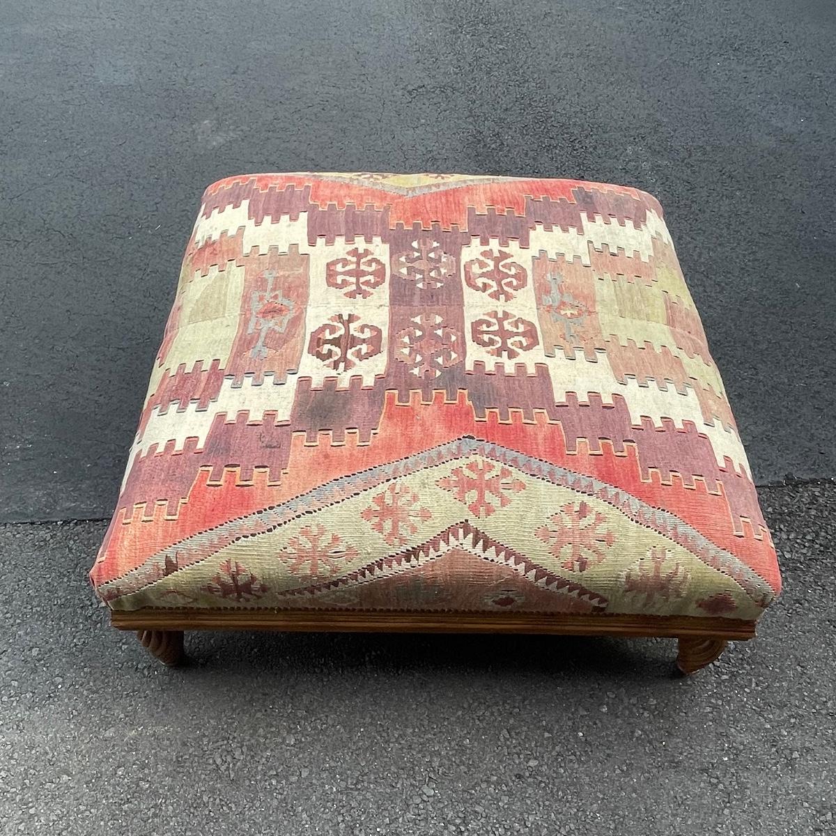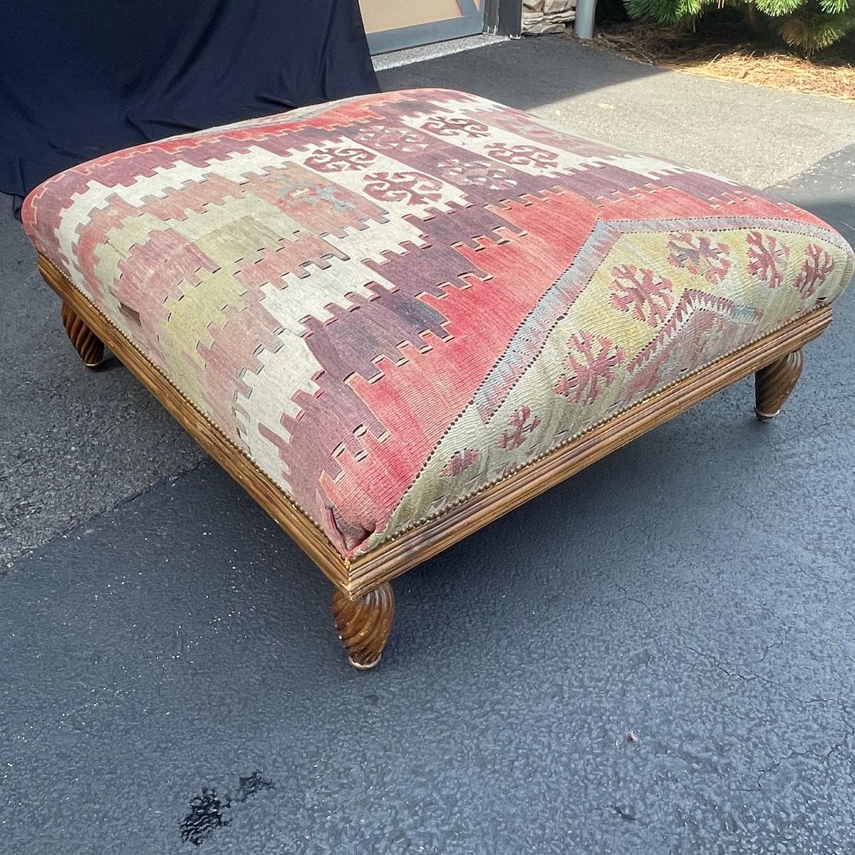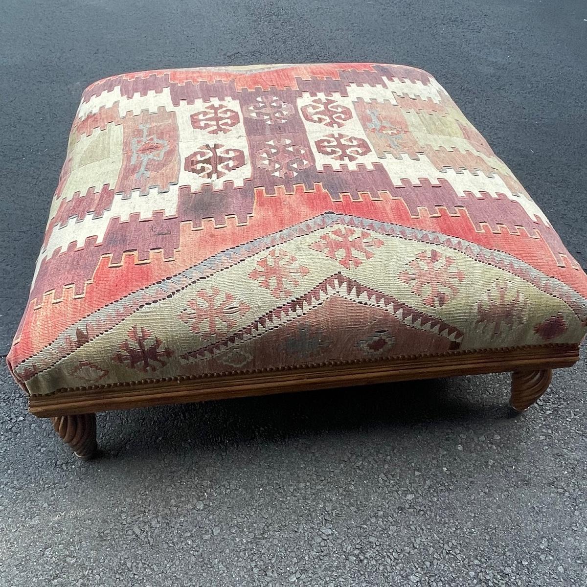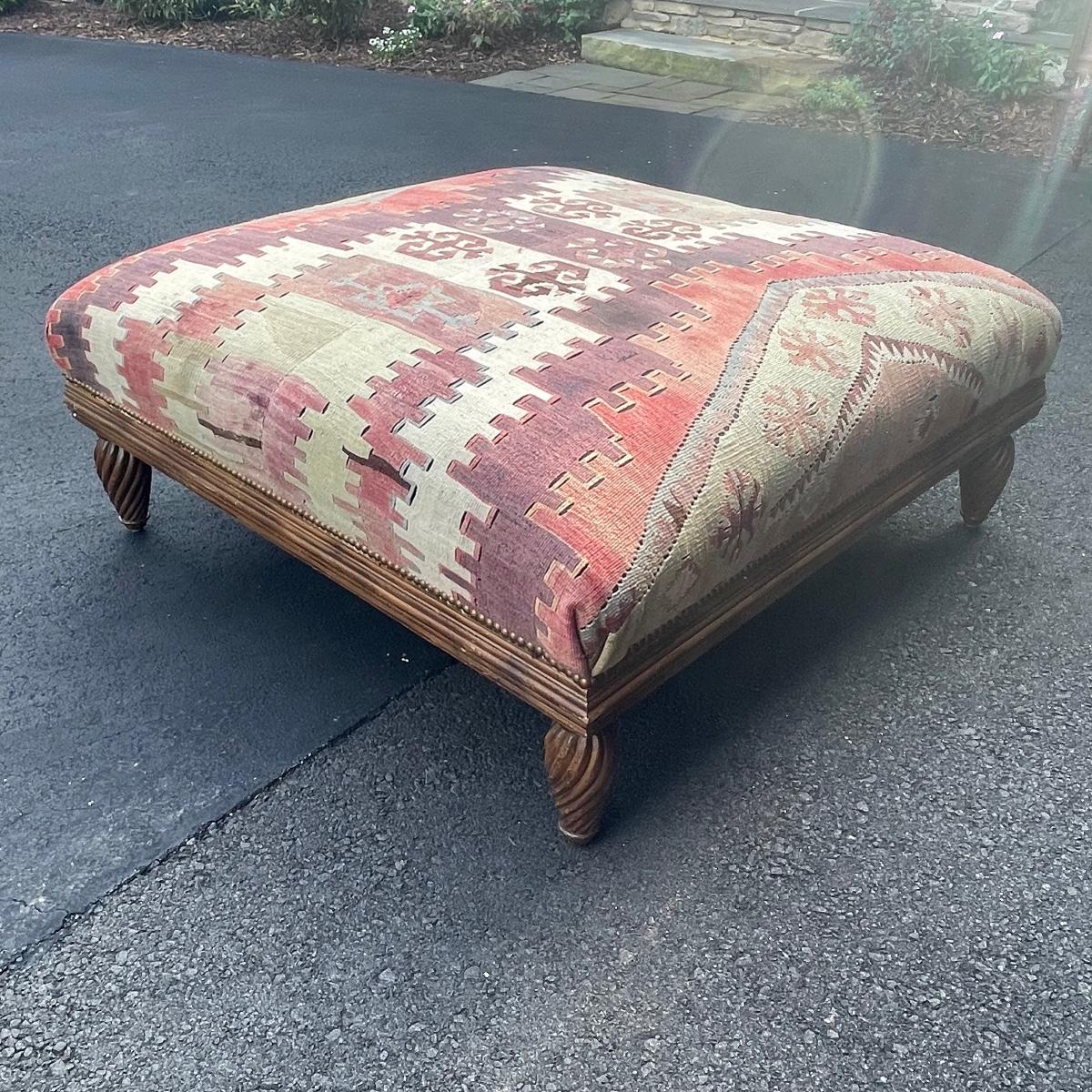 This large Kilim ottoman is a beauty! Measuring 41” square x 16” tall, this ottoman features upholstery in muted shades of pink, red, green and tan attached with brass tacks. The base is solid wood. There are some run marks on the legs and some minor light stains shown in images.