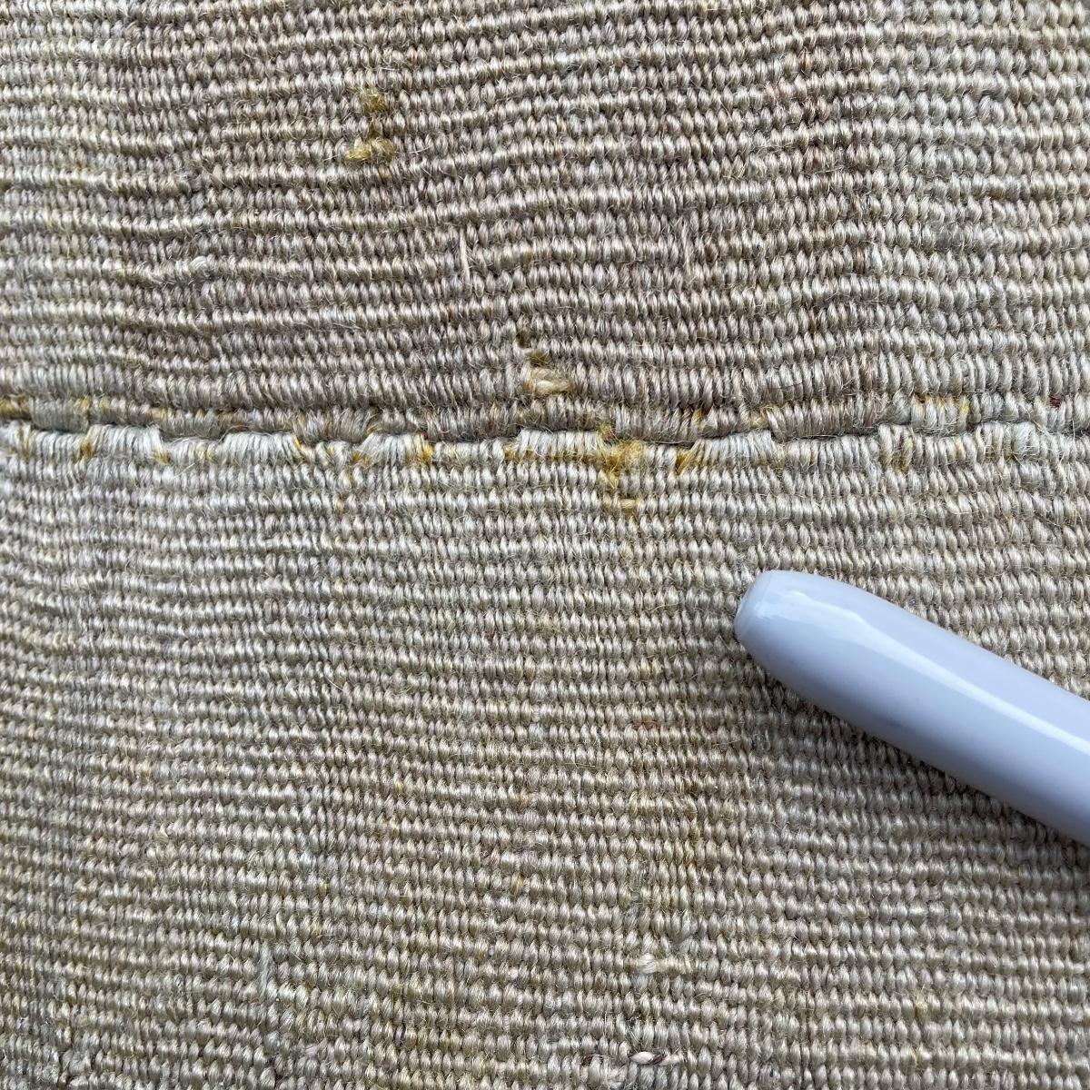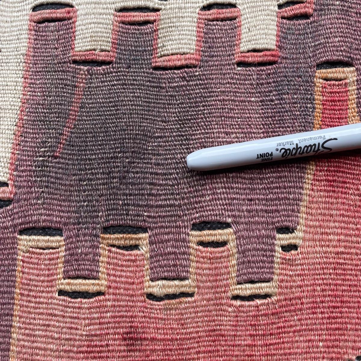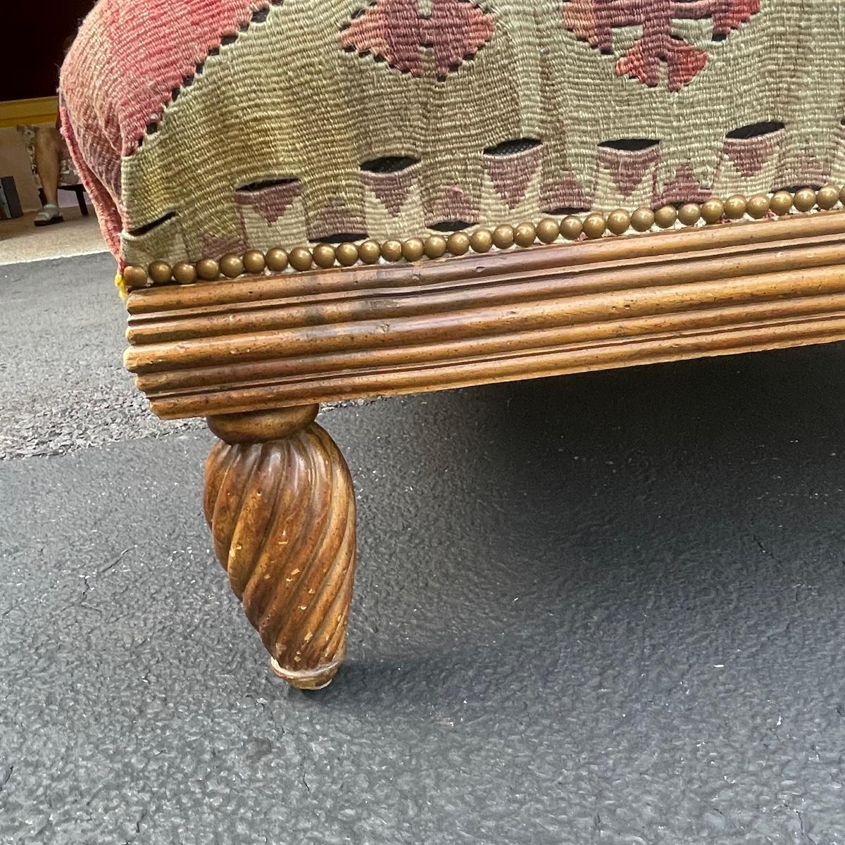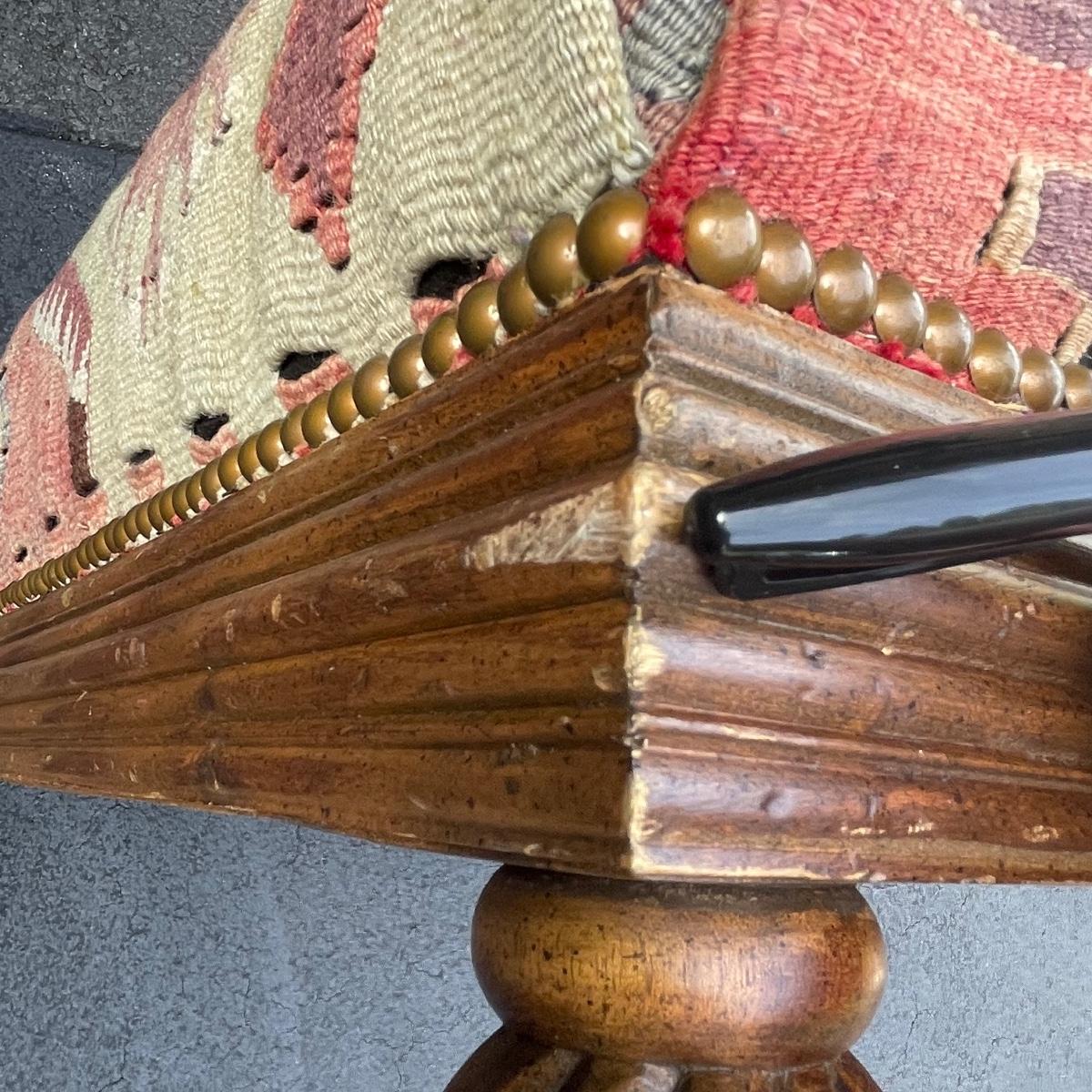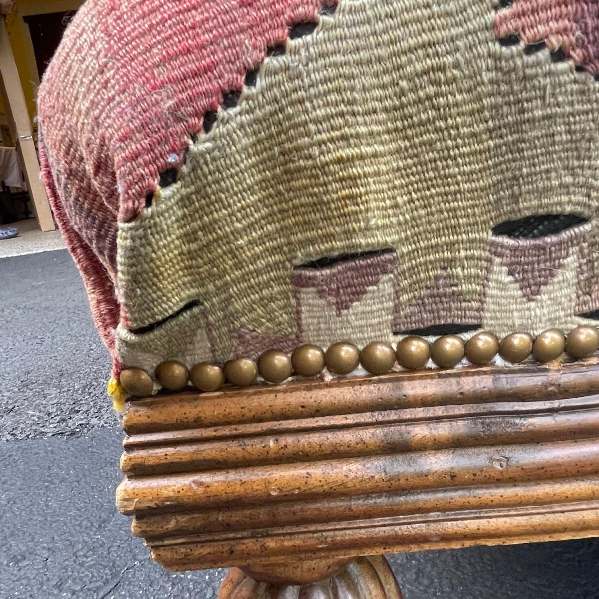 This large Kilim ottoman is a beauty! Measuring 41” square x 16” tall, this ottoman features upholstery in muted shades of pink, red, green and tan attached with brass tacks. The base is solid wood. There are some run marks on the legs and some minor light stains shown in images.