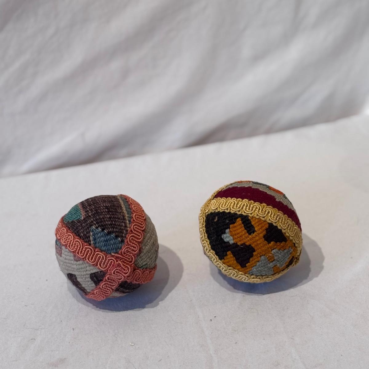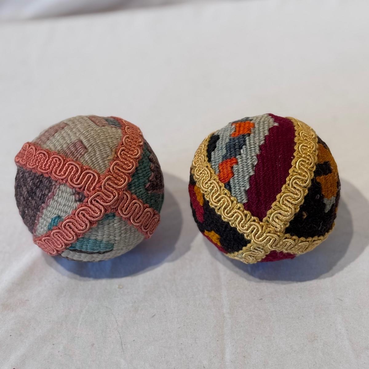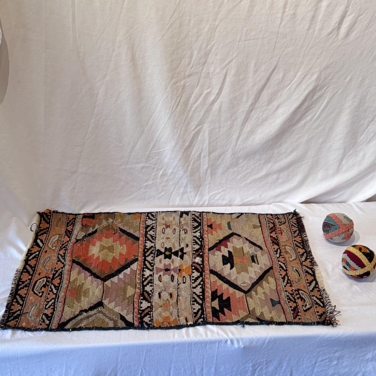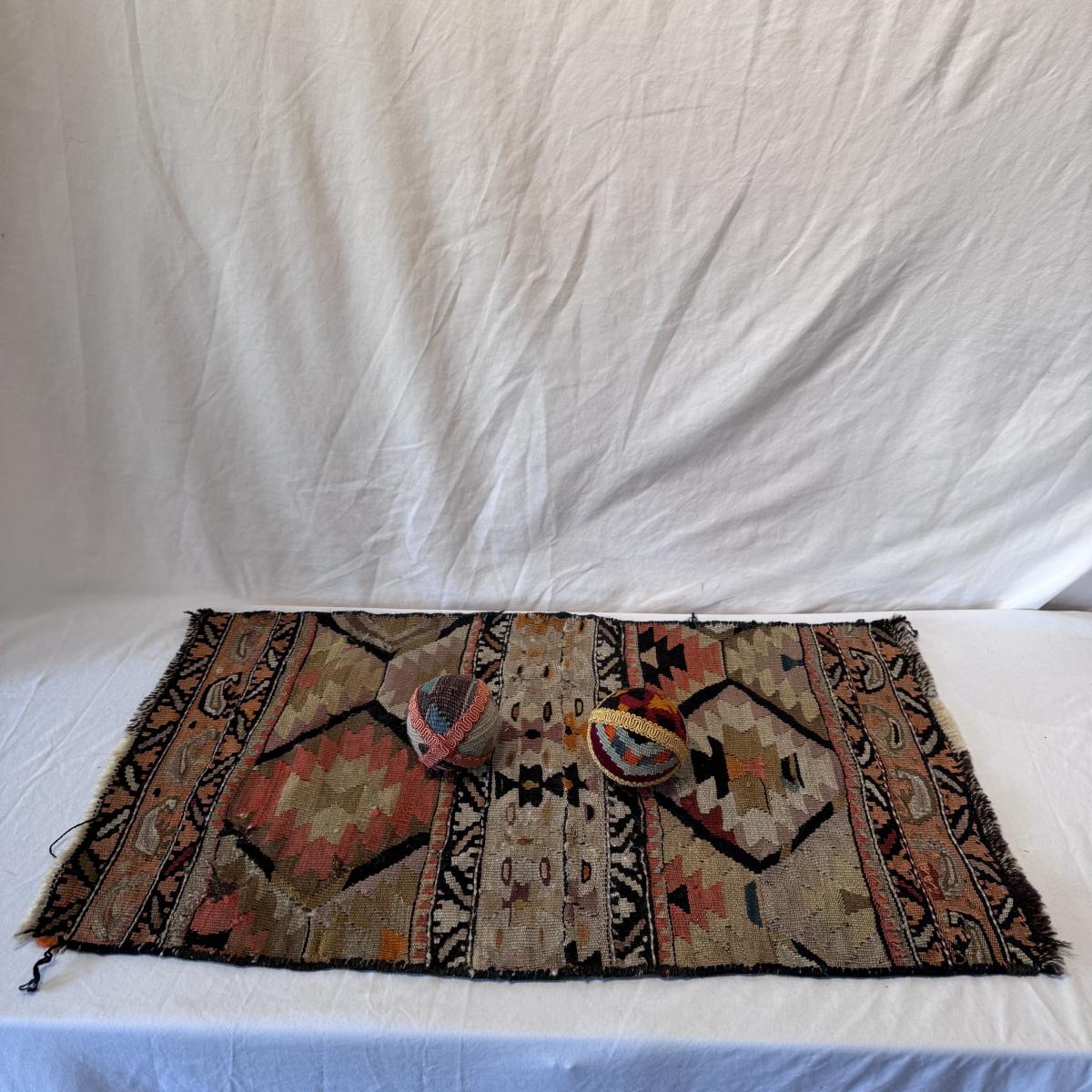 This lot includes one Kilim style door mat and two Temari balls. The Kilim style door mat has some fraying on the ends. It measures 30” x 16.5”H. The Temari balls are traditional Japanese woven balls appear to be handmade. Shipping available.
