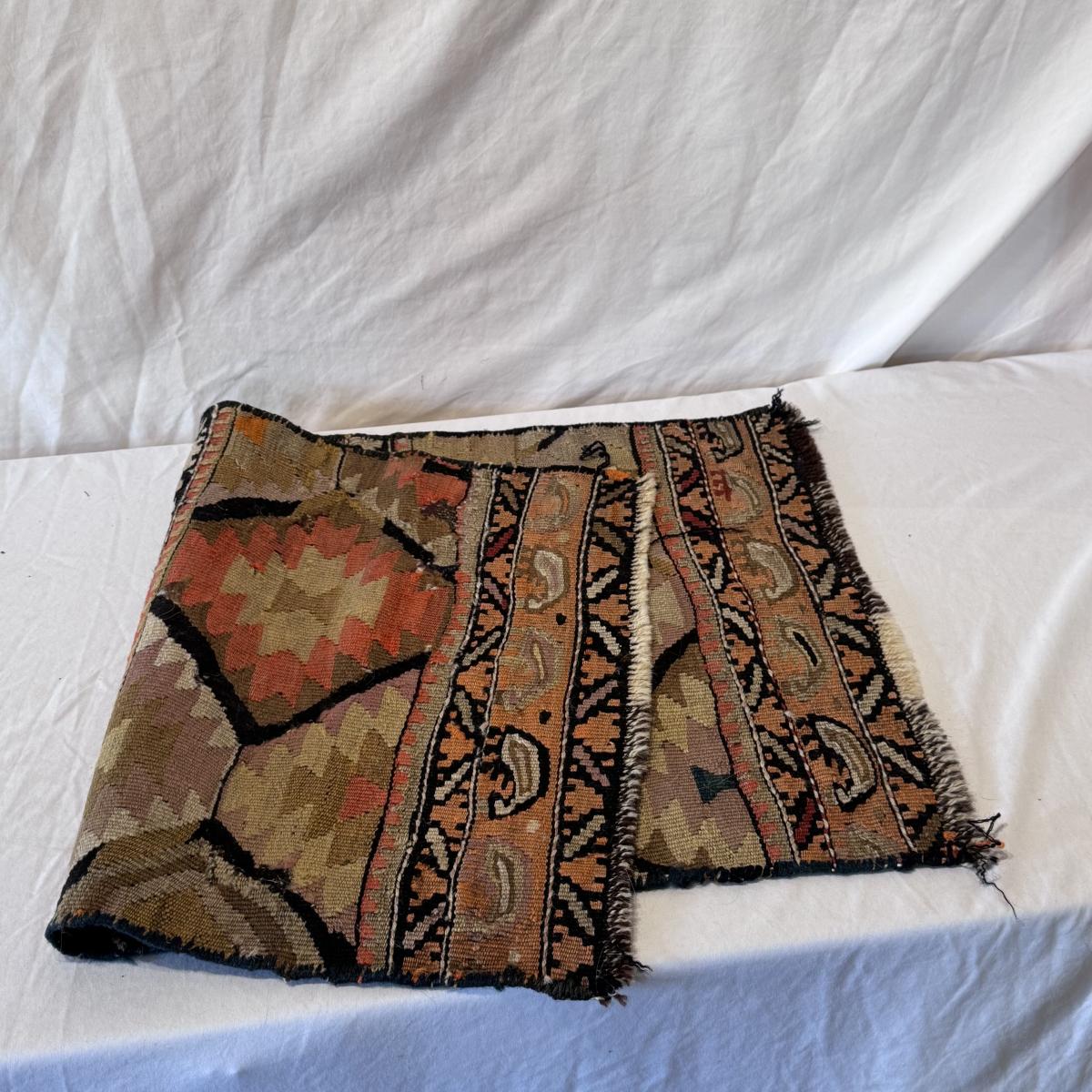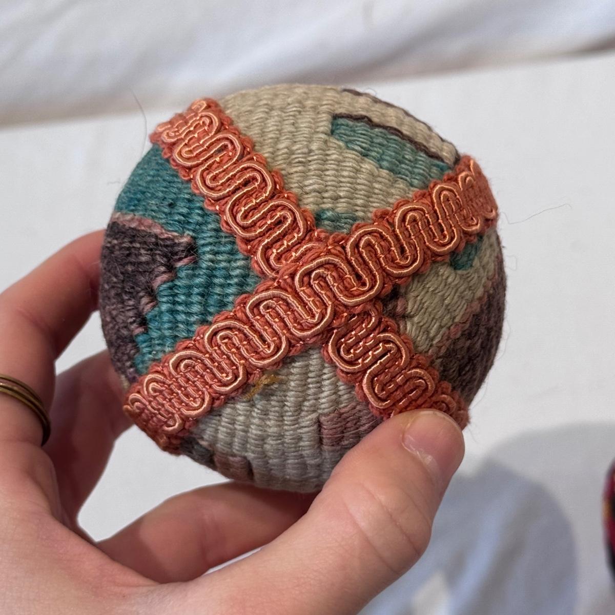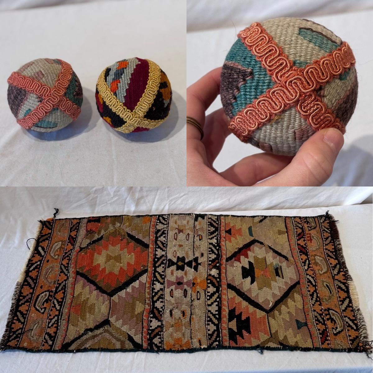 This lot includes one Kilim style door mat and two Temari balls. The Kilim style door mat has some fraying on the ends. It measures 30” x 16.5”H. The Temari balls are traditional Japanese woven balls appear to be handmade. Shipping available.