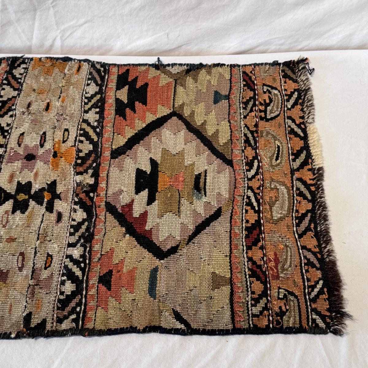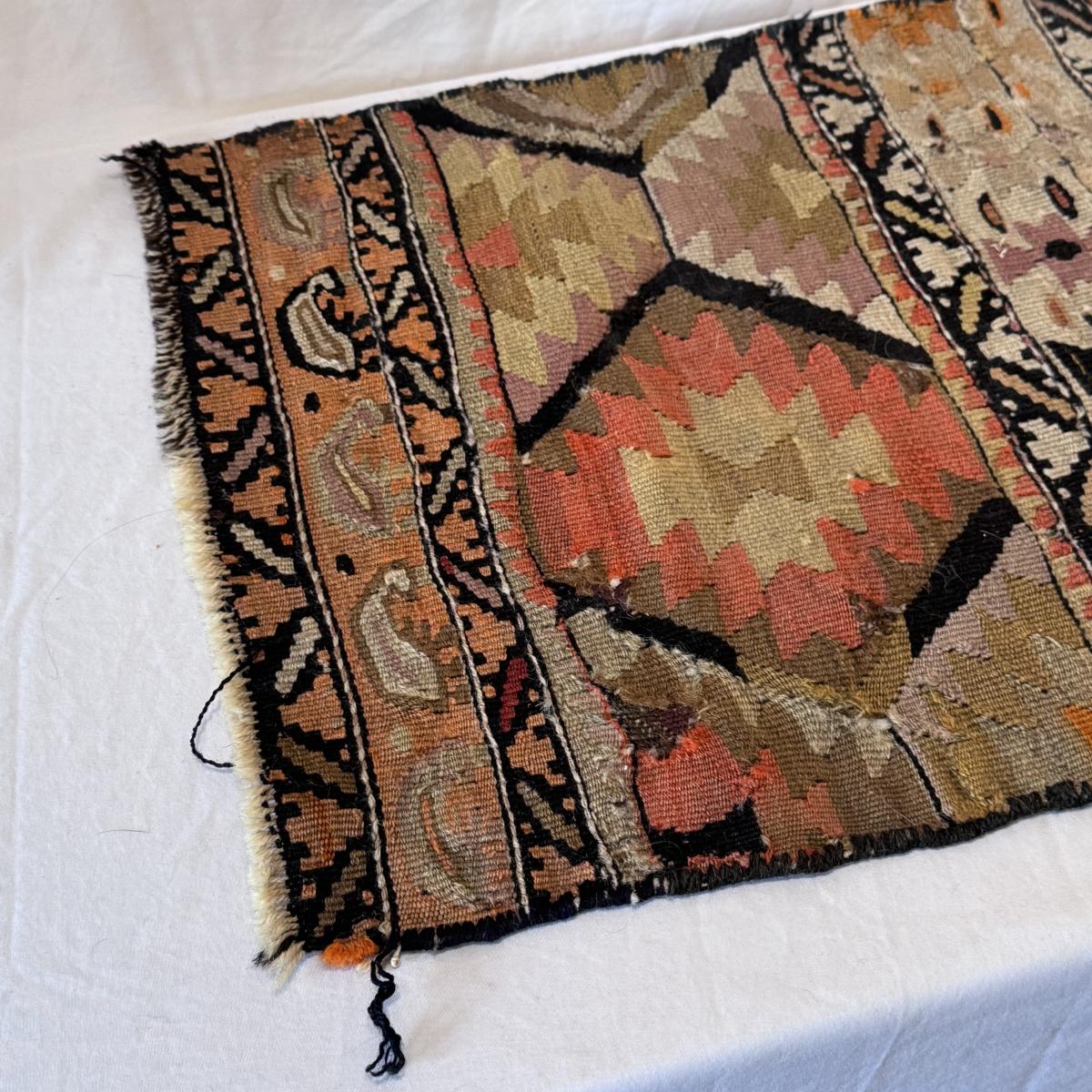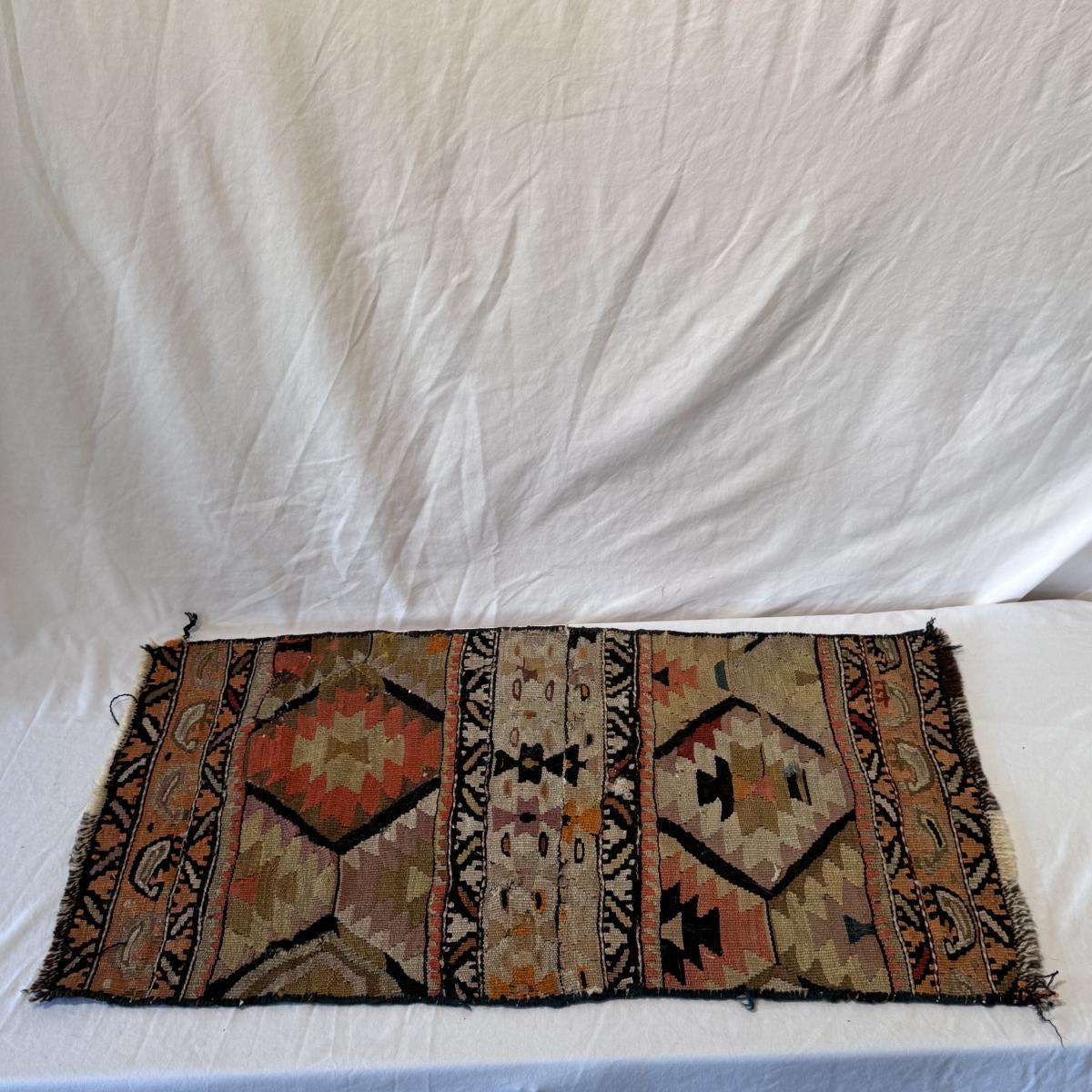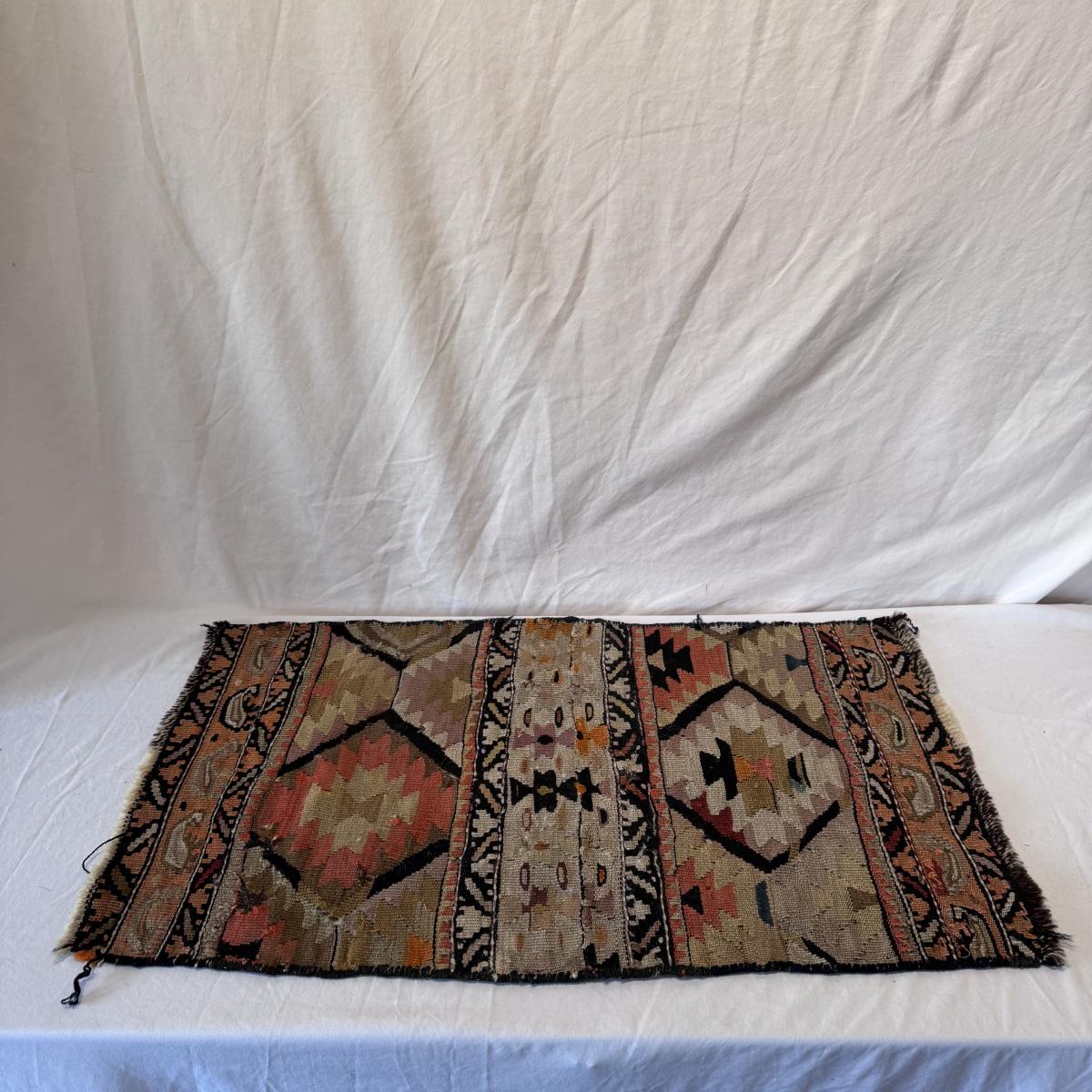 This lot includes one Kilim style door mat and two Temari balls. The Kilim style door mat has some fraying on the ends. It measures 30” x 16.5”H. The Temari balls are traditional Japanese woven balls appear to be handmade. Shipping available.