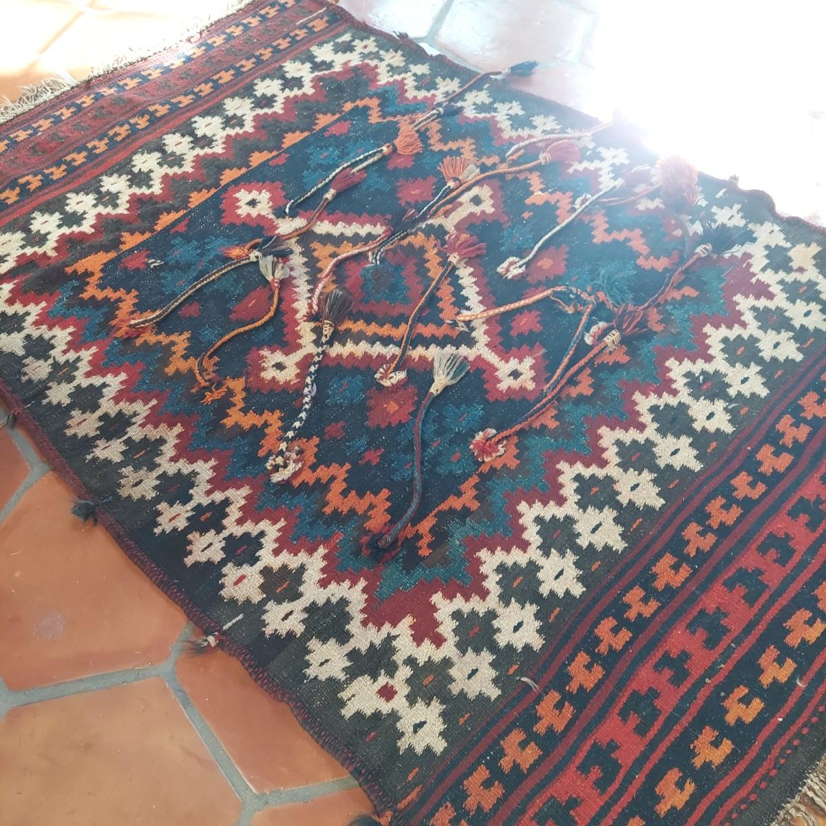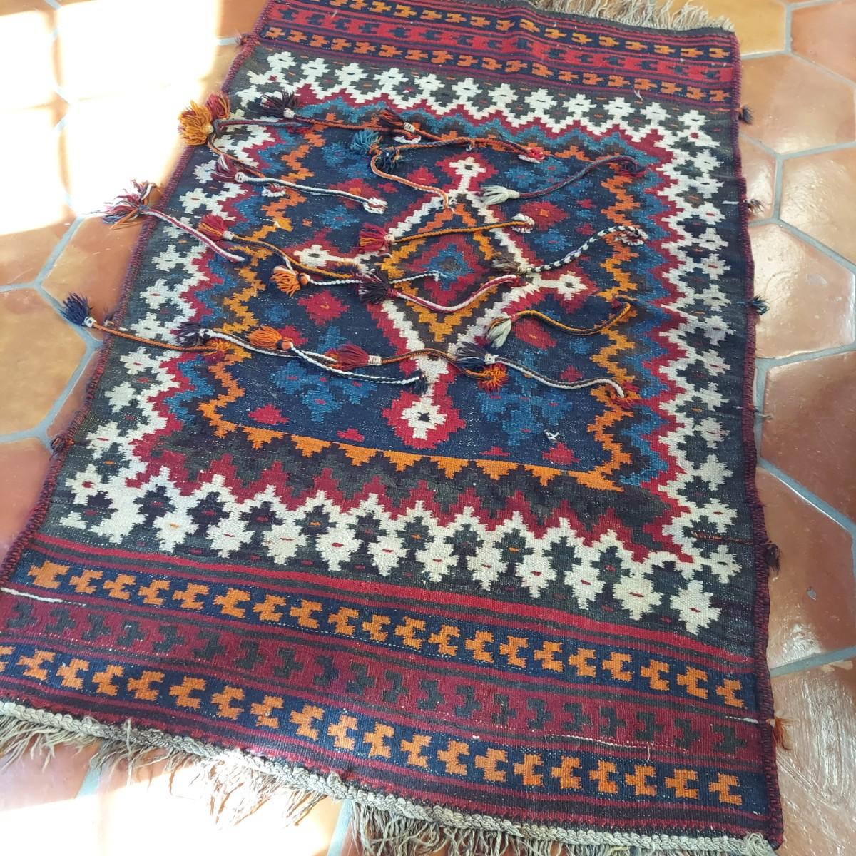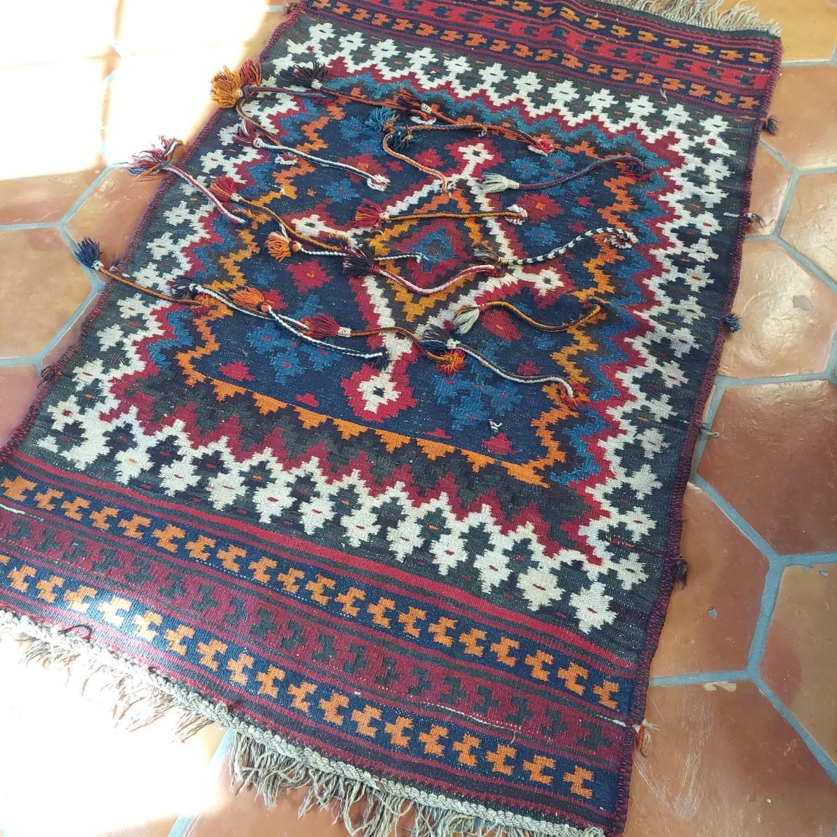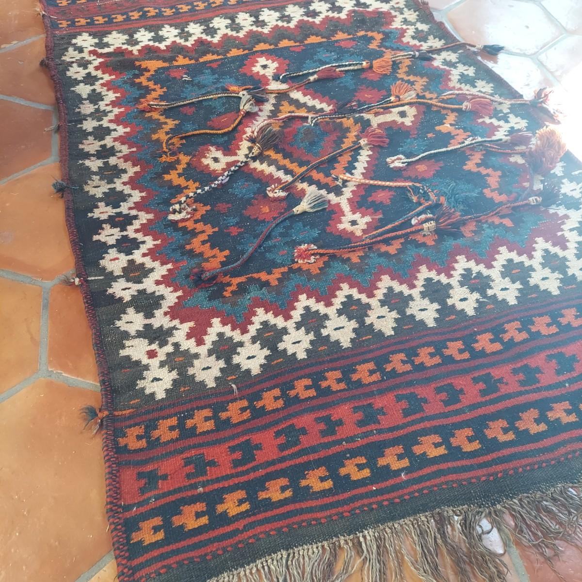 Beautiful Kilim style woven tapestry or prayer rug that appears to be made from natural fibers. It measures approximately 70” x 40” including the fringe. Some irregularities due to being hand made. Please see photos for details. Shipping available.