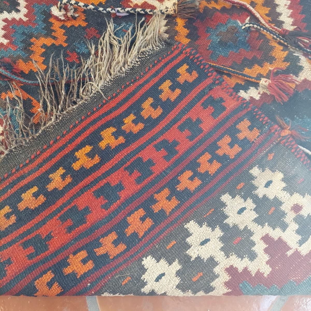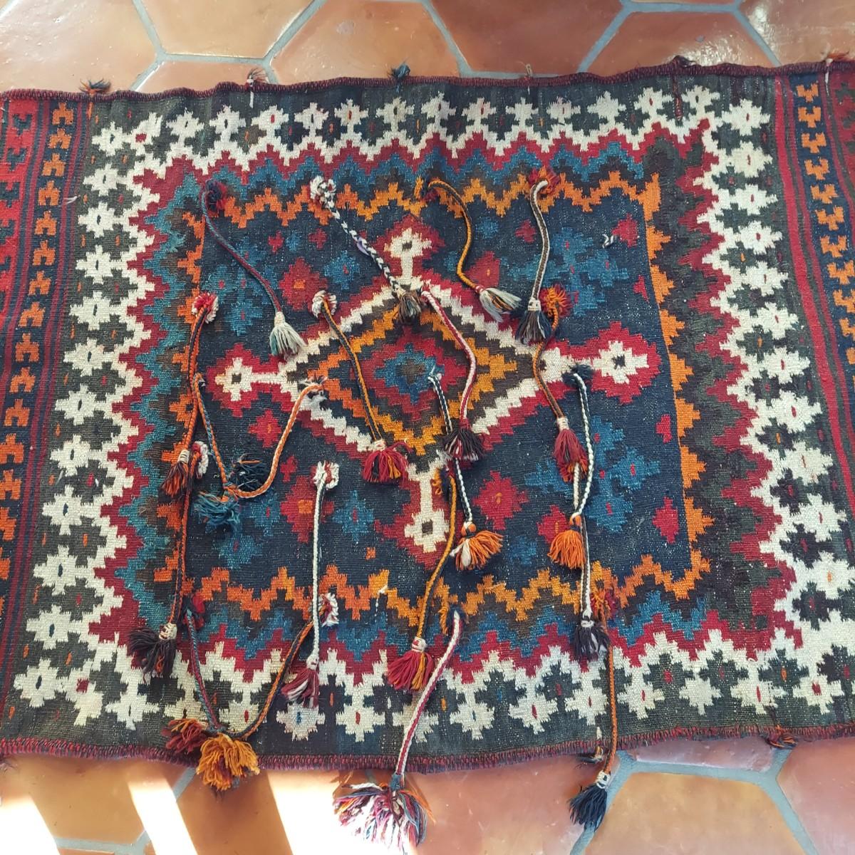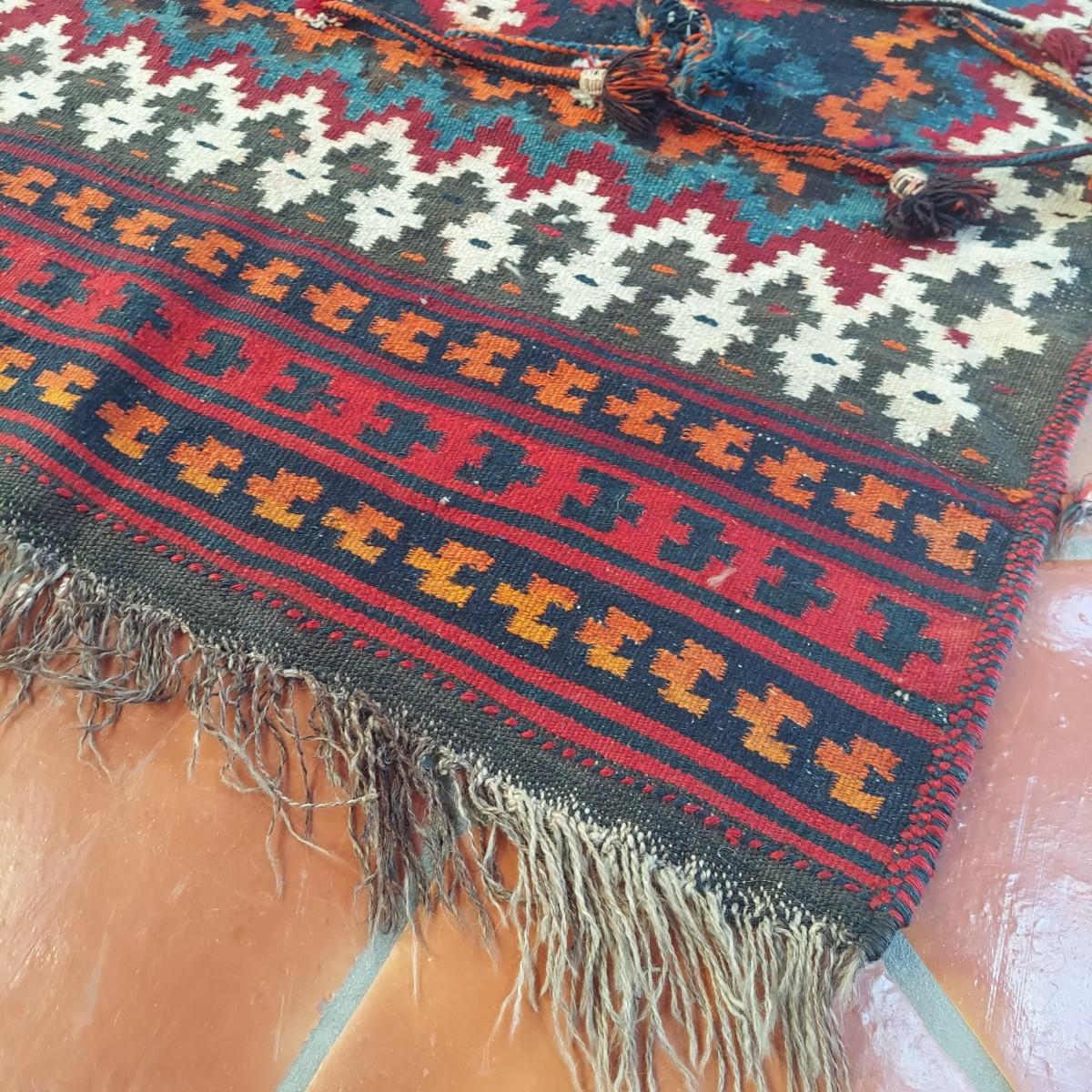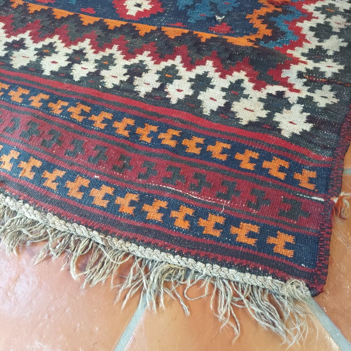 Beautiful Kilim style woven tapestry or prayer rug that appears to be made from natural fibers. It measures approximately 70” x 40” including the fringe. Some irregularities due to being hand made. Please see photos for details. Shipping available.