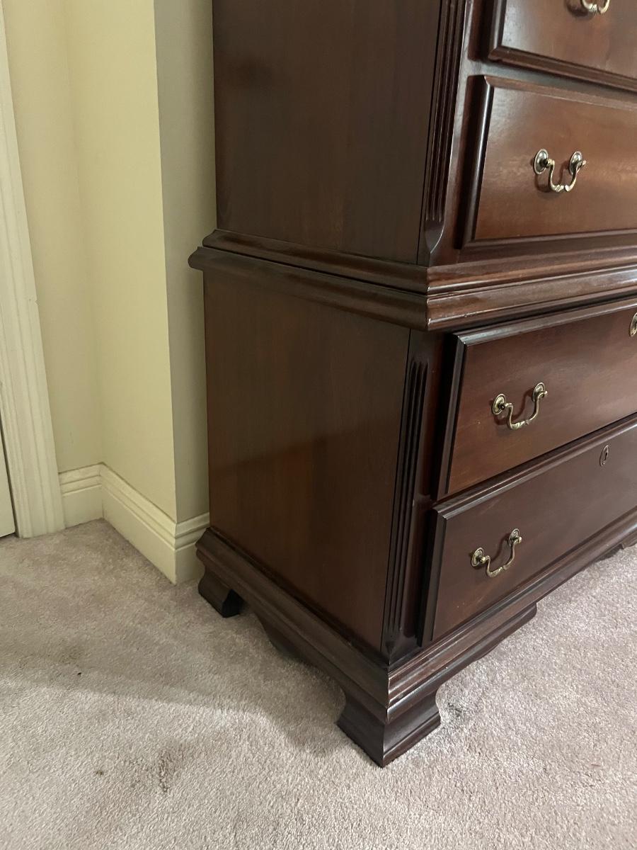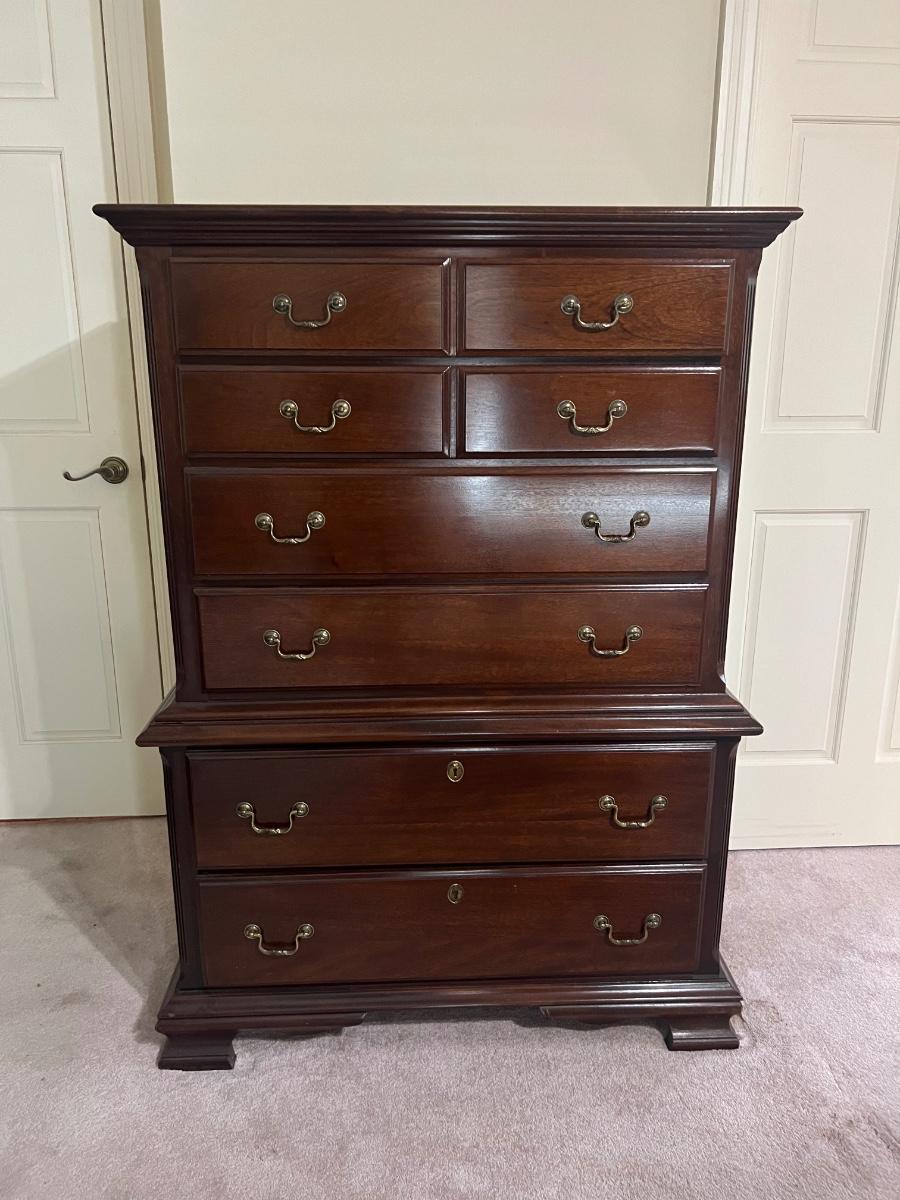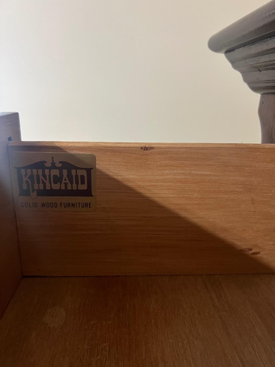 6 drawer solid wood KINCAID Chest On Chest Of Drawer. Measures 54 inches tall, 38 inches wide and 18 inches deep. This piece does match the dresser & night stand lot sold separately. Note there was repair to the back leg of the dresser. See pictures.