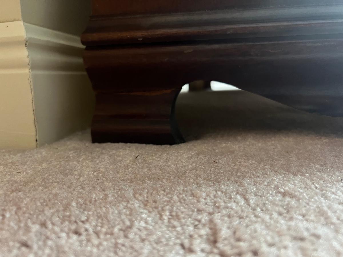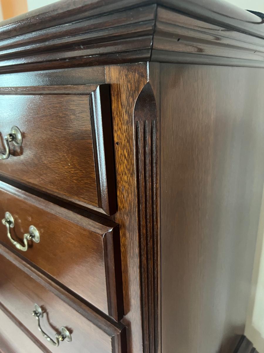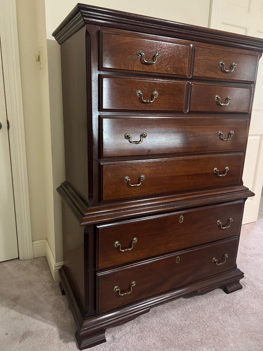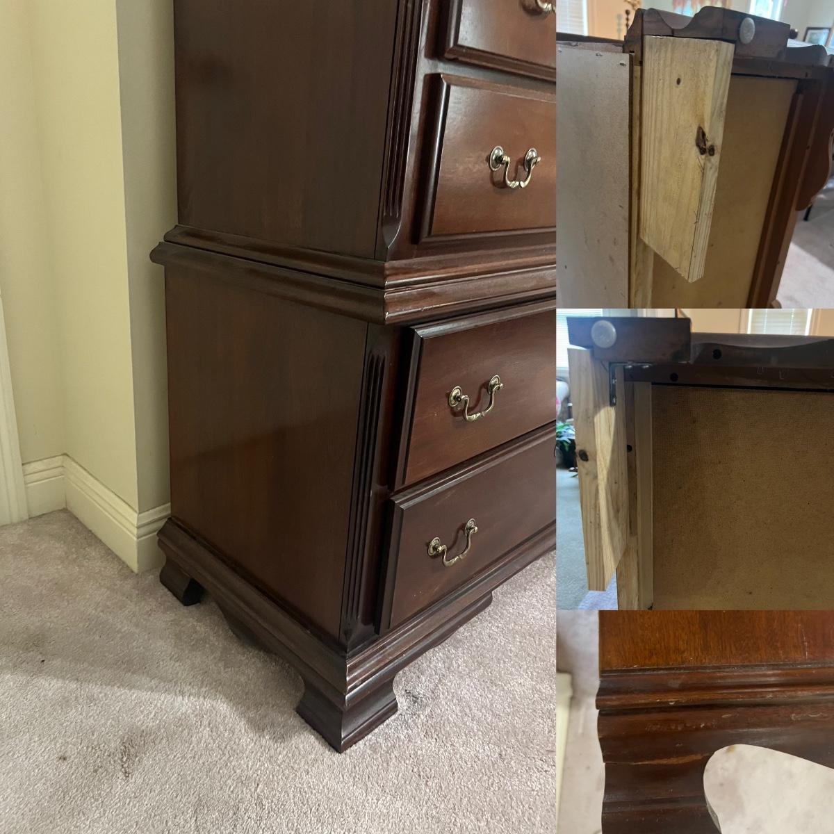 6 drawer solid wood KINCAID Chest On Chest Of Drawer. Measures 54 inches tall, 38 inches wide and 18 inches deep. This piece does match the dresser & night stand lot sold separately. Note there was repair to the back leg of the dresser. See pictures.