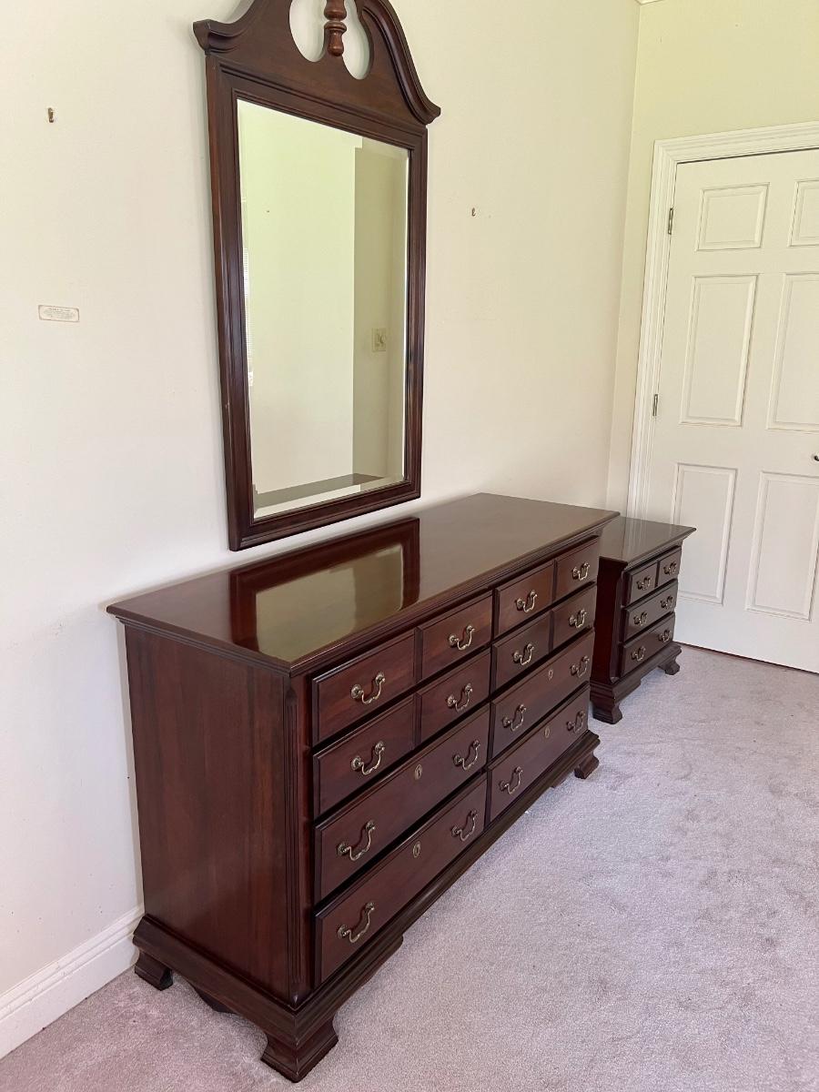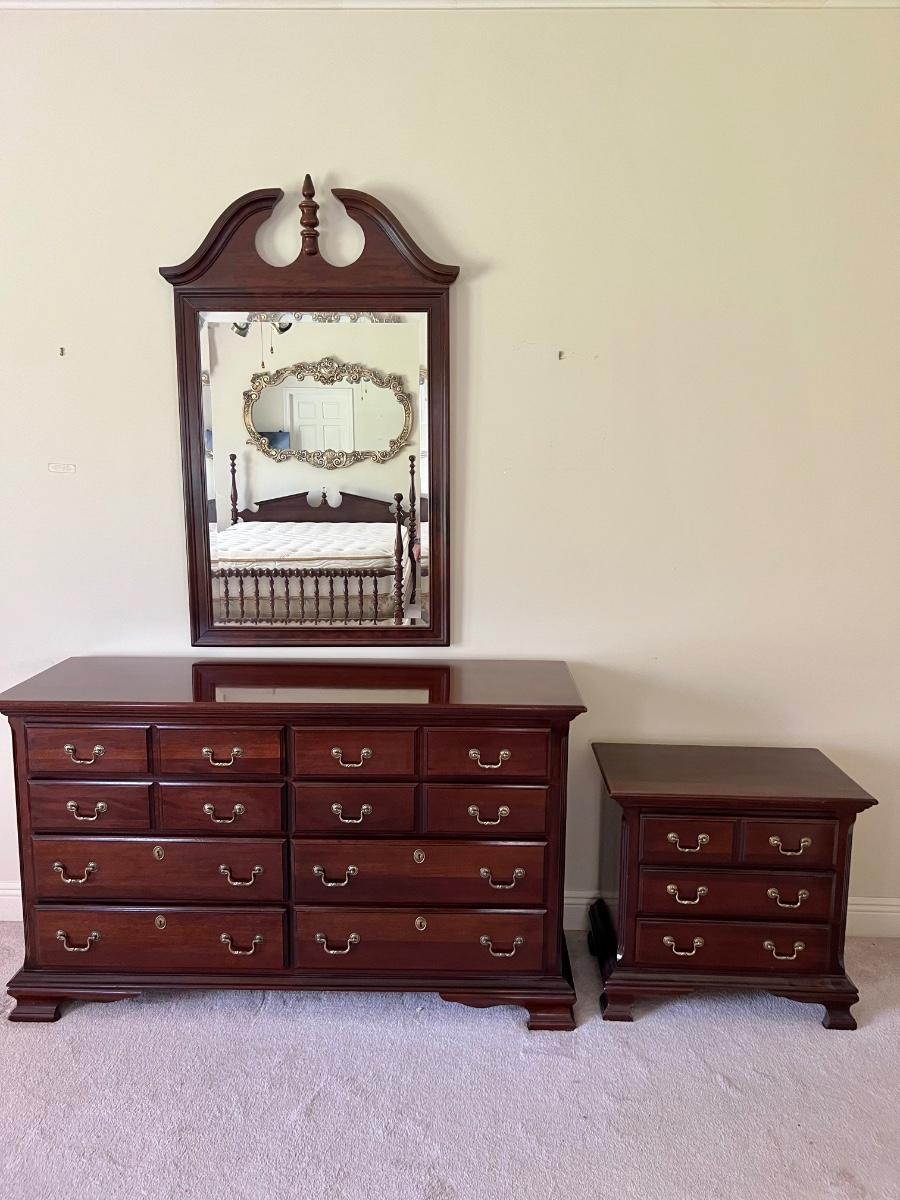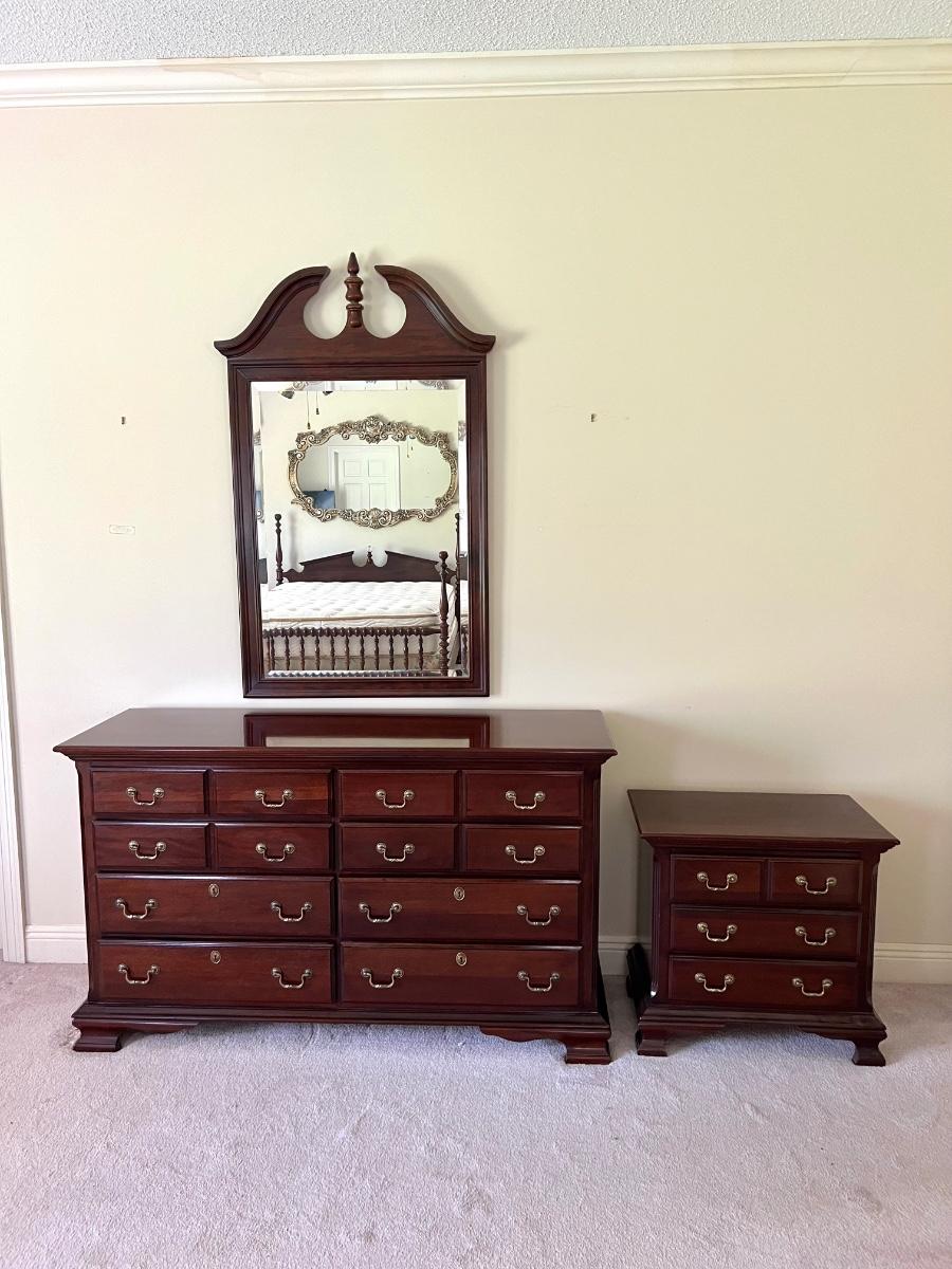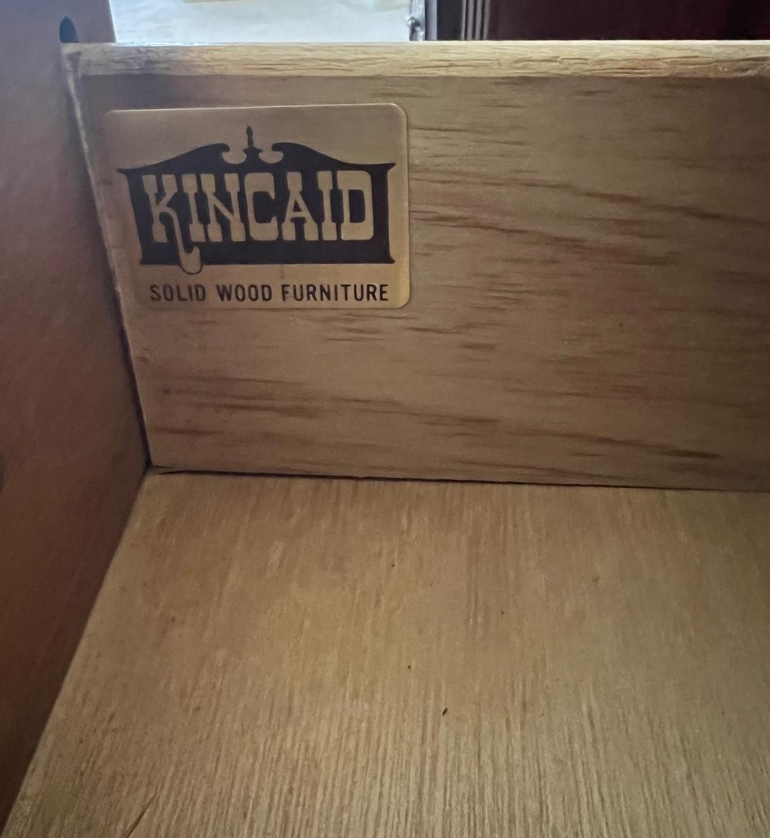 KINCAID Dresser & Night Stand 8 drawer KINCAID solid wood dresser and mirror. Dresser measures 34 inches tall, 58 inches long and 19 inches deep. Mirror measures 52 inches tall and 30 inches wide. Matching 3 drawer night stand. Nightstand measures 24 inches tall 26 inches wide and 16 inches deep.