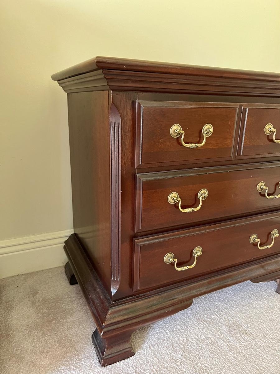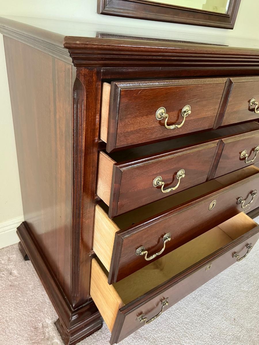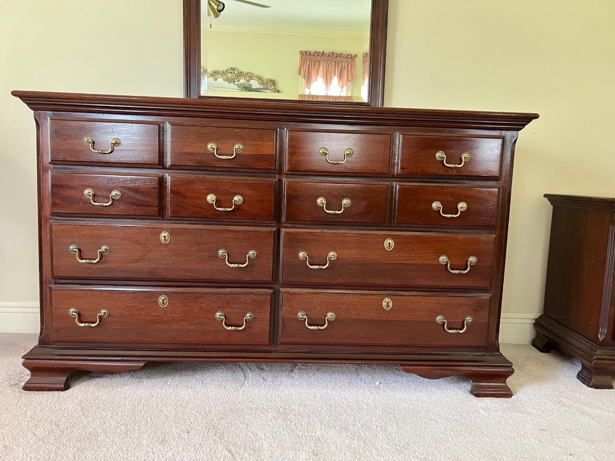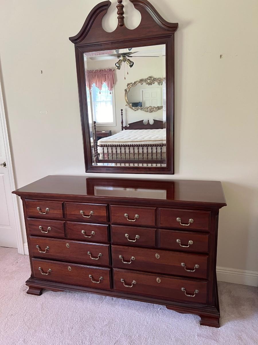 KINCAID Dresser & Night Stand 8 drawer KINCAID solid wood dresser and mirror. Dresser measures 34 inches tall, 58 inches long and 19 inches deep. Mirror measures 52 inches tall and 30 inches wide. Matching 3 drawer night stand. Nightstand measures 24 inches tall 26 inches wide and 16 inches deep.