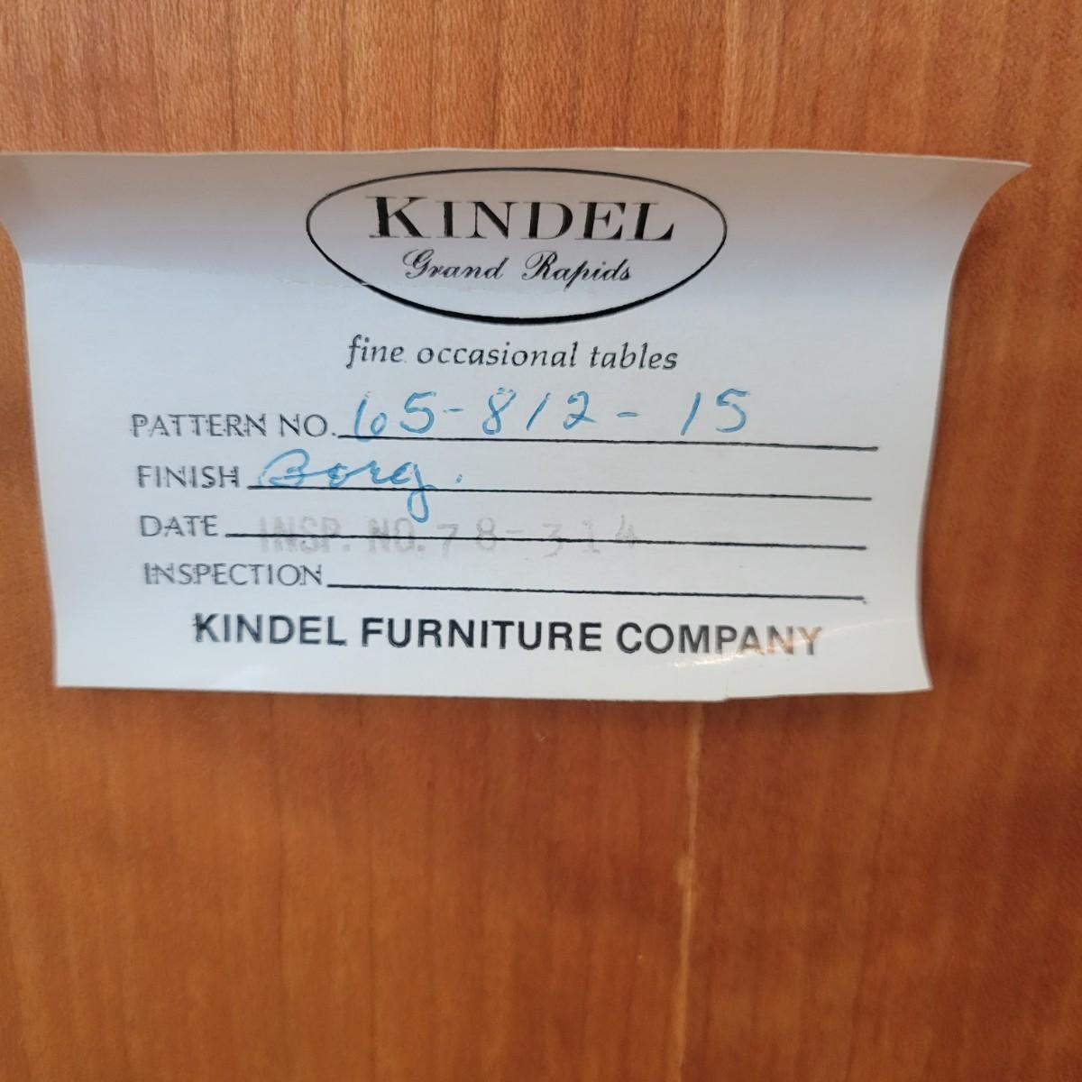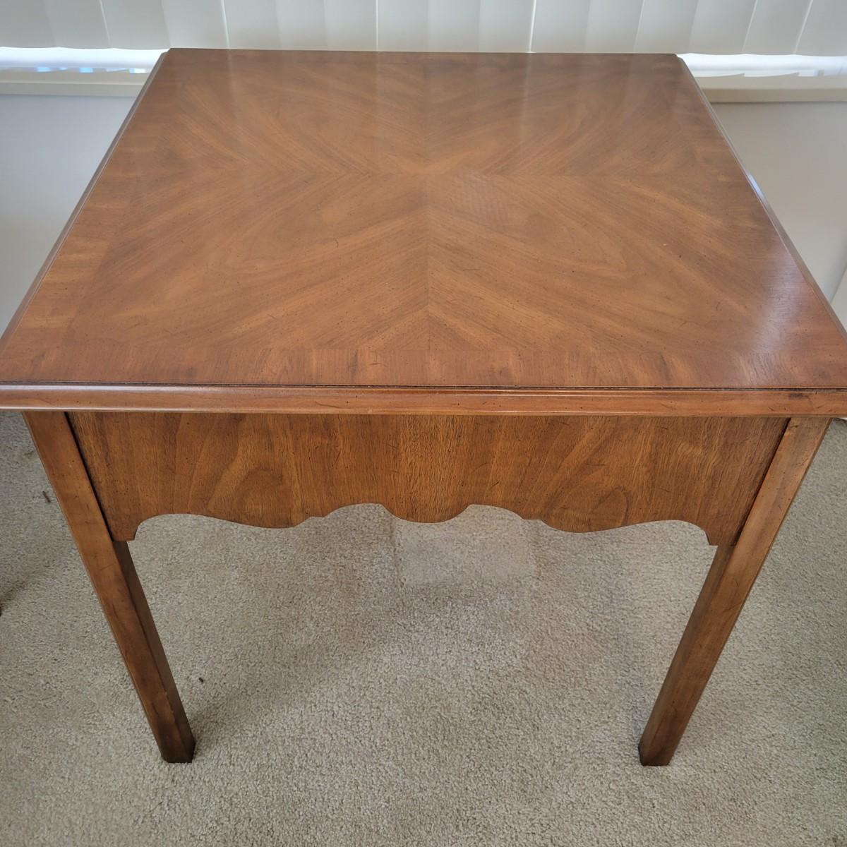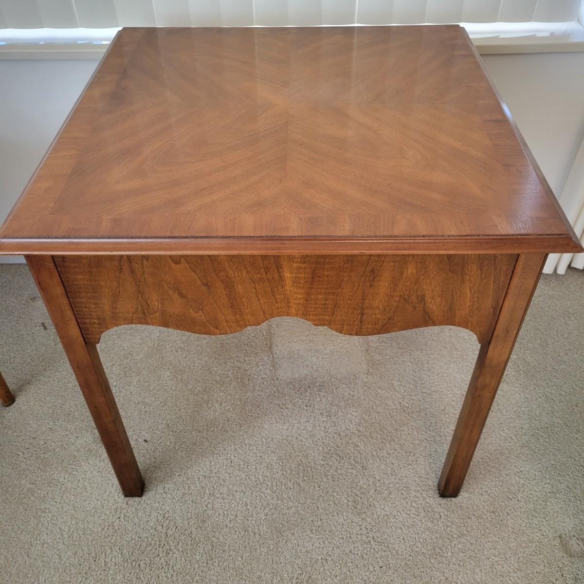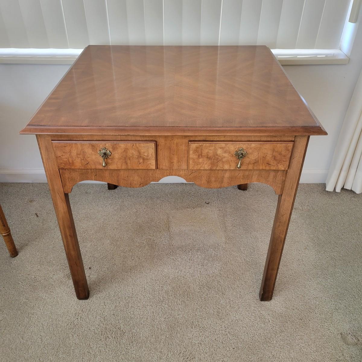 A Kindel Furniture Co. solid wood side table. This table features two dovetailed drawers with brass hardware. It measures approximately 26" x 26" x 24.5"H. Local pickup only.
