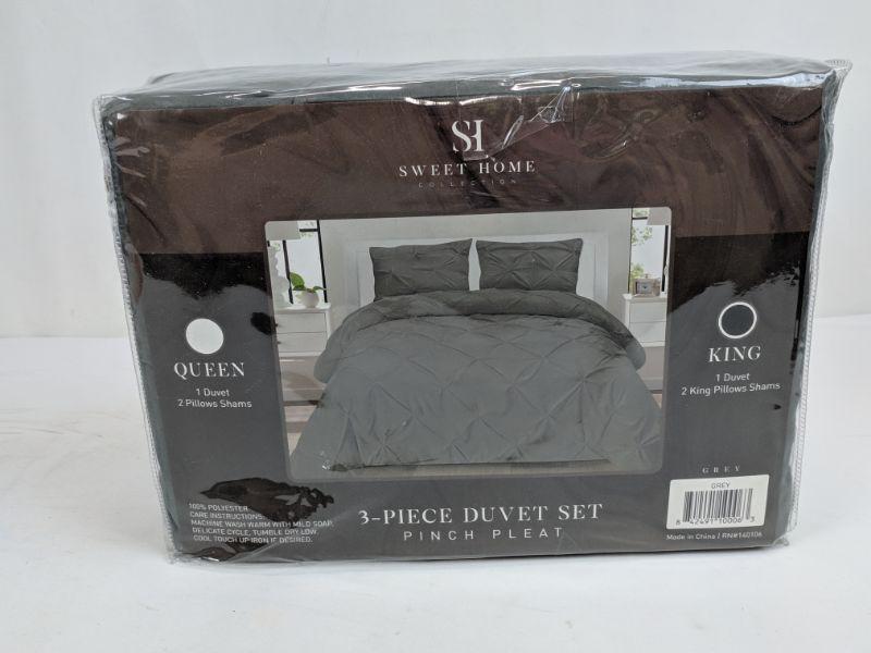 King 3 PC Grey Pinch Pleat Duvet Set, 1 Duvet & 2 King Pillow Shams - New