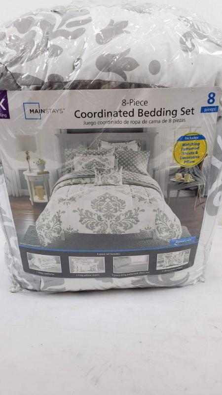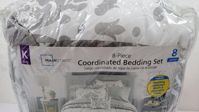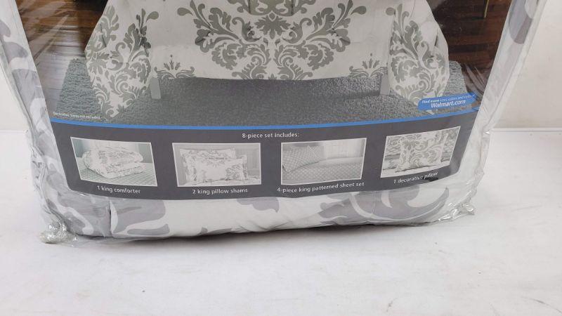 King 8 Piece Coordinating Bed Set, Gray/White Classic Noir- New