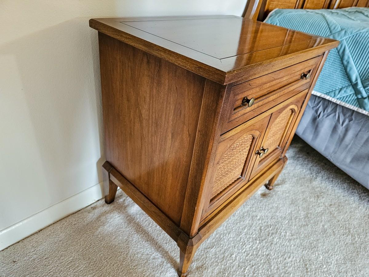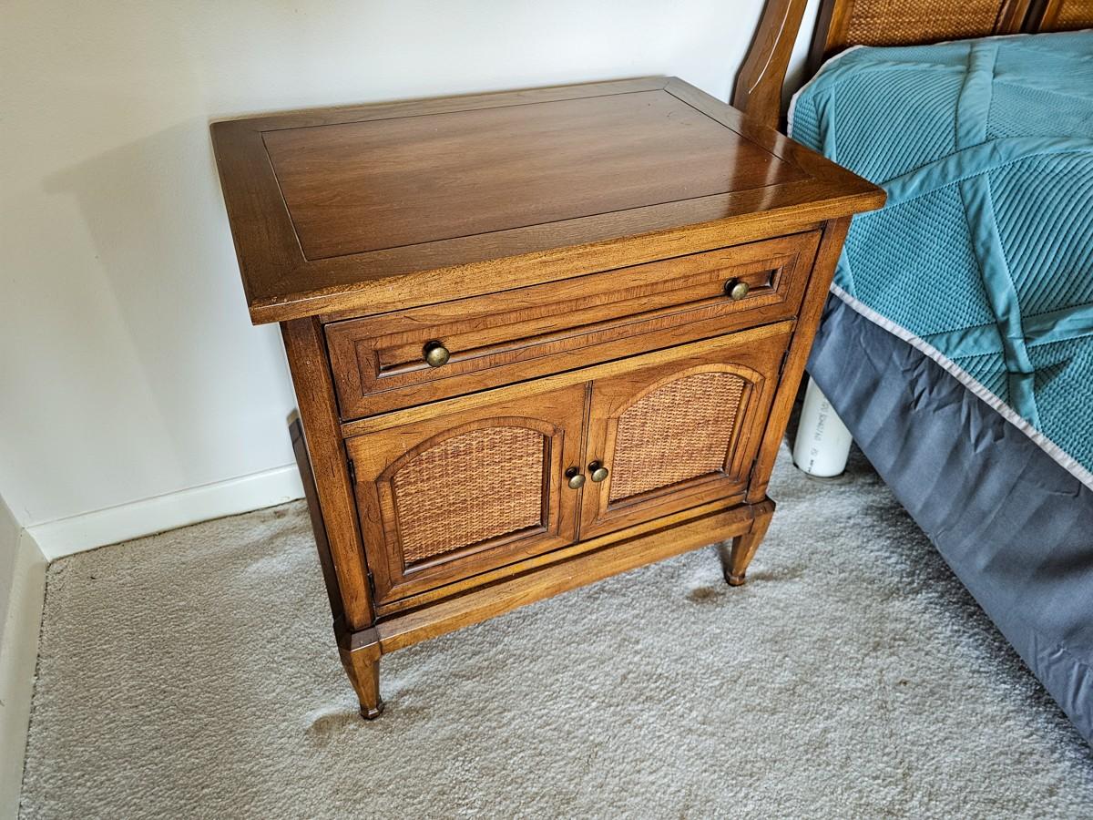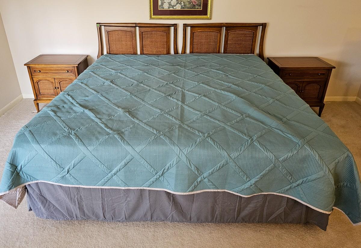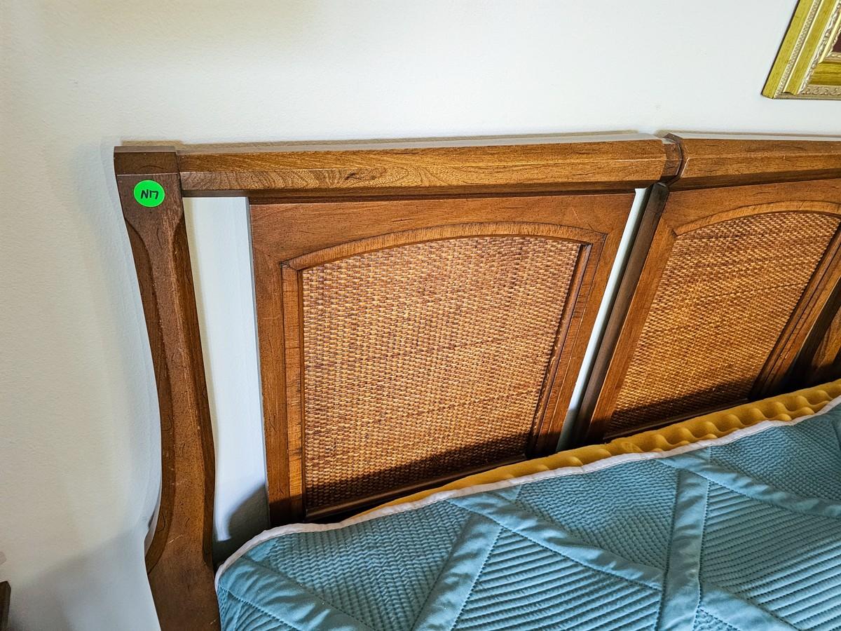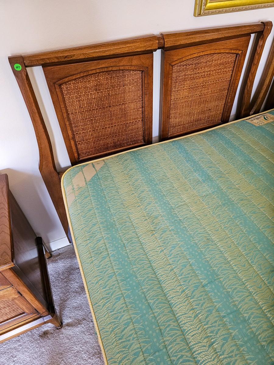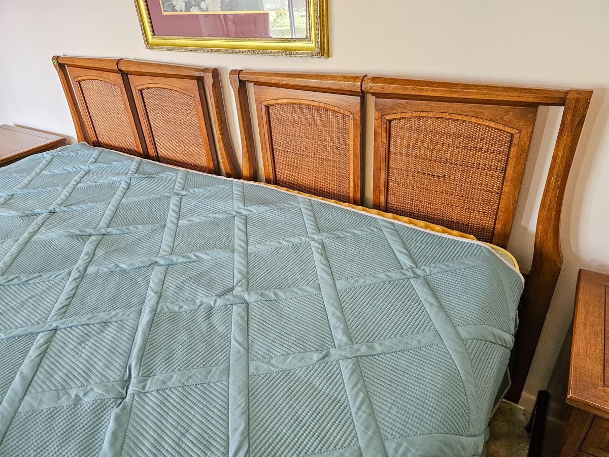 Vintage king headboard and pair of nightstands by White Furniture Company. Mattress and box springs, bedding included. (If you do not wish to take the mattress and box springs, you may leave them in the house)