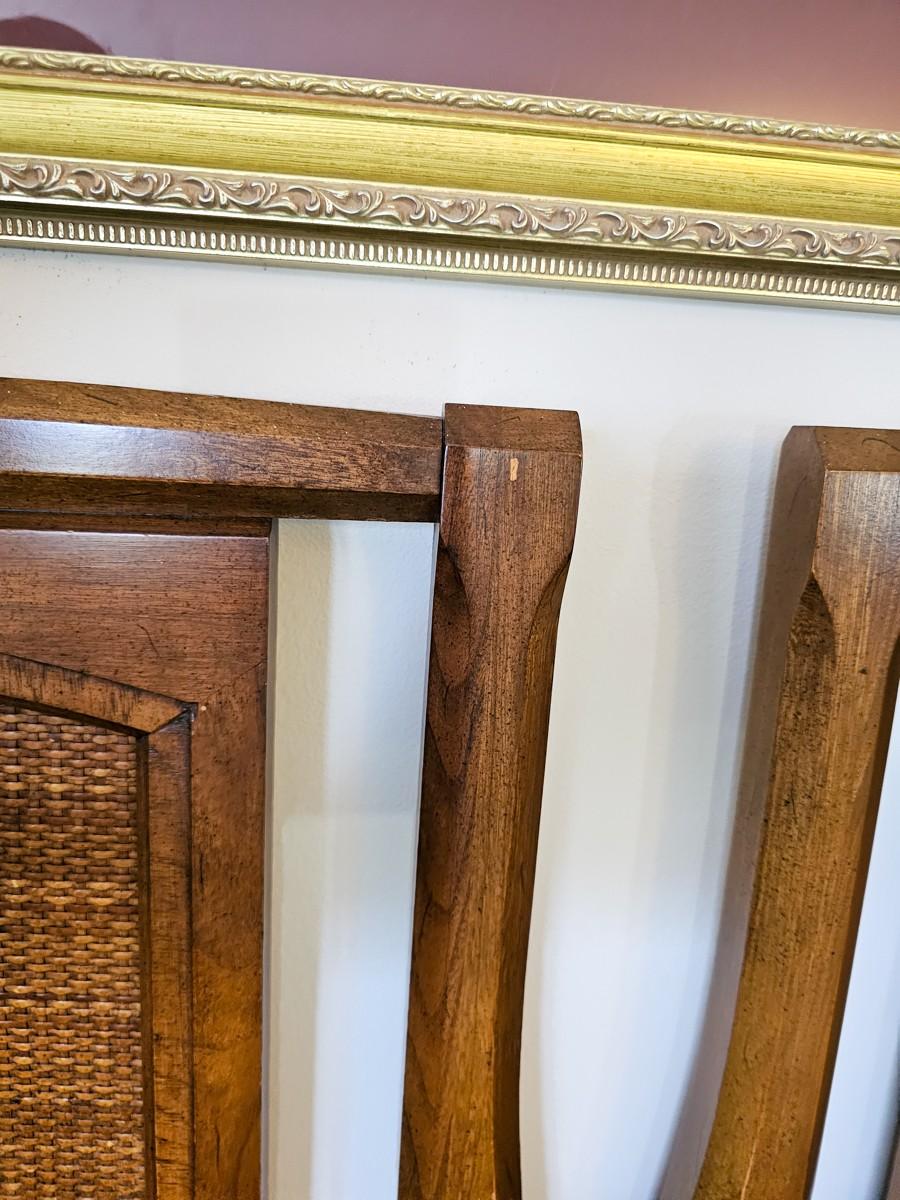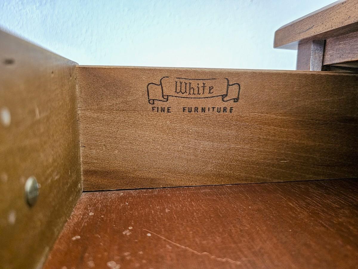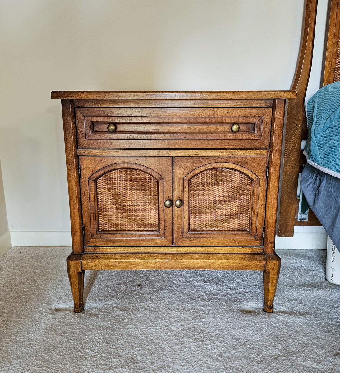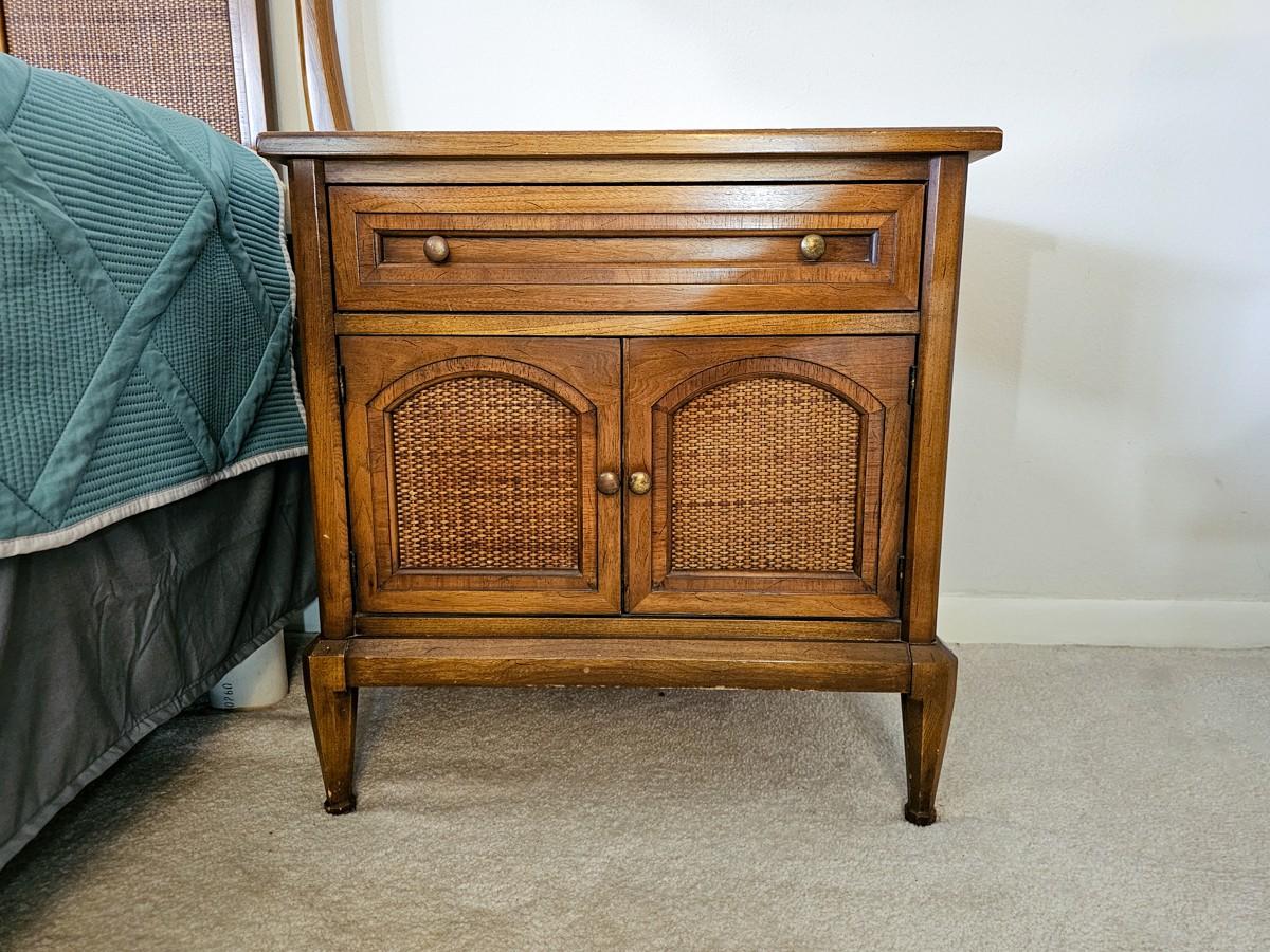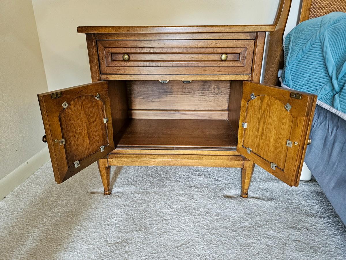 Vintage king headboard and pair of nightstands by White Furniture Company. Mattress and box springs, bedding included. (If you do not wish to take the mattress and box springs, you may leave them in the house)