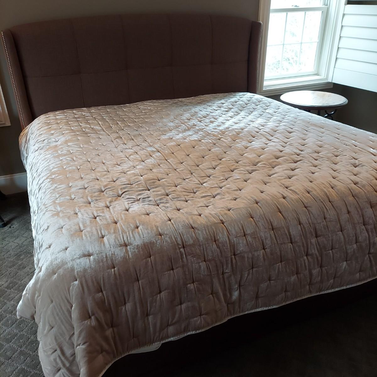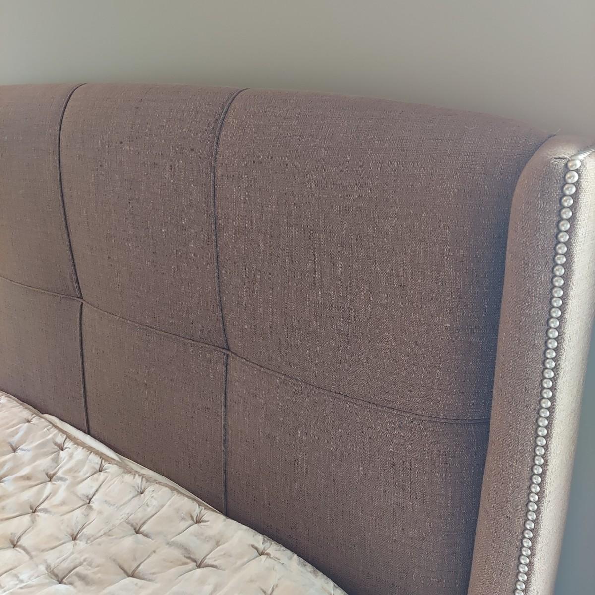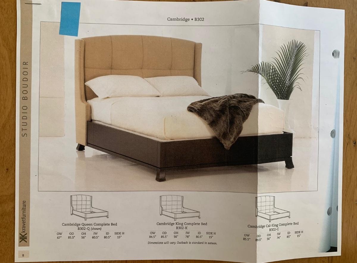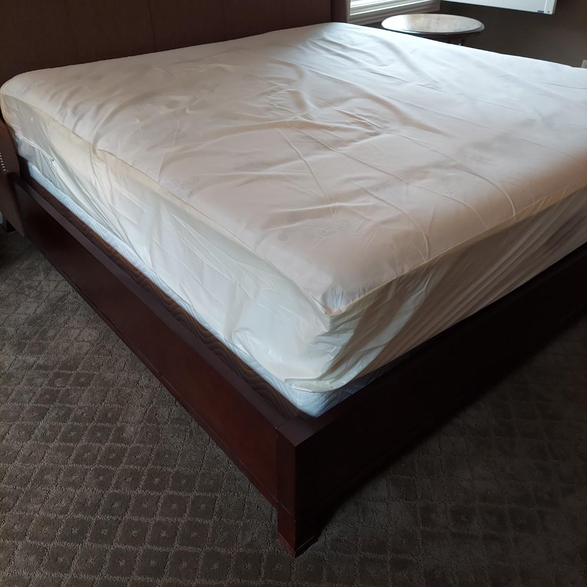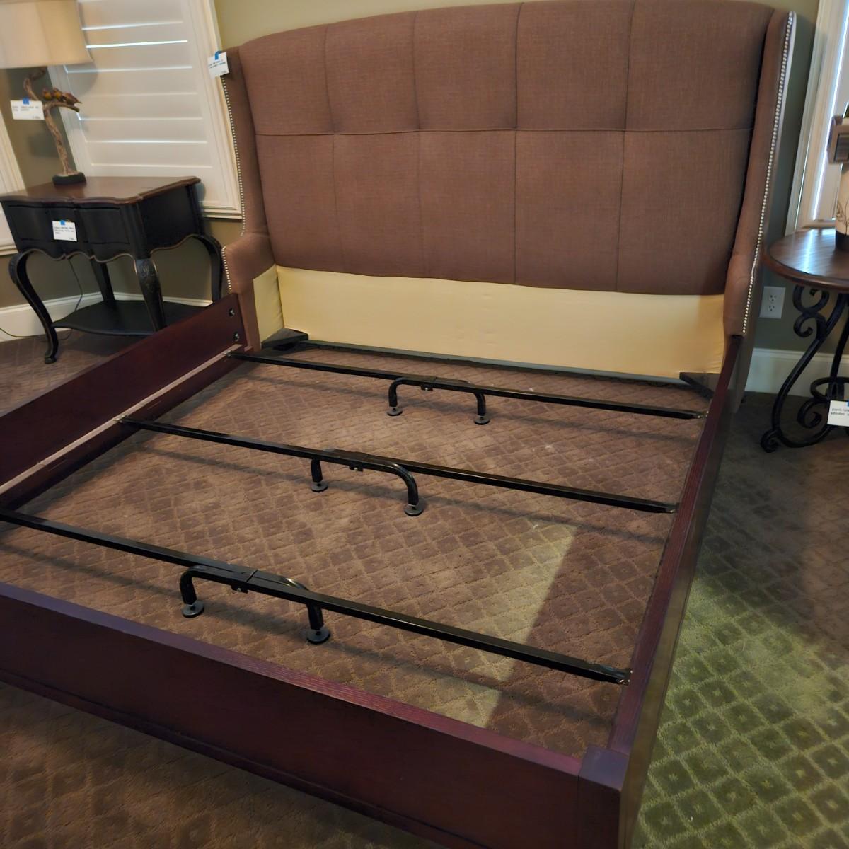 Cambridge by Kavat king size wooden bed frame with upholstered headboard. Frame measures 85” x 86”. With Simmons Beautyrest Black Luxury Collection mattress and box spring. The mattress and box spring are available to the winning bidder if desired, but the winning bidder is not required to take them. Blankets and bedding are not included in this lot. Winning bidder will need to bring wrenches to disassemble the bed.