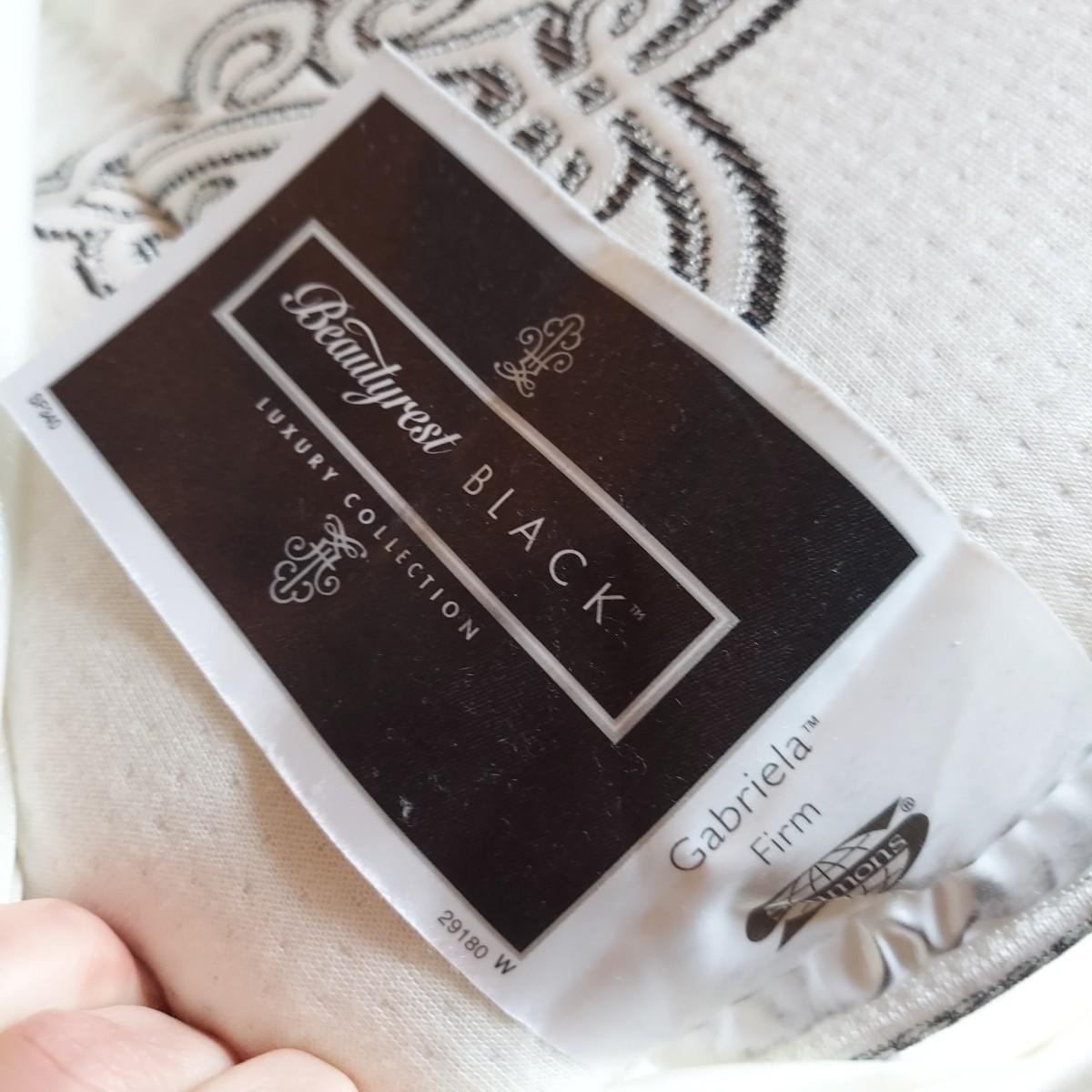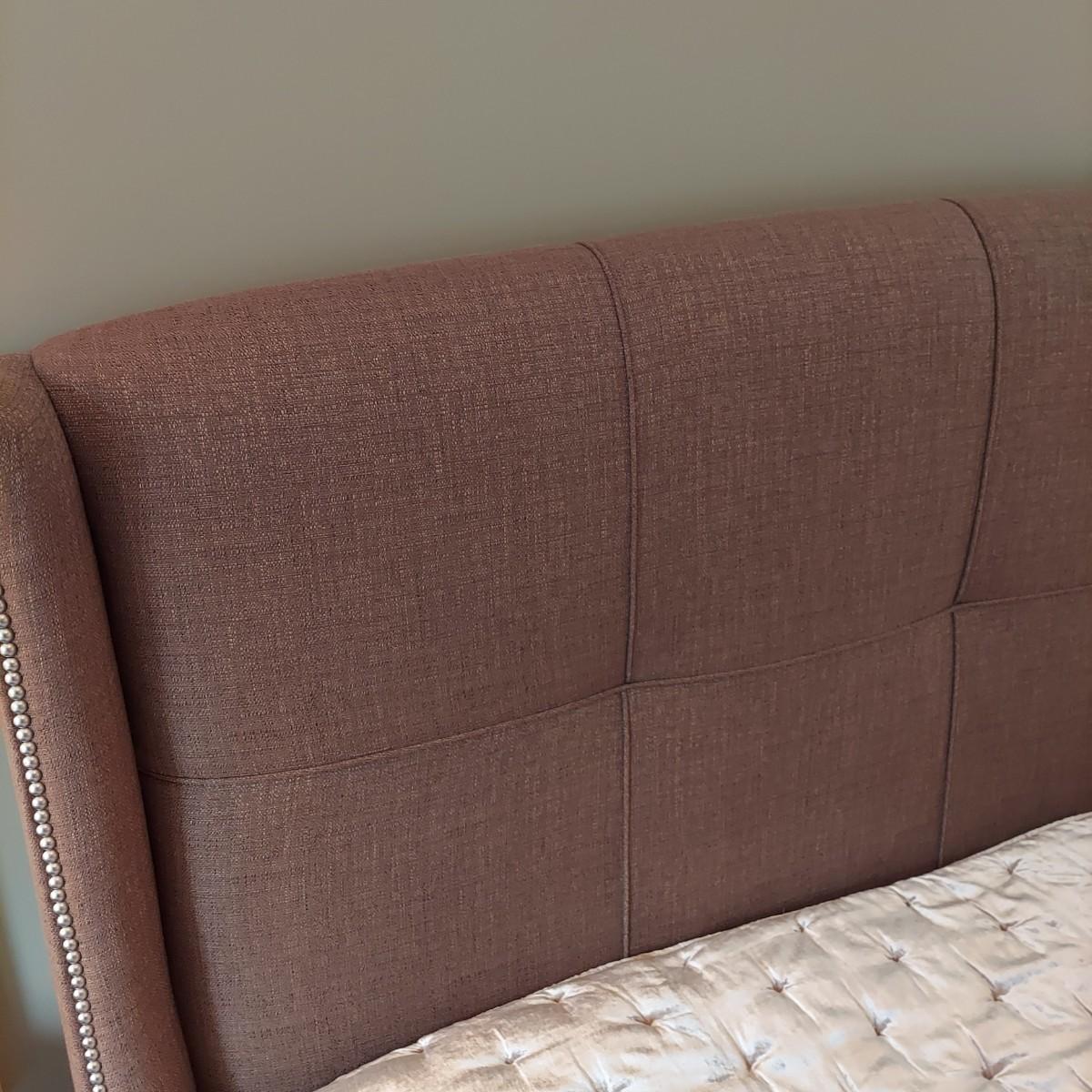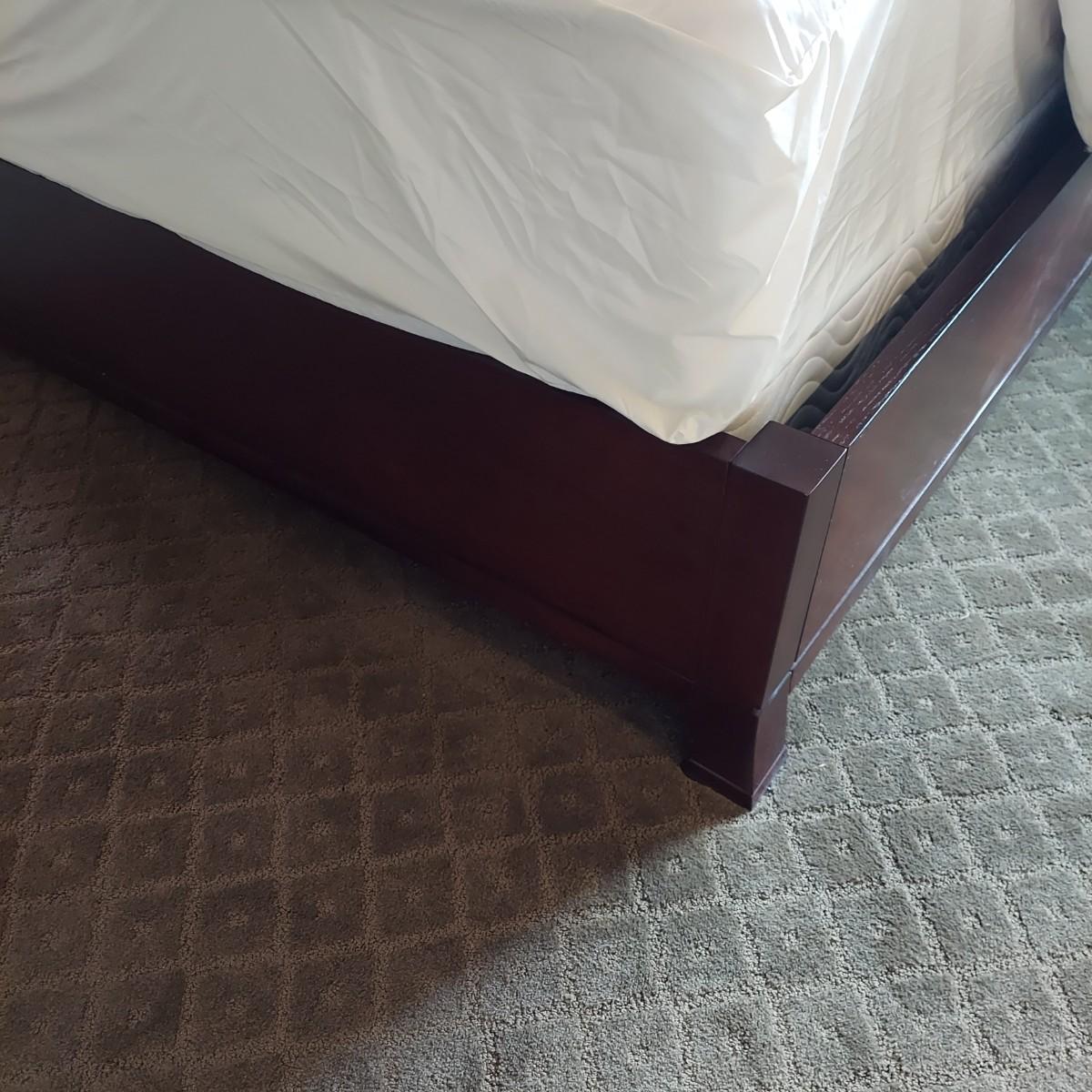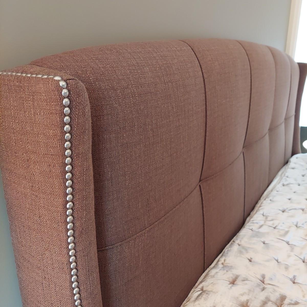 Cambridge by Kavat king size wooden bed frame with upholstered headboard. Frame measures 85” x 86”. With Simmons Beautyrest Black Luxury Collection mattress and box spring. The mattress and box spring are available to the winning bidder if desired, but the winning bidder is not required to take them. Blankets and bedding are not included in this lot. Winning bidder will need to bring wrenches to disassemble the bed.