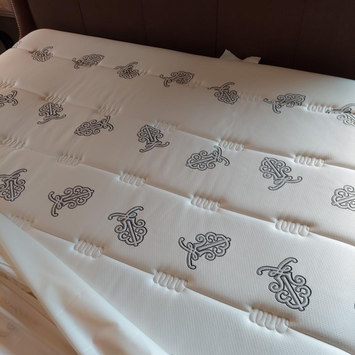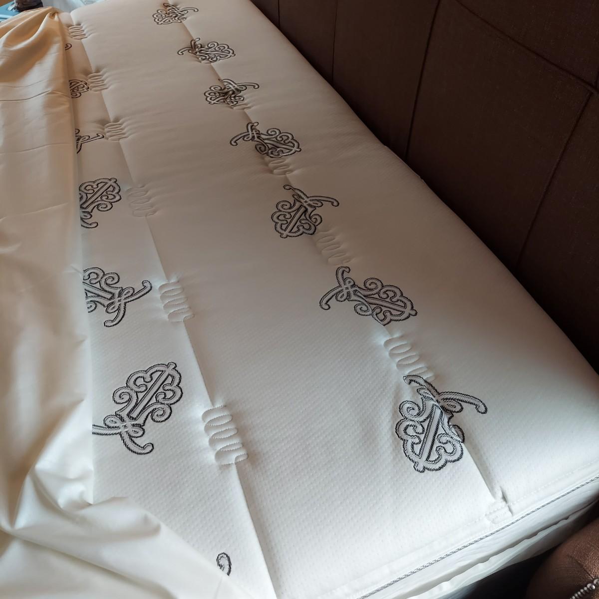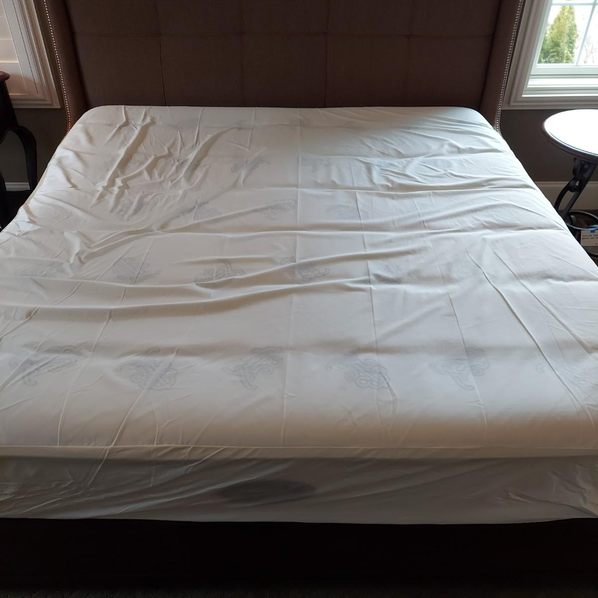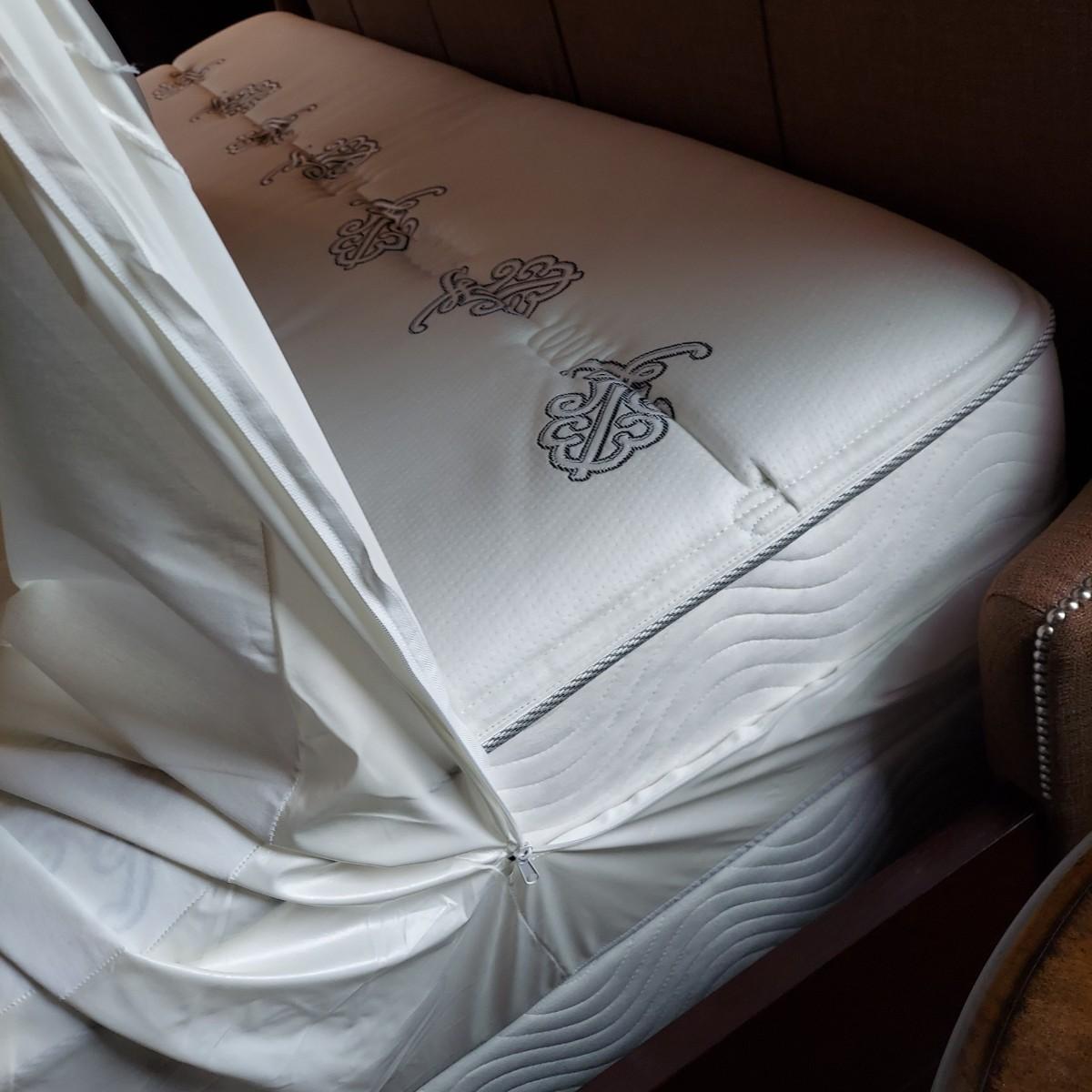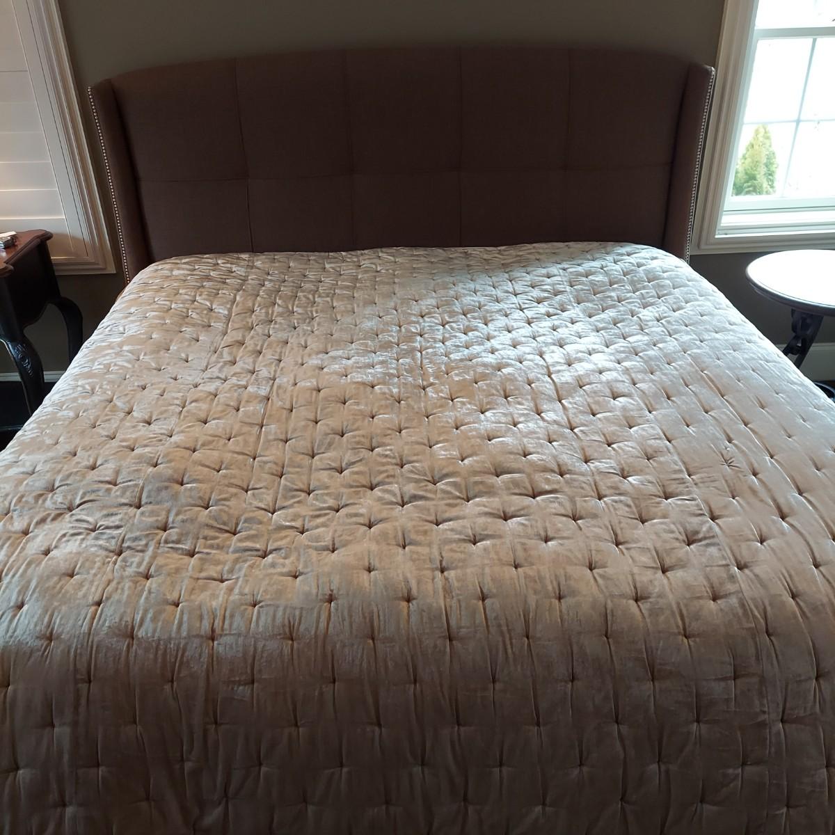 Cambridge by Kavat king size wooden bed frame with upholstered headboard. Frame measures 85” x 86”. With Simmons Beautyrest Black Luxury Collection mattress and box spring. The mattress and box spring are available to the winning bidder if desired, but the winning bidder is not required to take them. Blankets and bedding are not included in this lot. Winning bidder will need to bring wrenches to disassemble the bed.