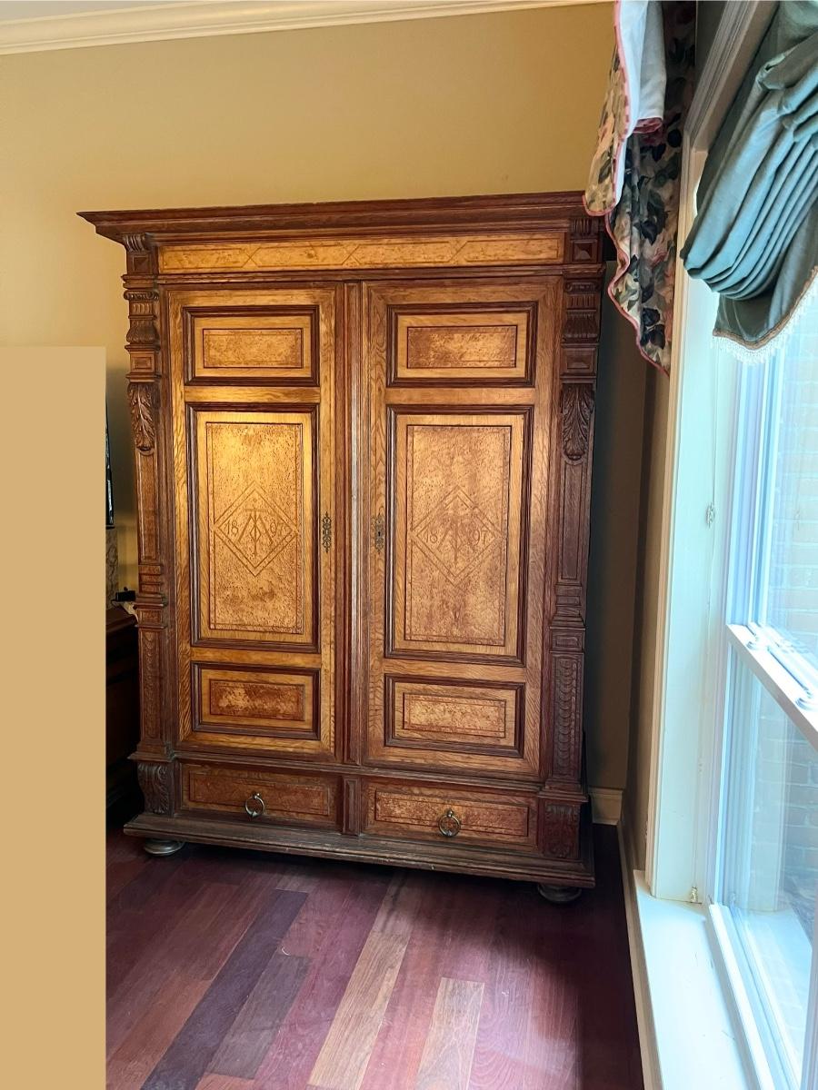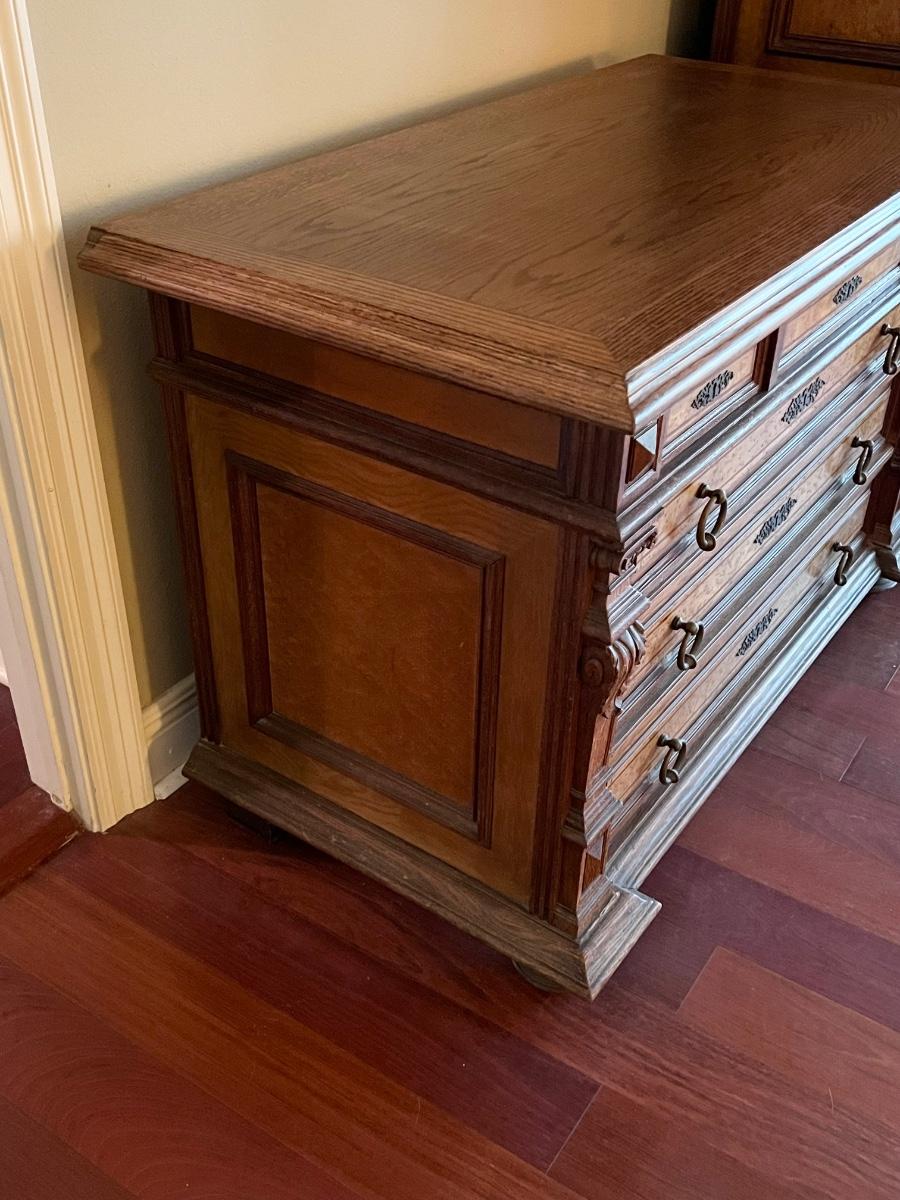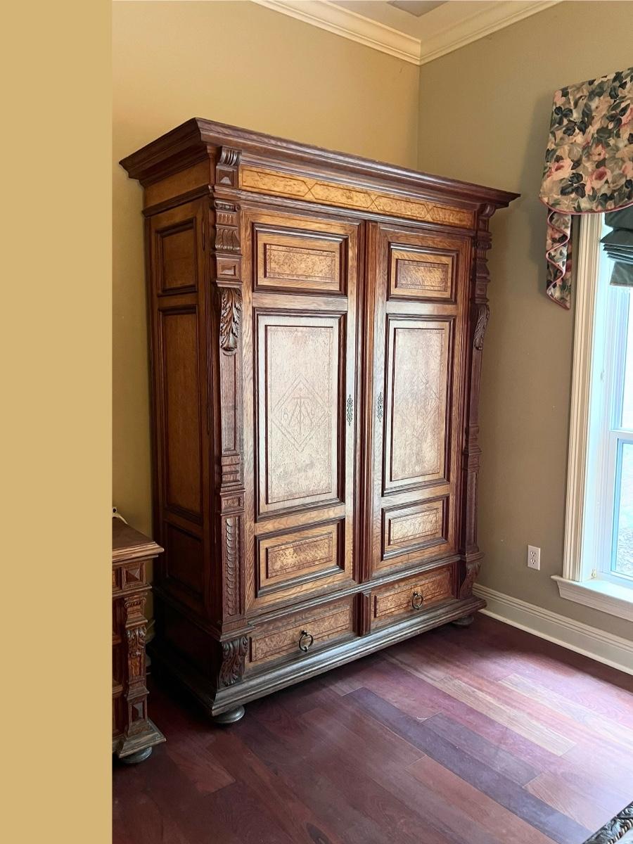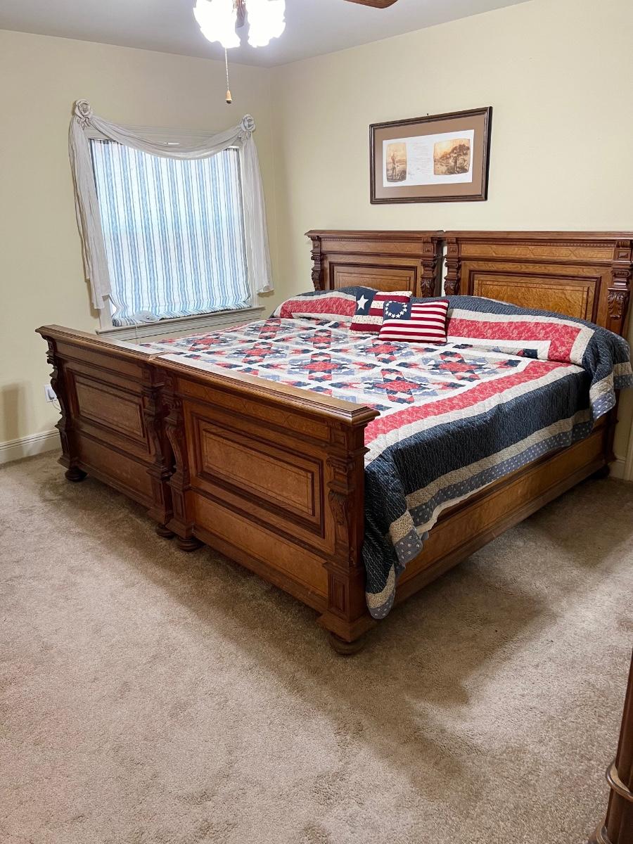Owner is using 2 twin beds as a king bed, however it can be split into 2 twin beds ~ There is a board underneath the mattress to hold the king size mattress ~ **Does not have the mattress planks for twin beds ~ All drawers slide easy ~ Has marble tops on both nightstands ~ Armoire is missing bar for hanging clothes ~ 1 of the nightstands has wear & missing a drawer knob, see photos ~ Dresser top is not original to the piece, a top was made for the dresser, top is removable, see photos ~ Mattress & bedding are not included ~ Headboard = 52” H ~ Armoire = 84” H x 66.5” W x 26.5” ~ 2 Nightstands = 30” H x 19” W x 18” D ~ Dresser = 31” H x 47” W x 24” D ~ Overall Great Condition