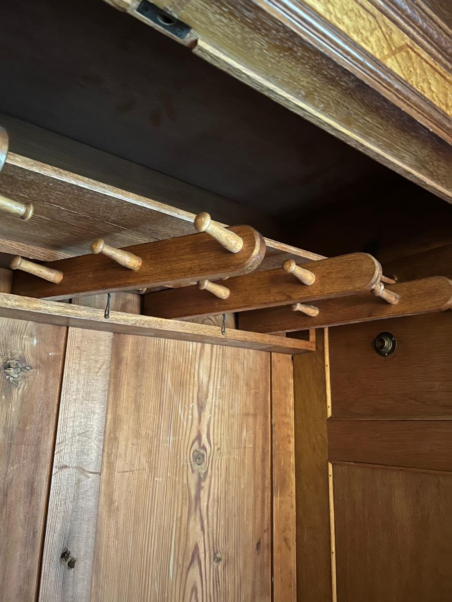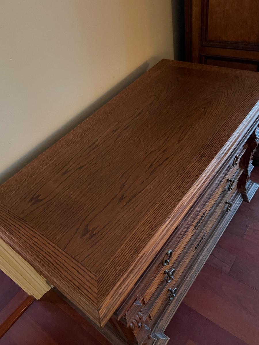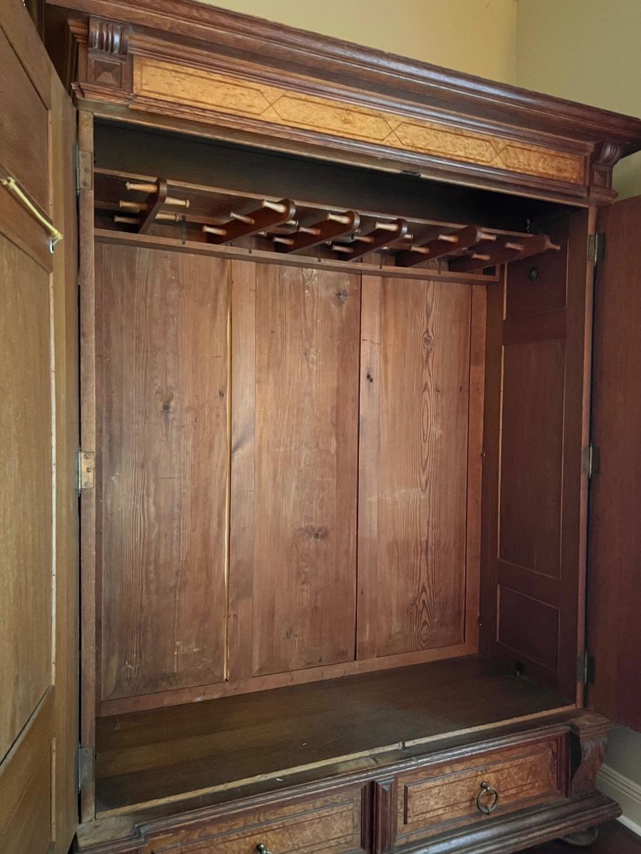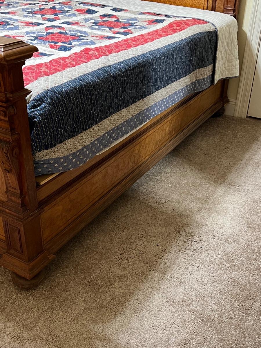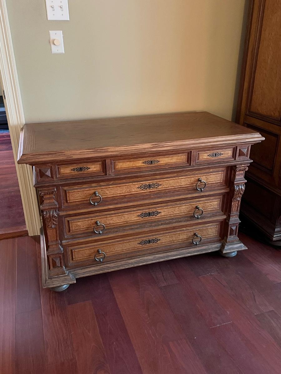 Owner is using 2 twin beds as a king bed, however it can be split into 2 twin beds ~ There is a board underneath the mattress to hold the king size mattress ~ **Does not have the mattress planks for twin beds ~ All drawers slide easy ~ Has marble tops on both nightstands ~ Armoire is missing bar for hanging clothes ~ 1 of the nightstands has wear & missing a drawer knob, see photos ~ Dresser top is not original to the piece, a top was made for the dresser, top is removable, see photos ~ Mattress & bedding are not included ~ Headboard = 52” H ~ Armoire = 84” H x 66.5” W x 26.5” ~ 2 Nightstands = 30” H x 19” W x 18” D ~ Dresser = 31” H x 47” W x 24” D ~ Overall Great Condition