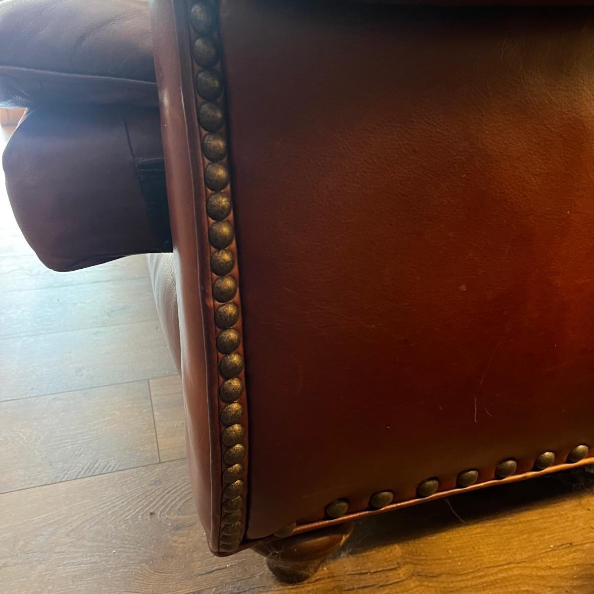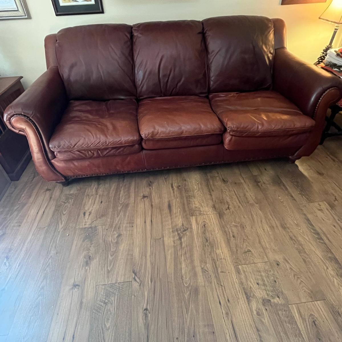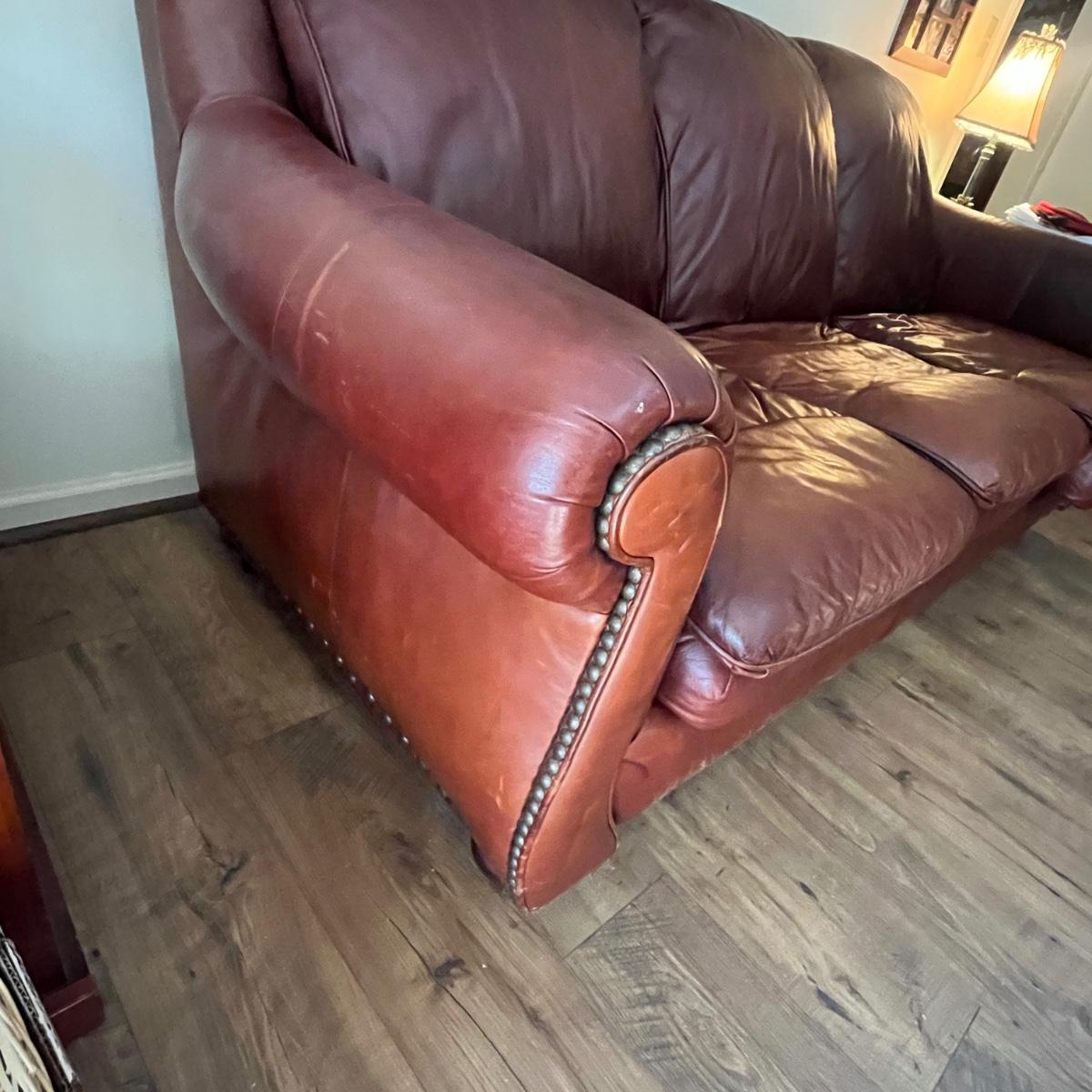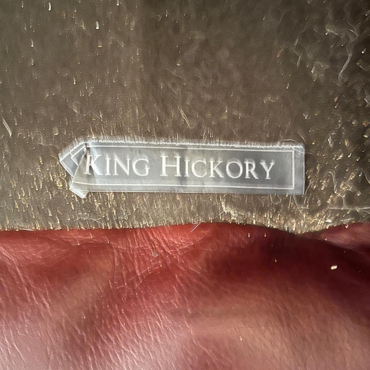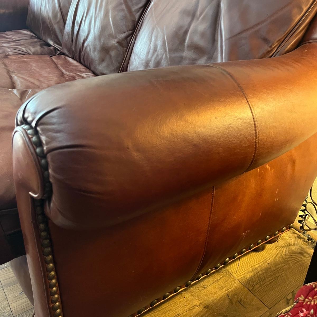 This leather sofa by King Hickory measures 92” x 40” x 38”H and has nailhead accents. Sofa has scratches and nicks, see pictures. Sofa is from a home with pets and has hair present.