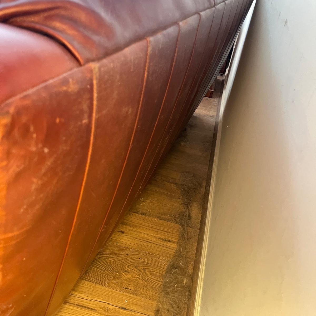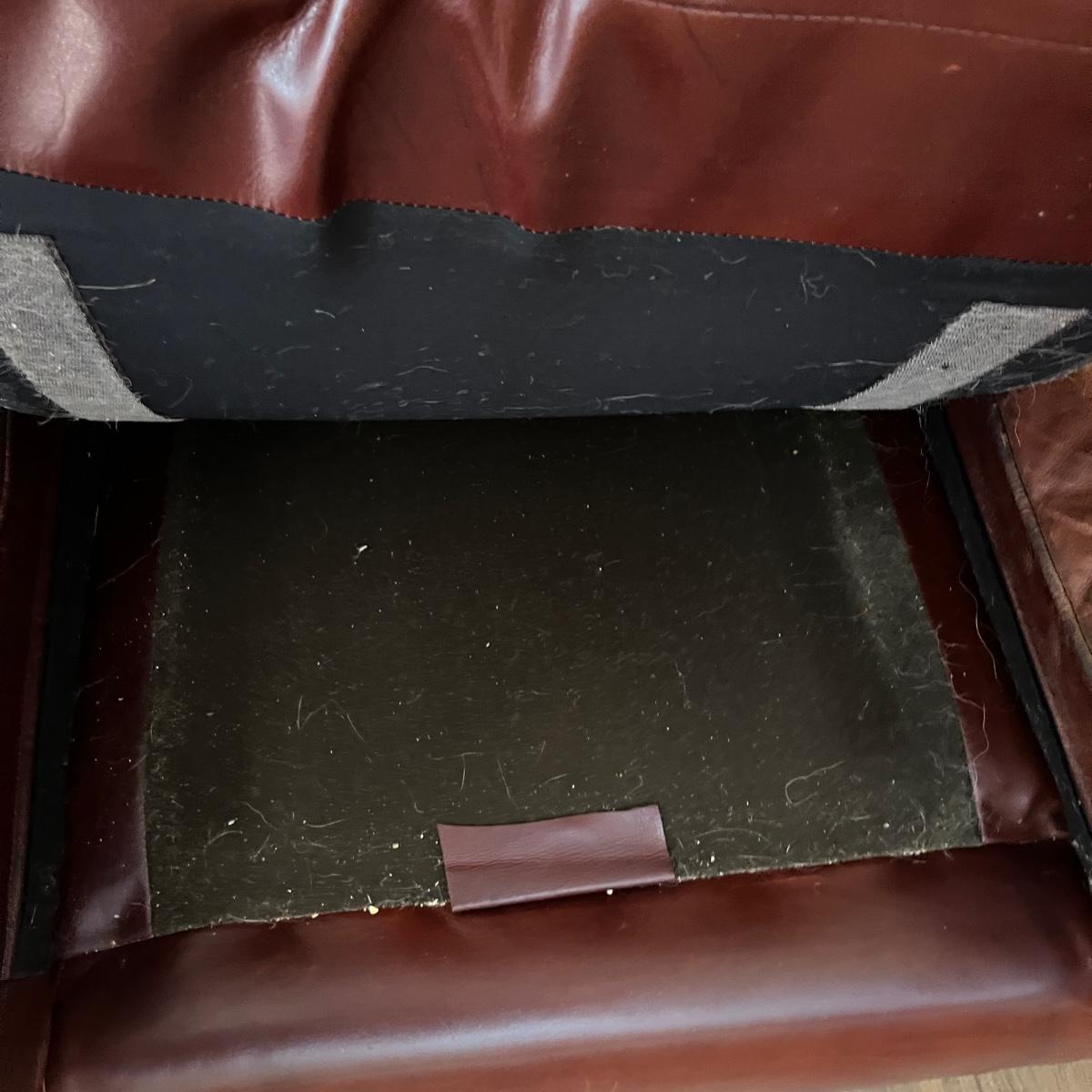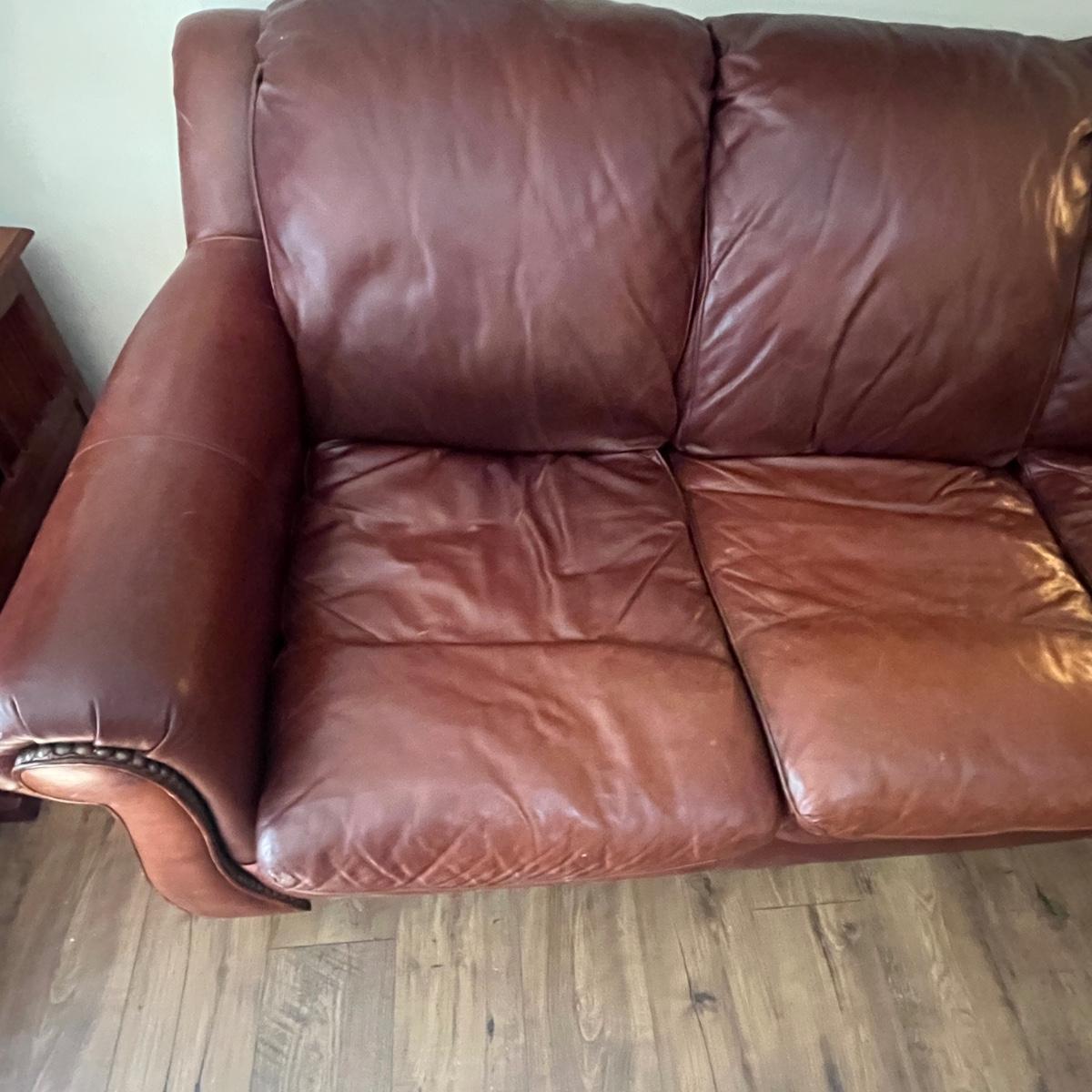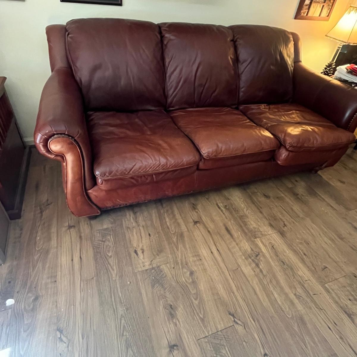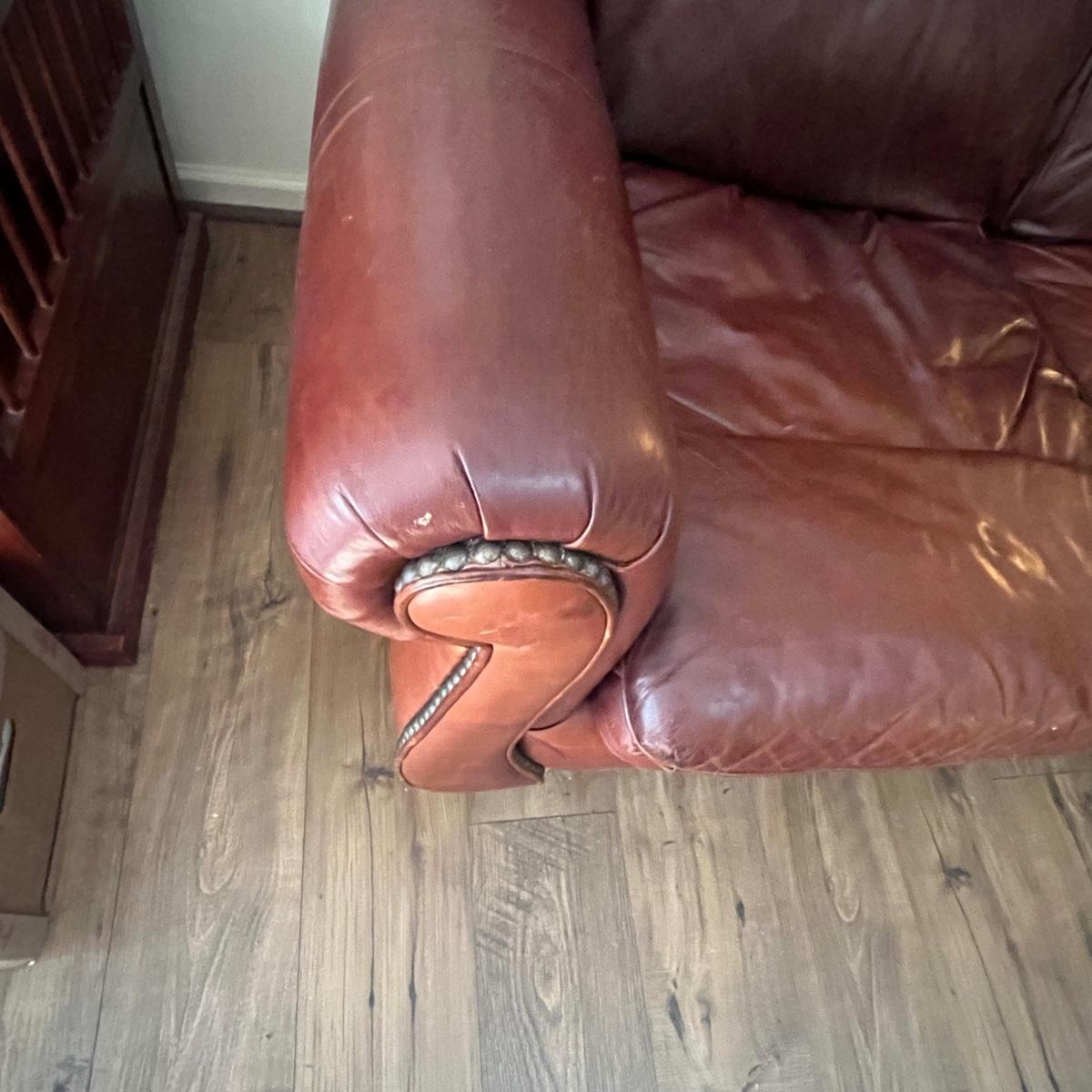 This leather sofa by King Hickory measures 92” x 40” x 38”H and has nailhead accents. Sofa has scratches and nicks, see pictures. Sofa is from a home with pets and has hair present.