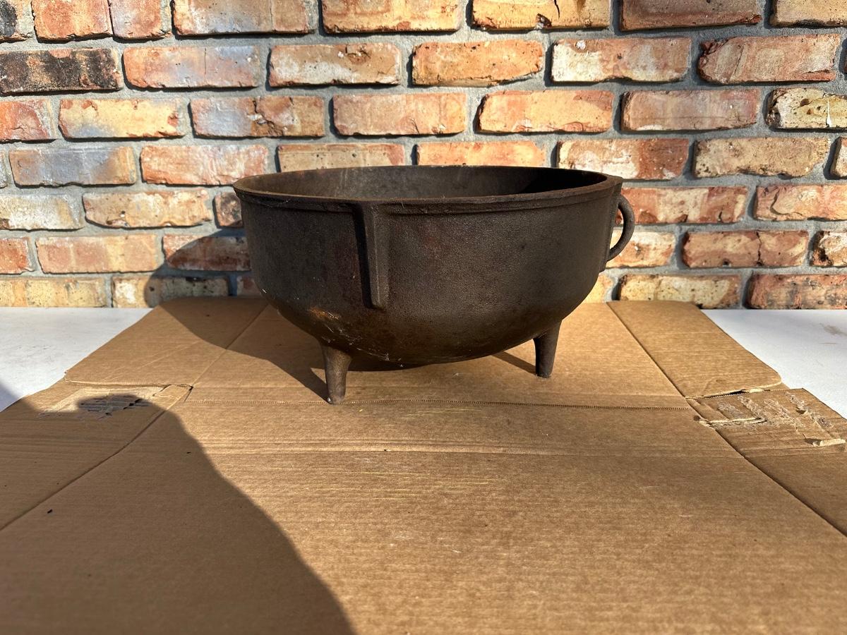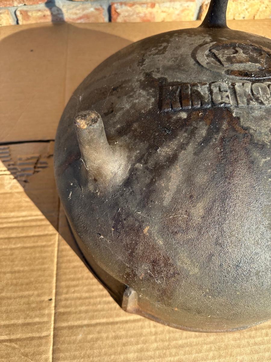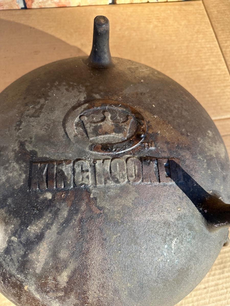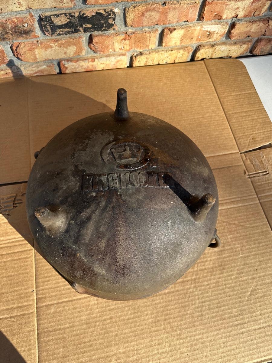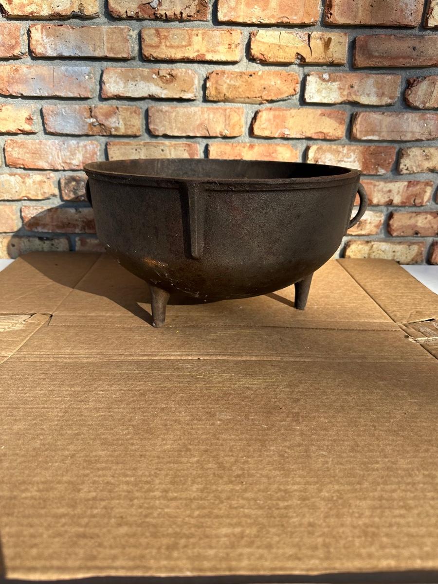Heavy-duty King Kooker cast iron cauldron / bean pot, designed for outdoor cooking, campfire use, crawfish boils, stews, and large-batch cooking. Features three integrated legs for direct-fire use and two cast side loop handles for lifting and positioning.