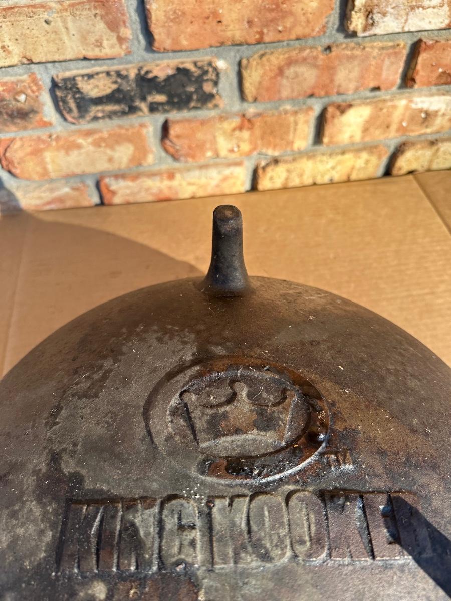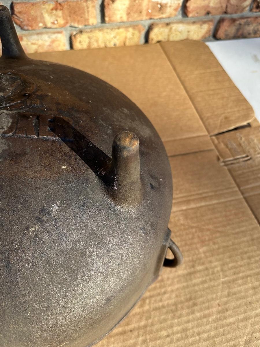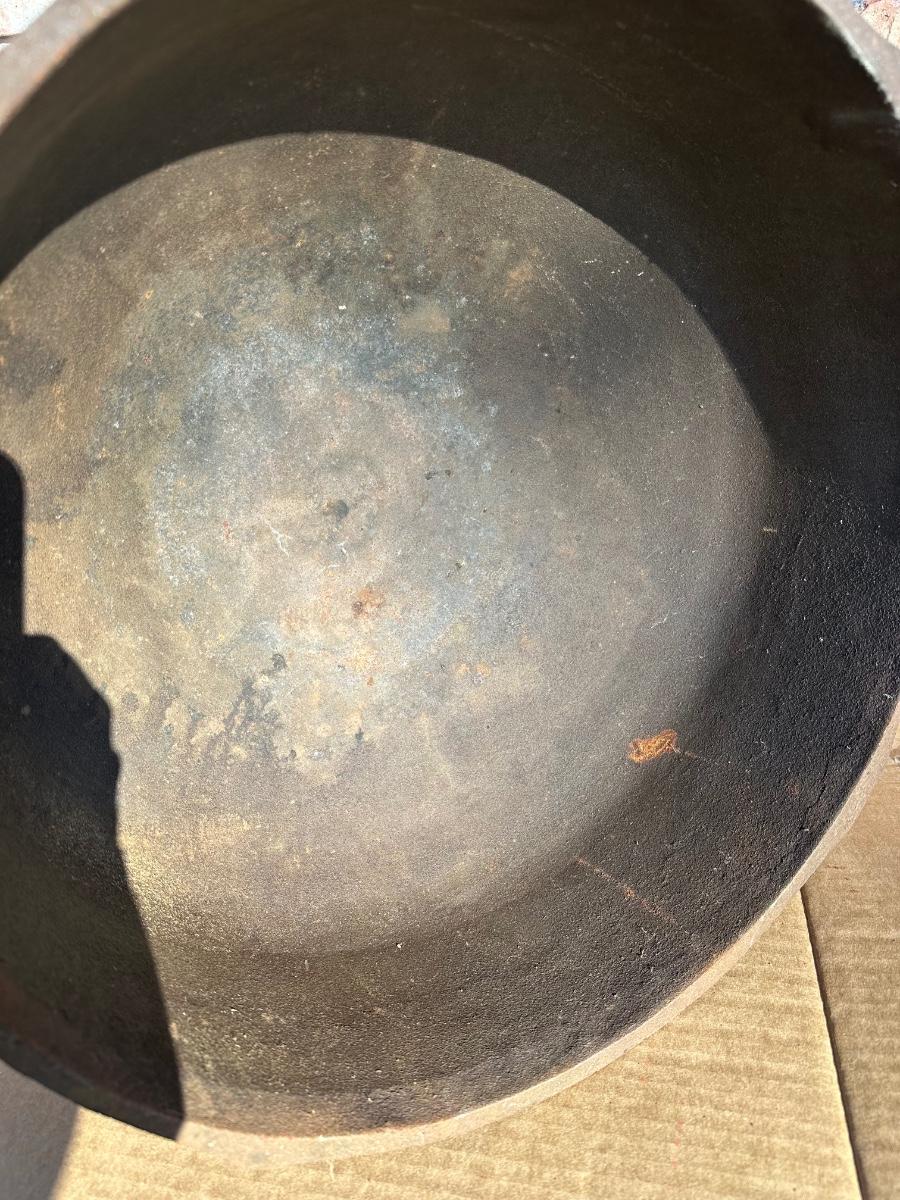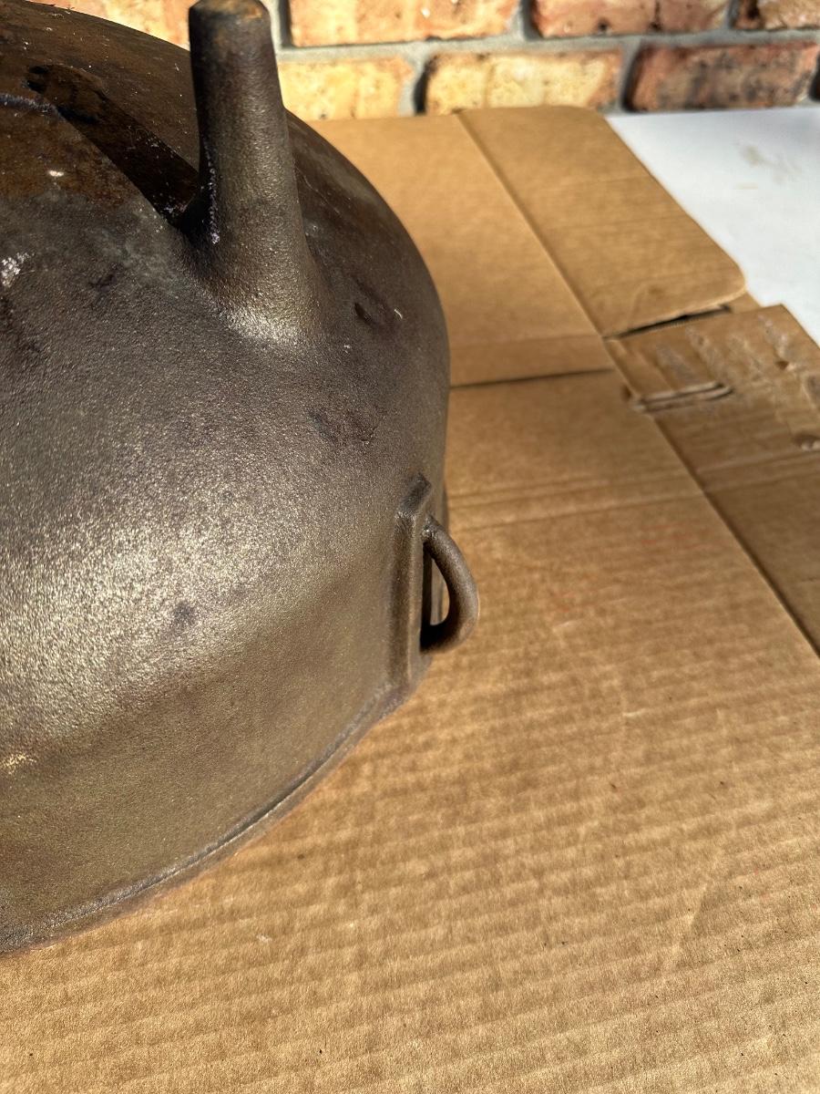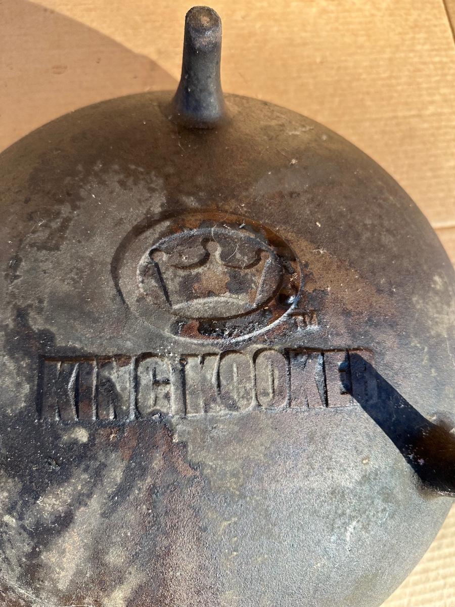 Heavy-duty King Kooker cast iron cauldron / bean pot, designed for outdoor cooking, campfire use, crawfish boils, stews, and large-batch cooking. Features three integrated legs for direct-fire use and two cast side loop handles for lifting and positioning.