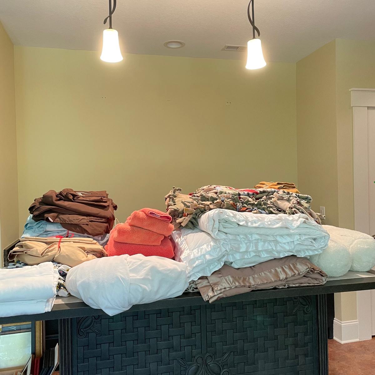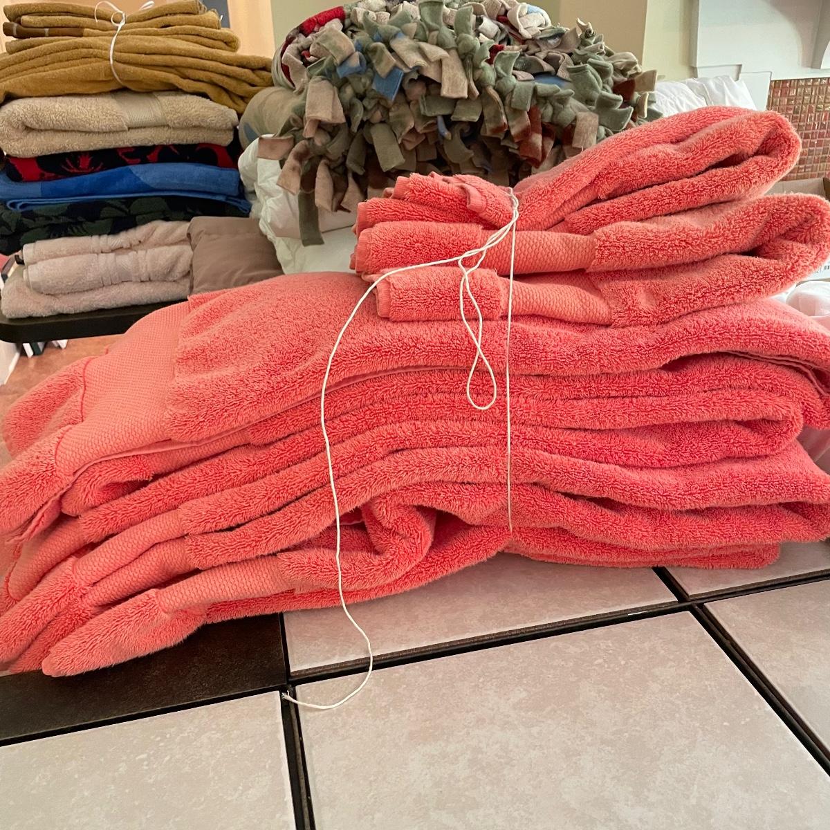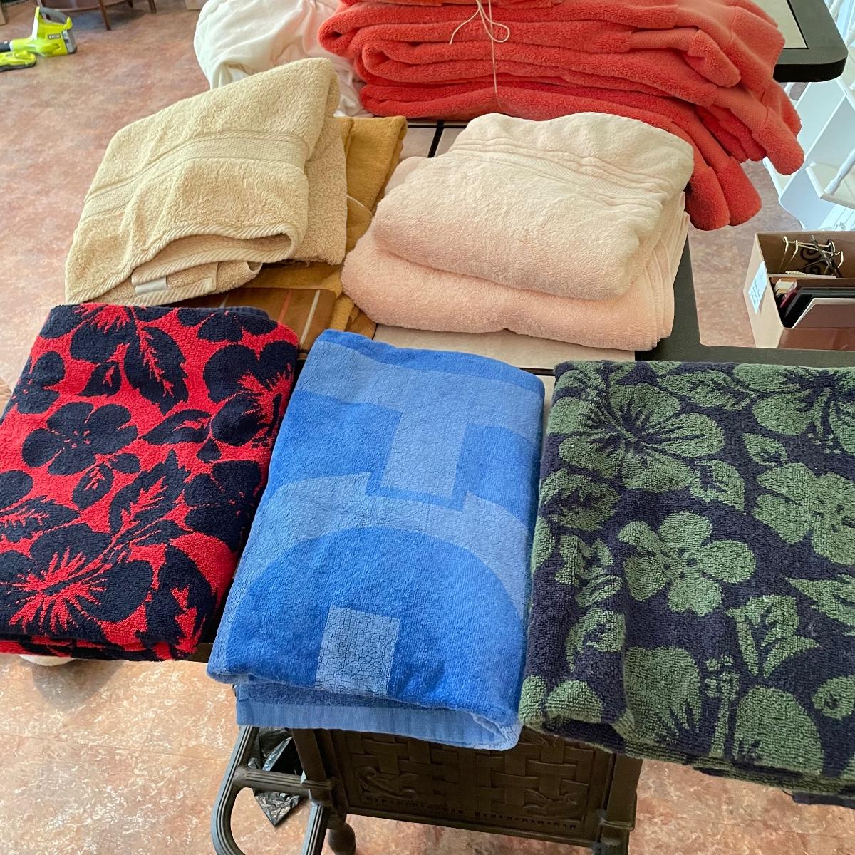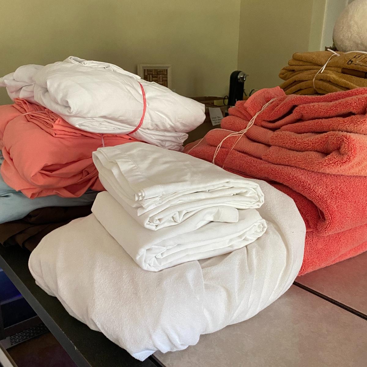 Six sets of king sized sheets with two pillow cases each. One set states it is a California King sized. Two down blankets plus a down duvet. Three beach towels a coral colored set of five bath towels, two hand towels and two wash cloths. See images. Local pick up only.