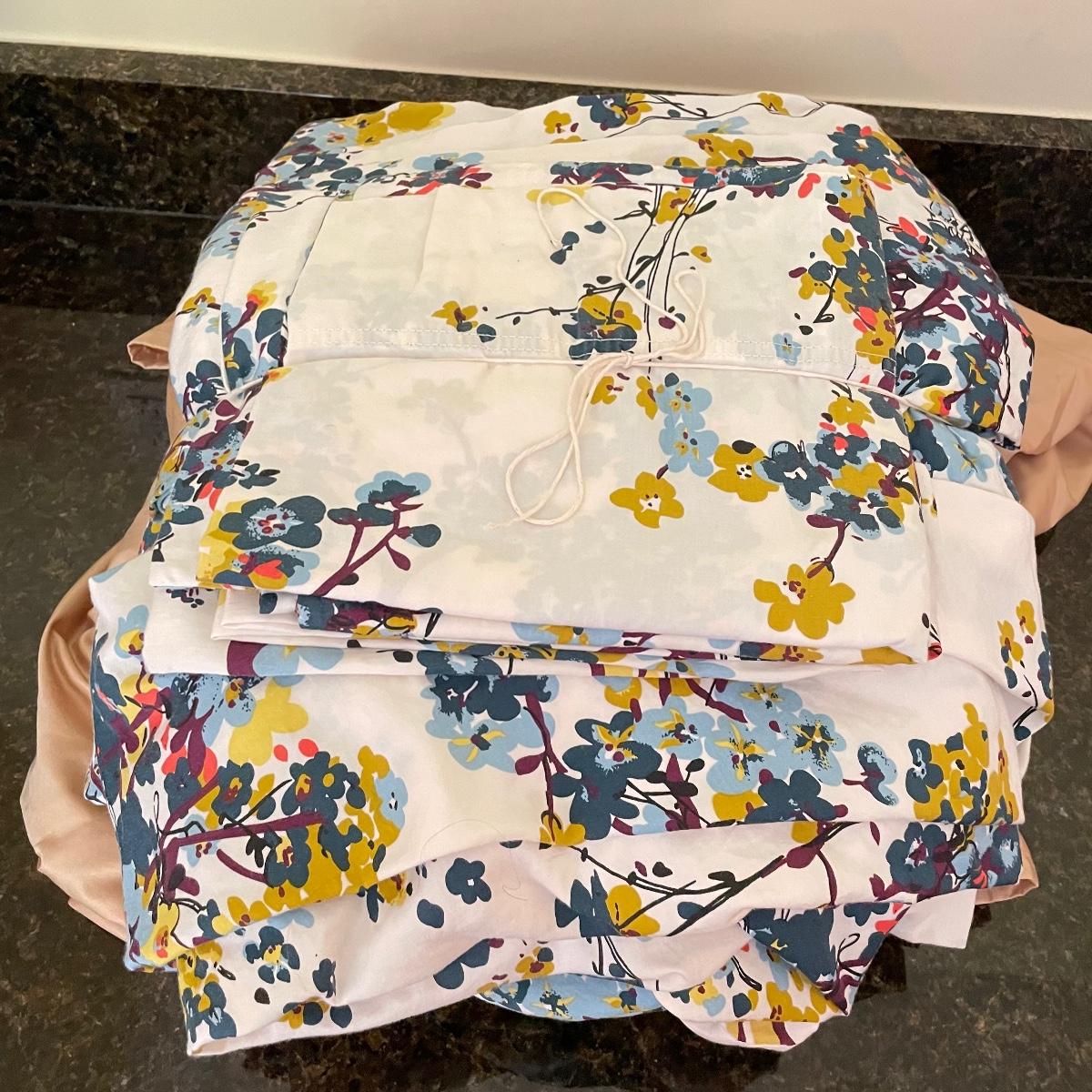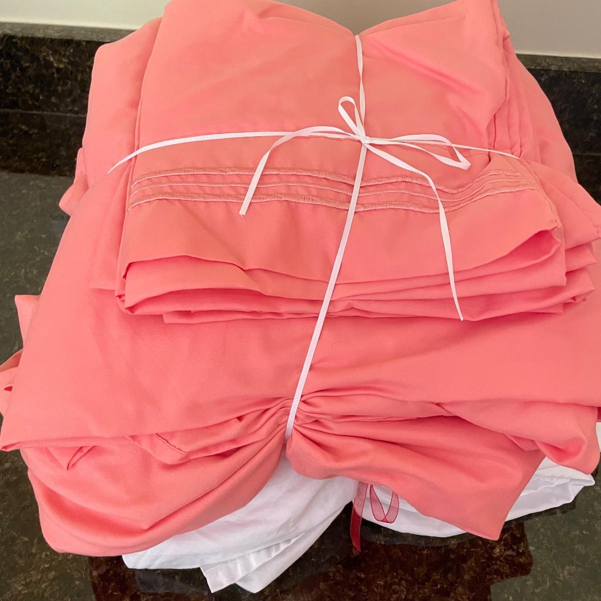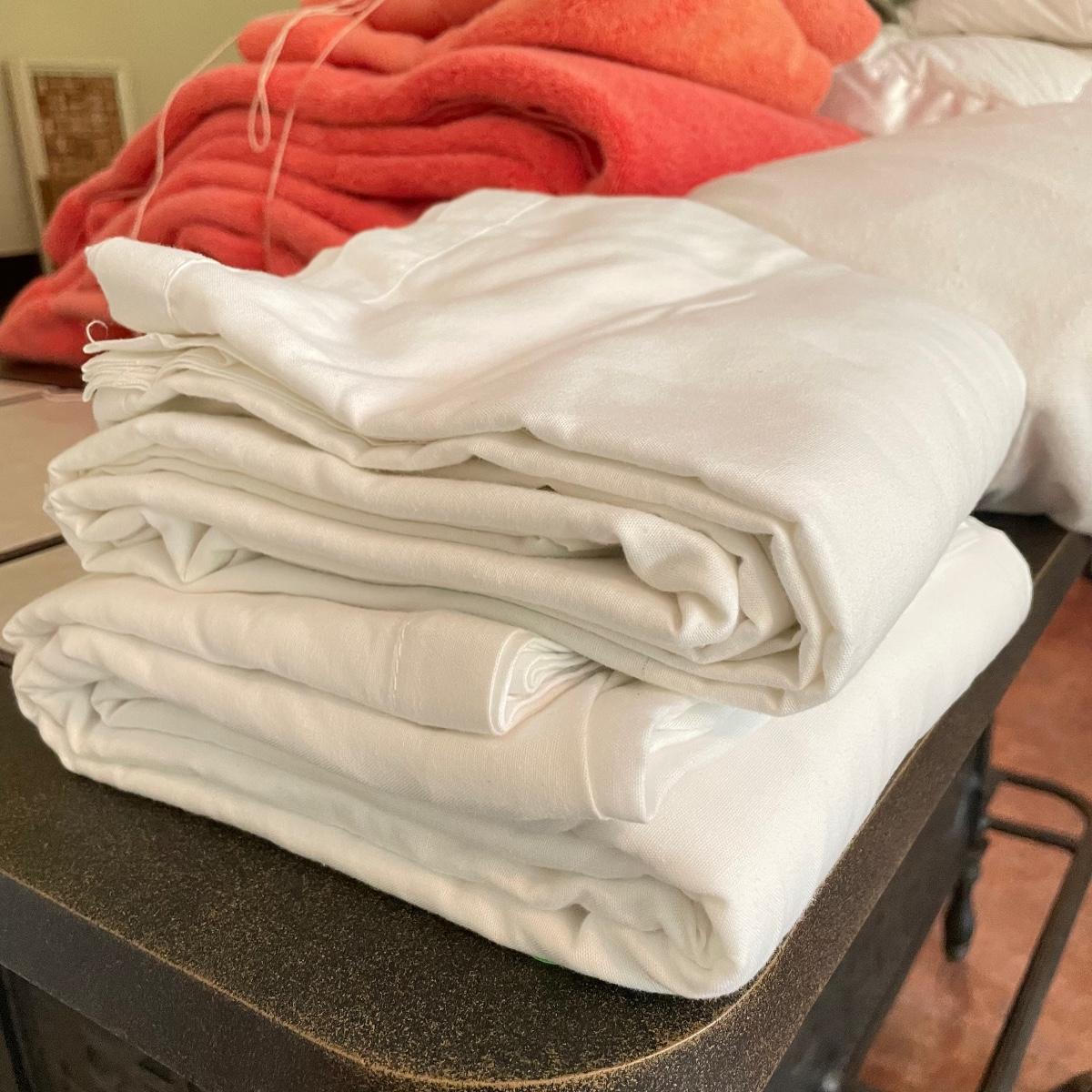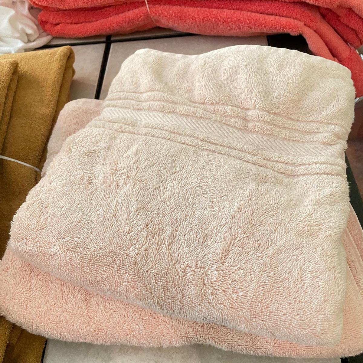Six sets of king sized sheets with two pillow cases each. One set states it is a California King sized. Two down blankets plus a down duvet. Three beach towels a coral colored set of five bath towels, two hand towels and two wash cloths. See images. Local pick up only.