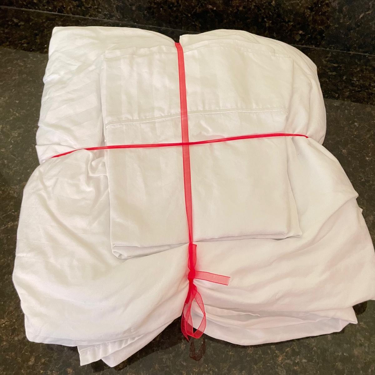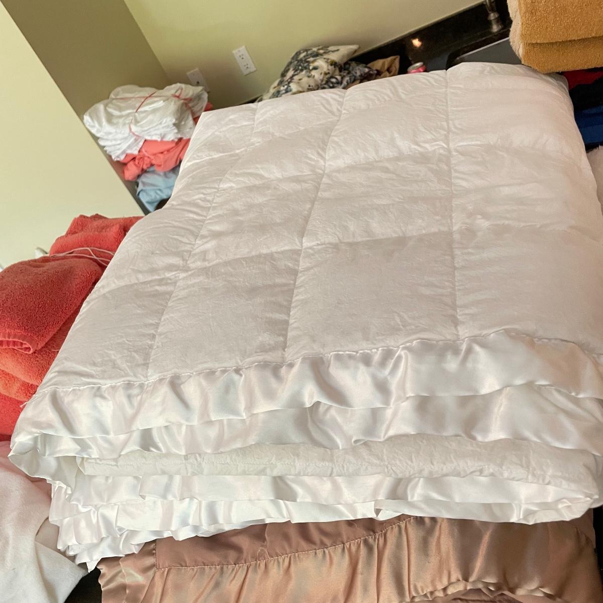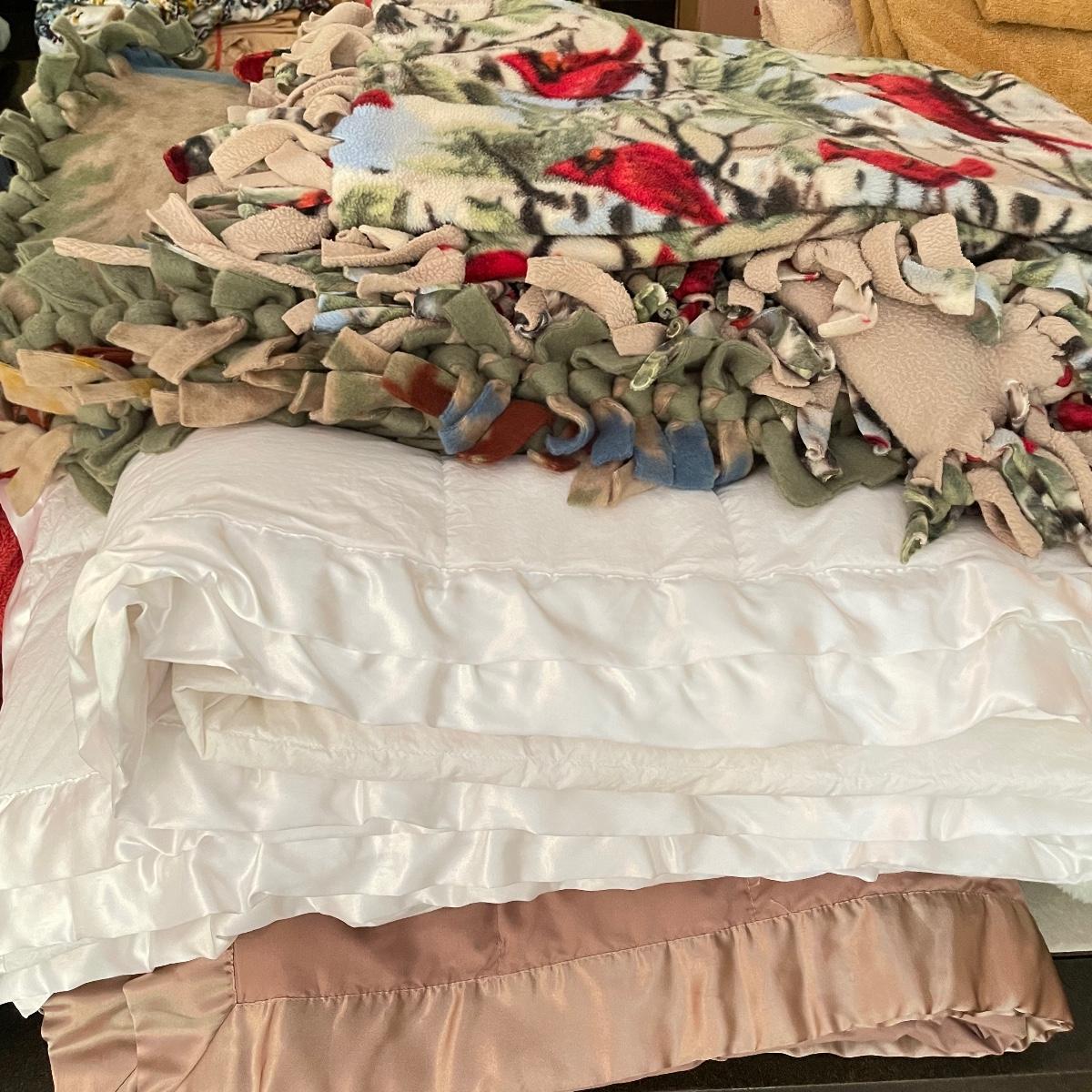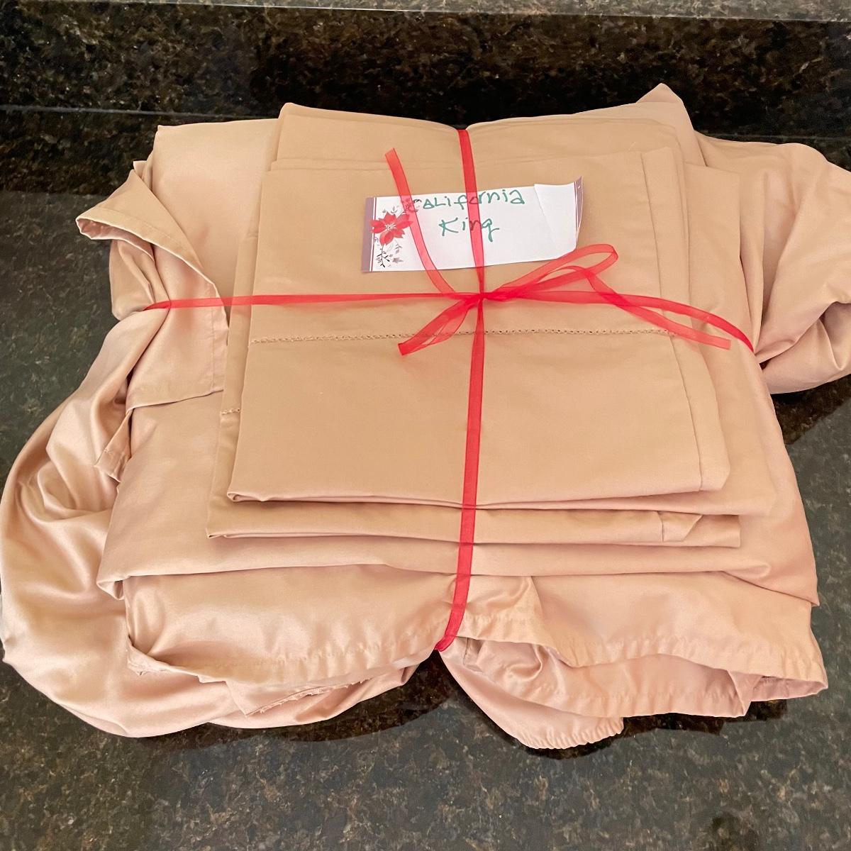 Six sets of king sized sheets with two pillow cases each. One set states it is a California King sized. Two down blankets plus a down duvet. Three beach towels a coral colored set of five bath towels, two hand towels and two wash cloths. See images. Local pick up only.
