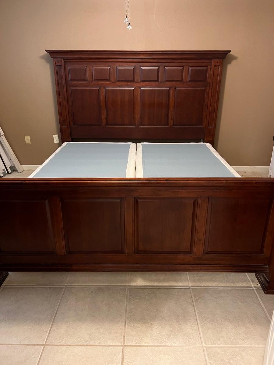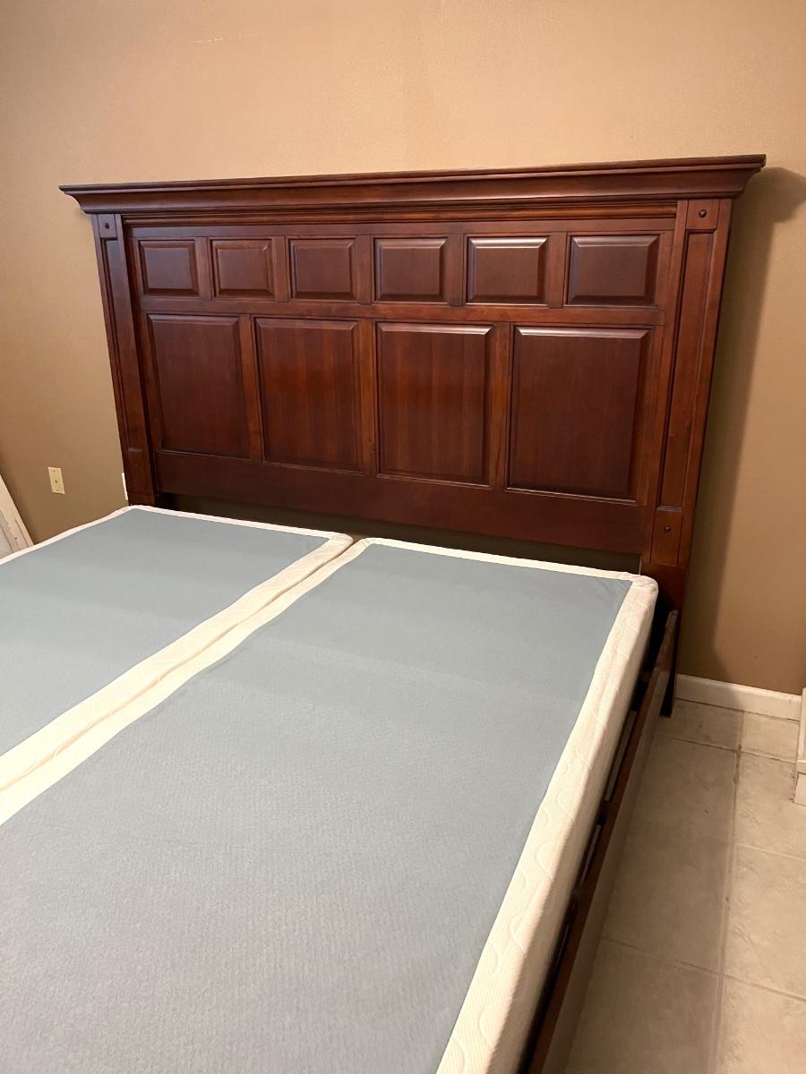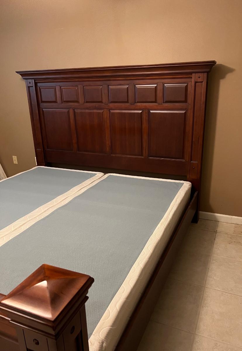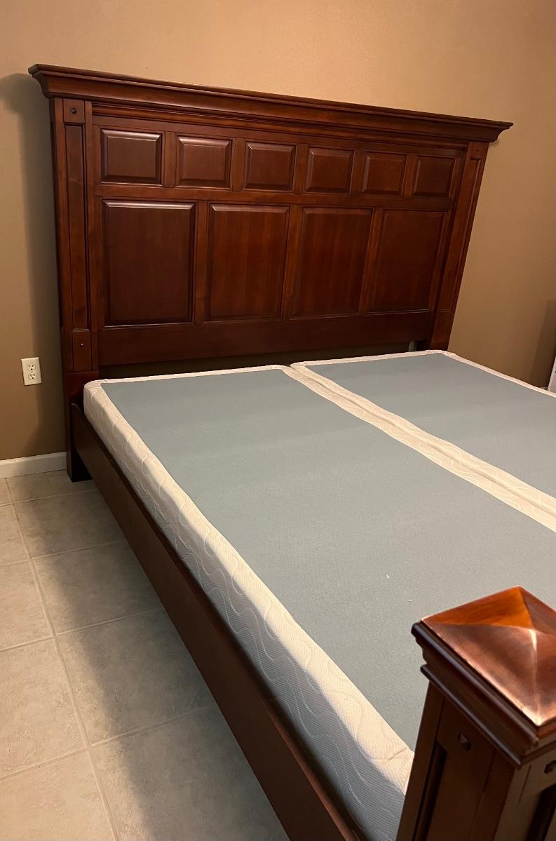 King size bed with headboard, footboard, rails and two foundation mattresses.