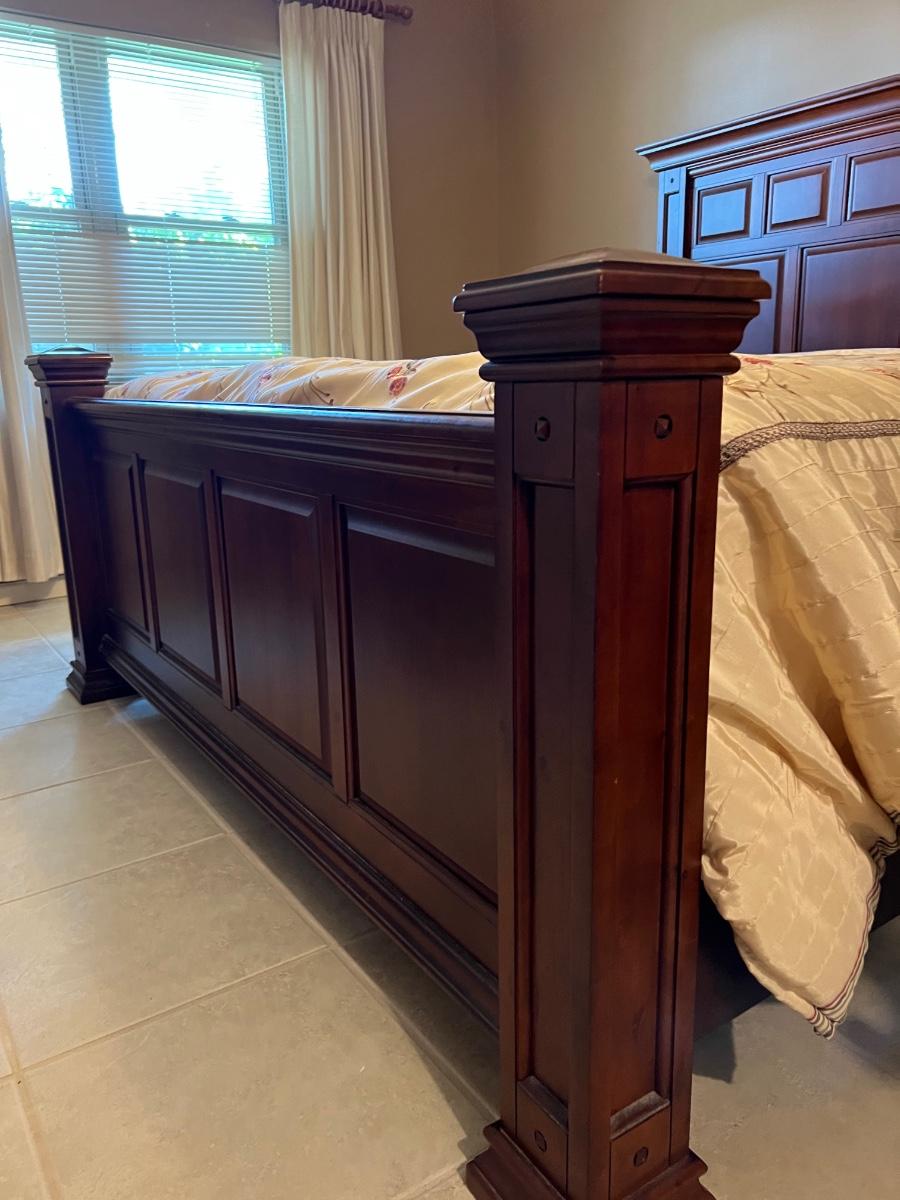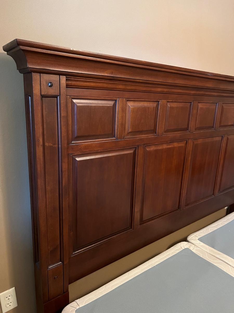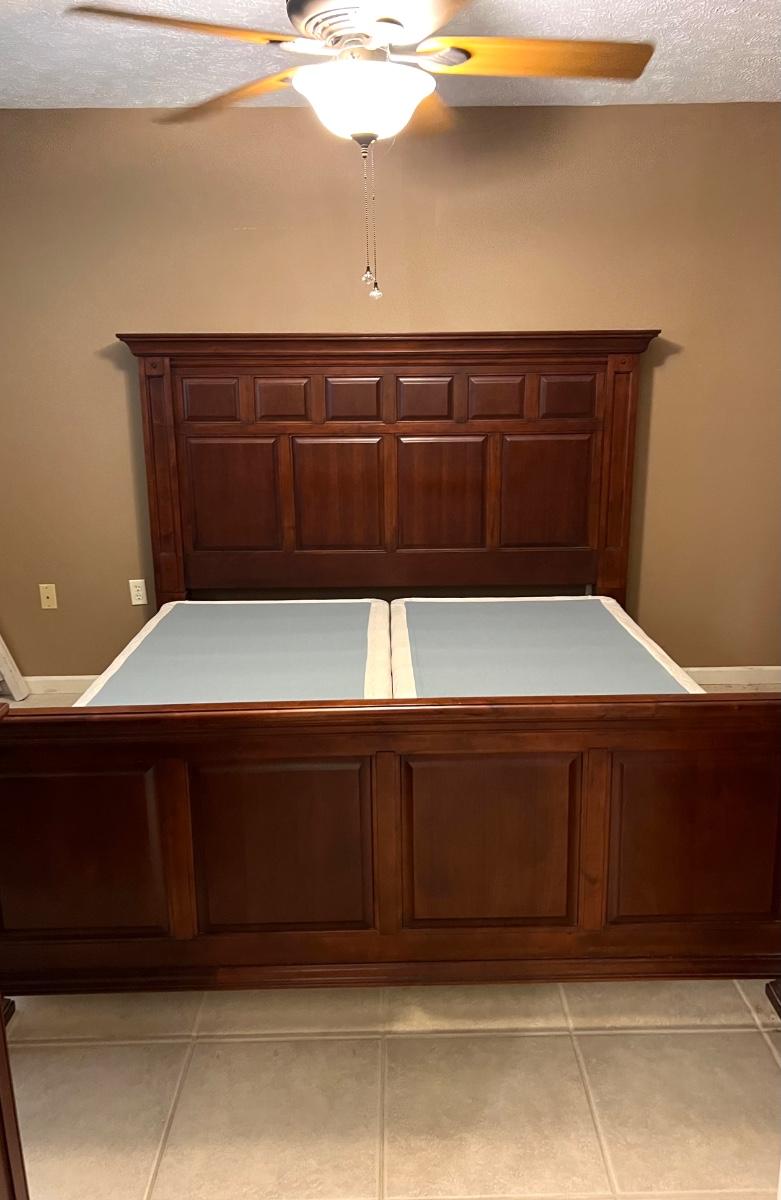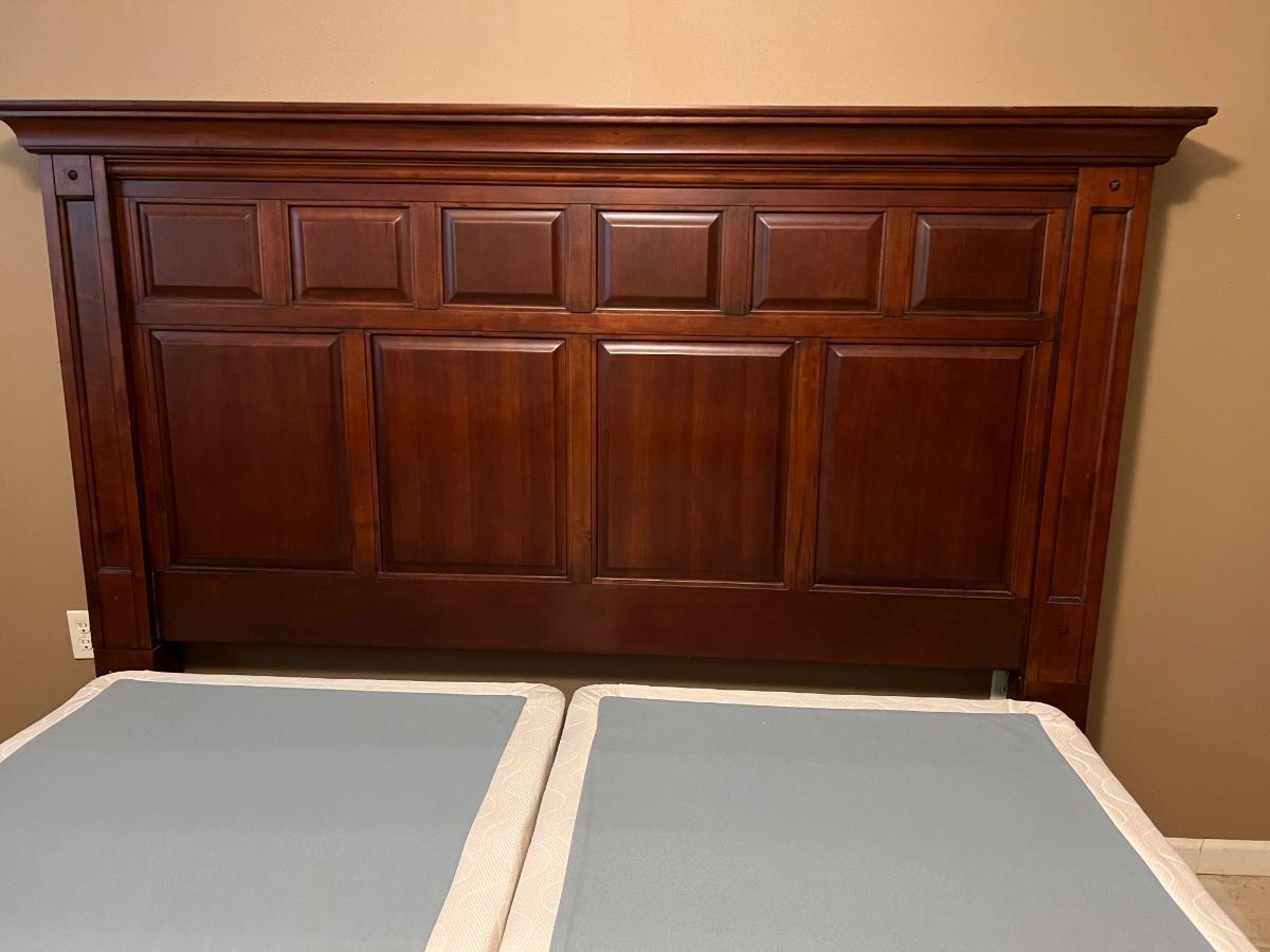 King size bed with headboard, footboard, rails and two foundation mattresses.