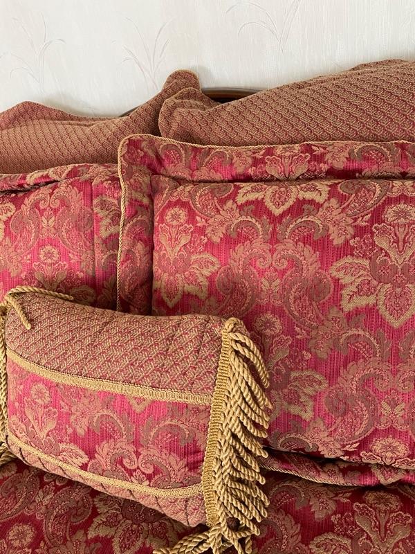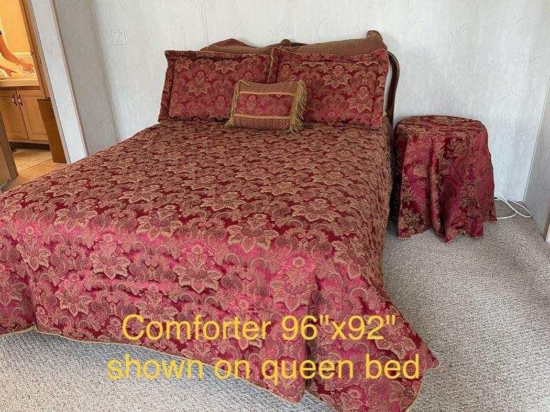 Pick up time Noon- 1 pm Includes two 26" euro shams, 2 standard shams, accent pillow, 92" X 96" comforter, king bedskirt, table skirt and round, particle board table.