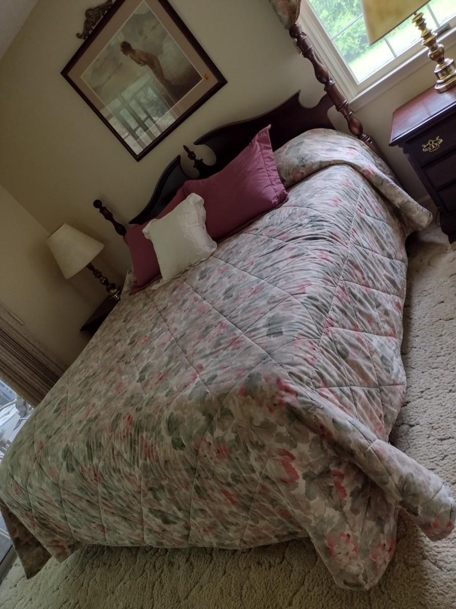 King Size Bed with Wooden Headboard by Kimball . Includes mattress and bedding. Measures approx 80" across. Please bring tools and assistance to remove item safely.