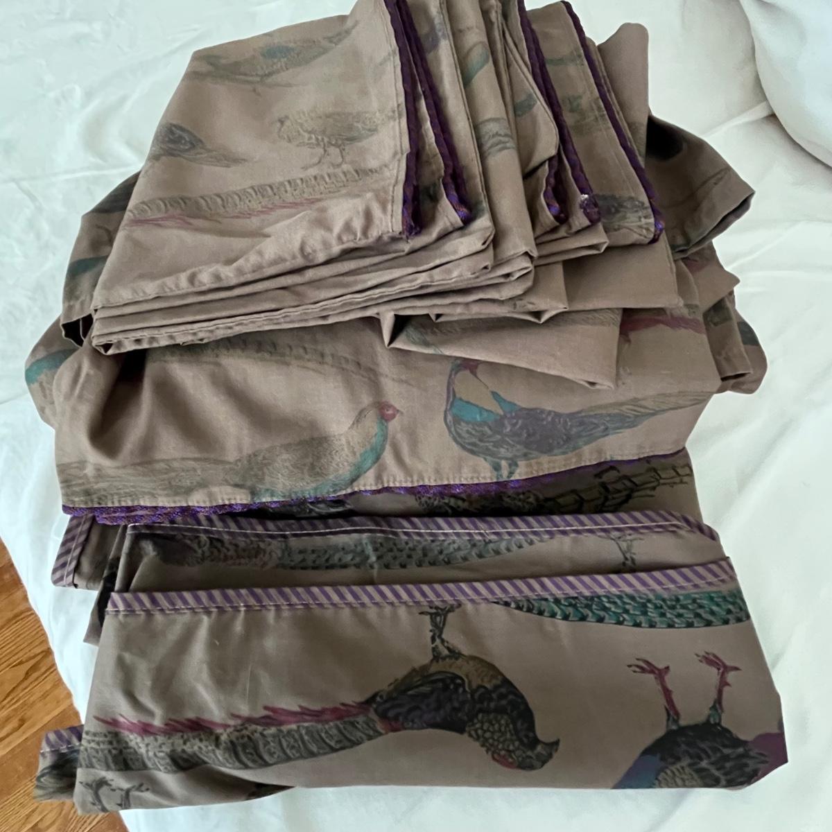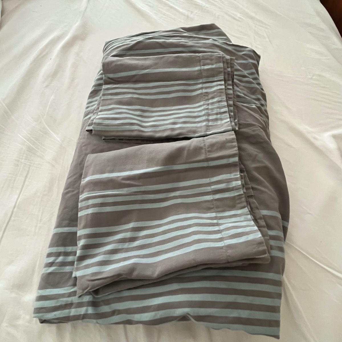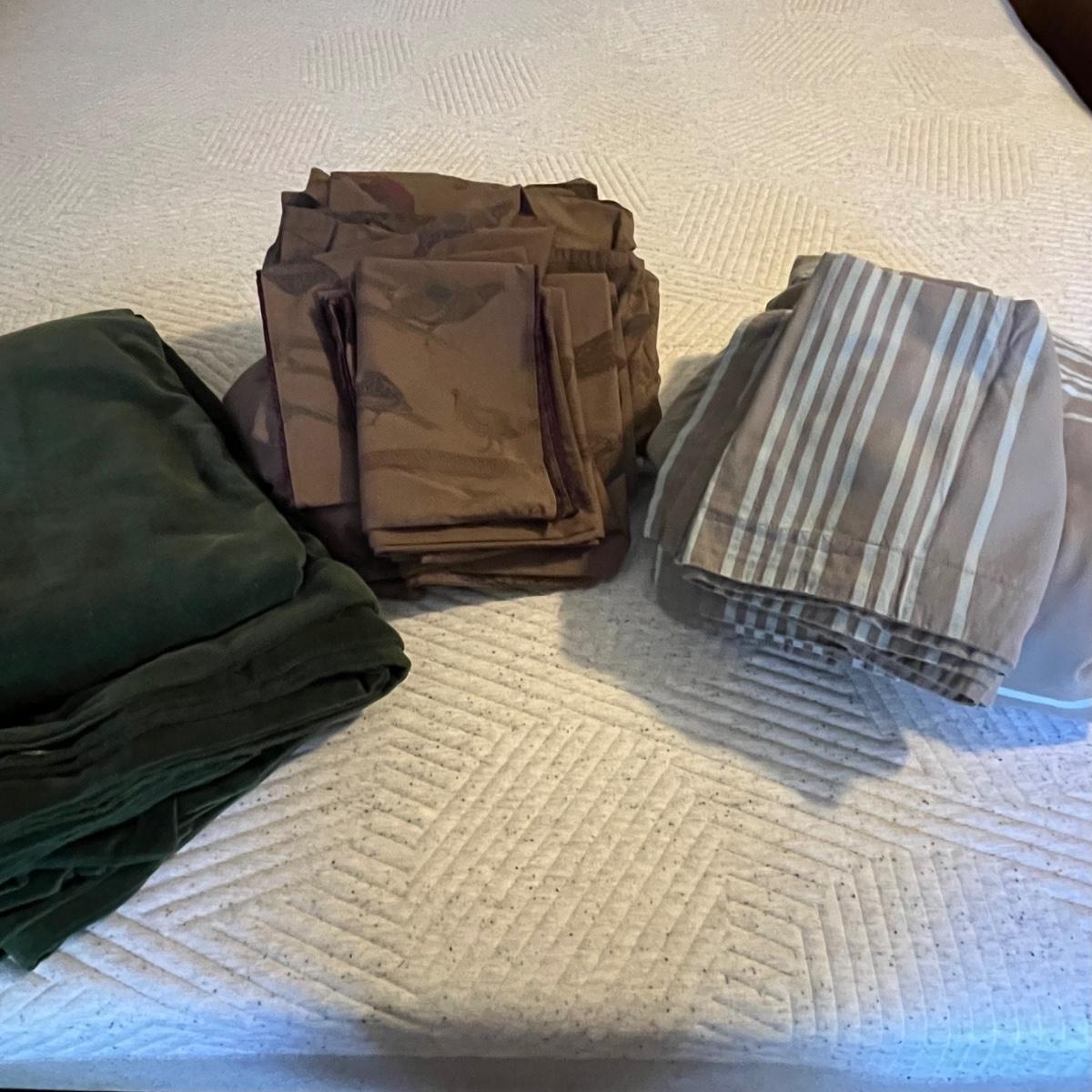 This includes various bedding for a king sized bed. A green velvet duvet cover from Pottery Barn, a Fieldcrest gray and blue duvet set including pillow shams from Target, a lightweight coverlet from Modart and a sheet set that includes a matching dust ruffle, two pillow shams and four pillow cases from Perry Ellis.