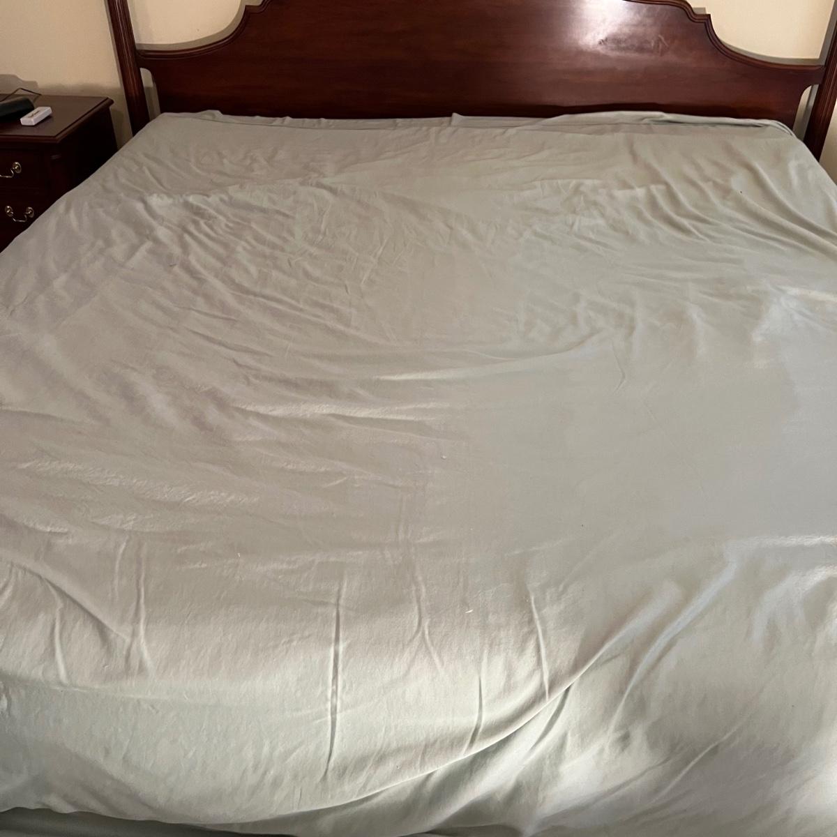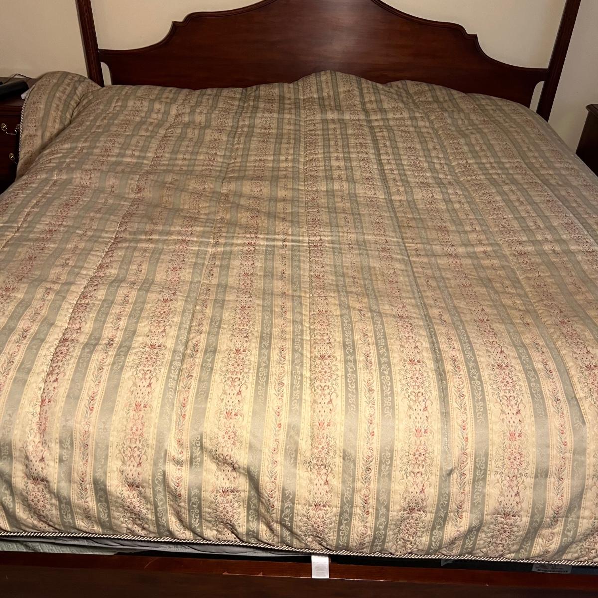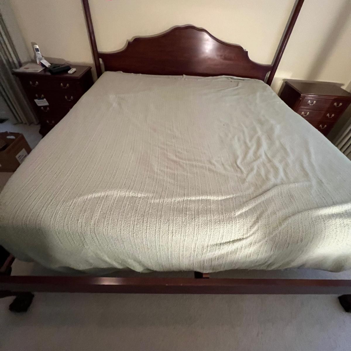 This king sized bedding set includes a mint green flat and fitted sheet and two king pillowcases. Two more king pillowcases match one of the two reversible duvet/bedspreads and bed skirt; note this duvet has a small dark stain the size of a quarter on underside, see photo. A green wool like blanket and a small accent pillow also included. The standard pillows in photos are not included in this lot and the four poster bed is available in another lot in this sale.