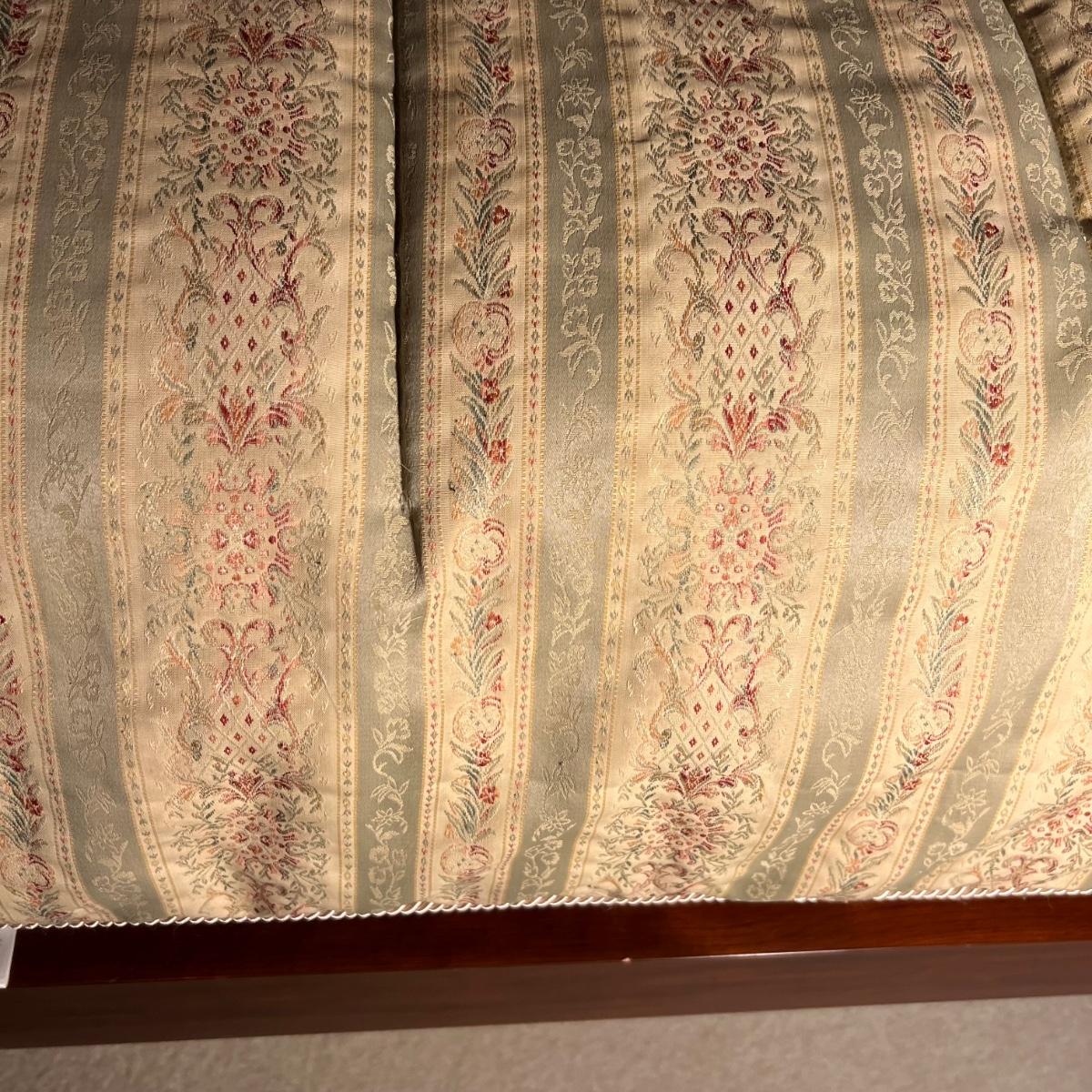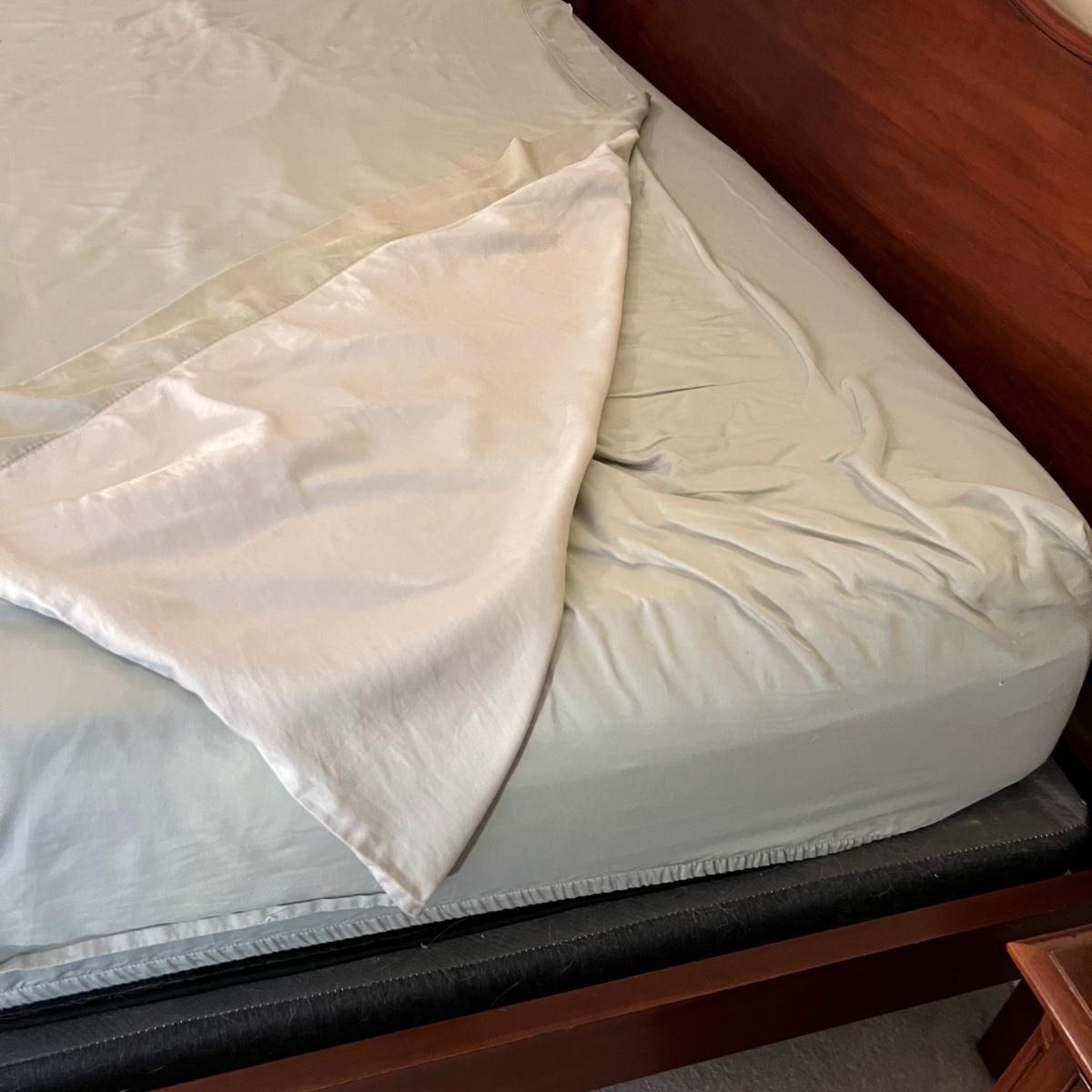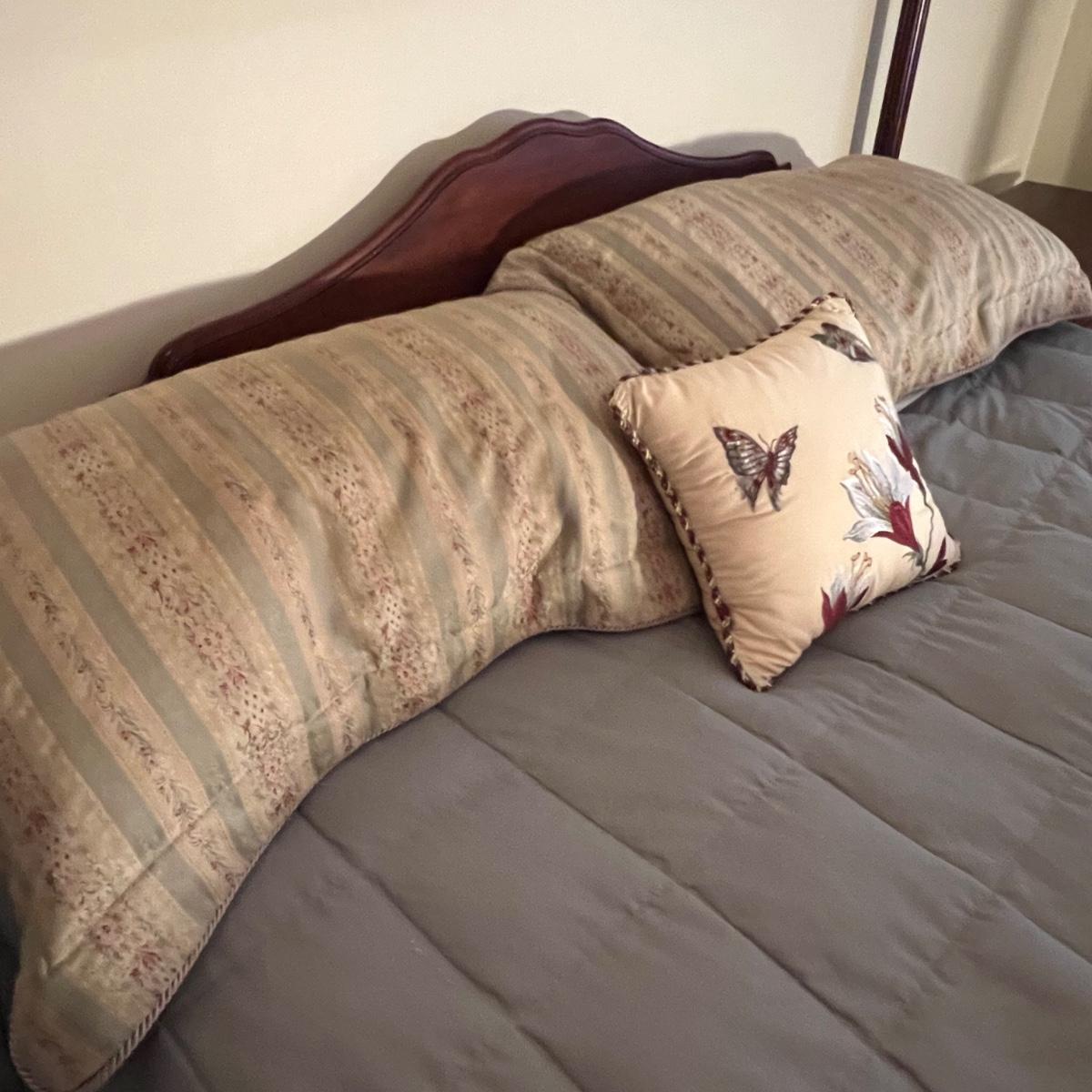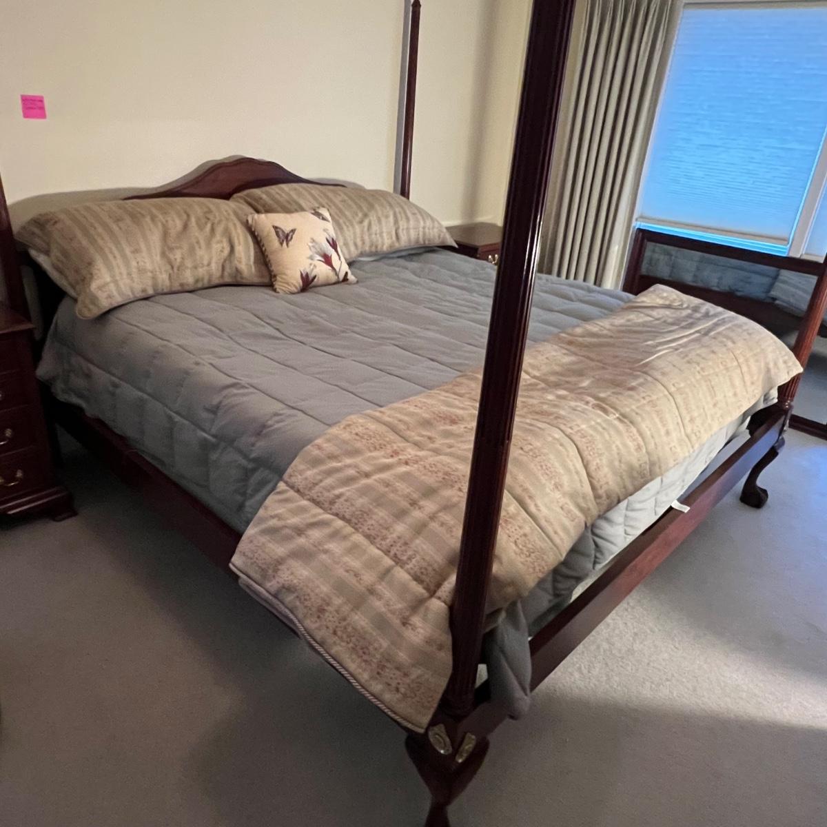 This king sized bedding set includes a mint green flat and fitted sheet and two king pillowcases. Two more king pillowcases match one of the two reversible duvet/bedspreads and bed skirt; note this duvet has a small dark stain the size of a quarter on underside, see photo. A green wool like blanket and a small accent pillow also included. The standard pillows in photos are not included in this lot and the four poster bed is available in another lot in this sale.