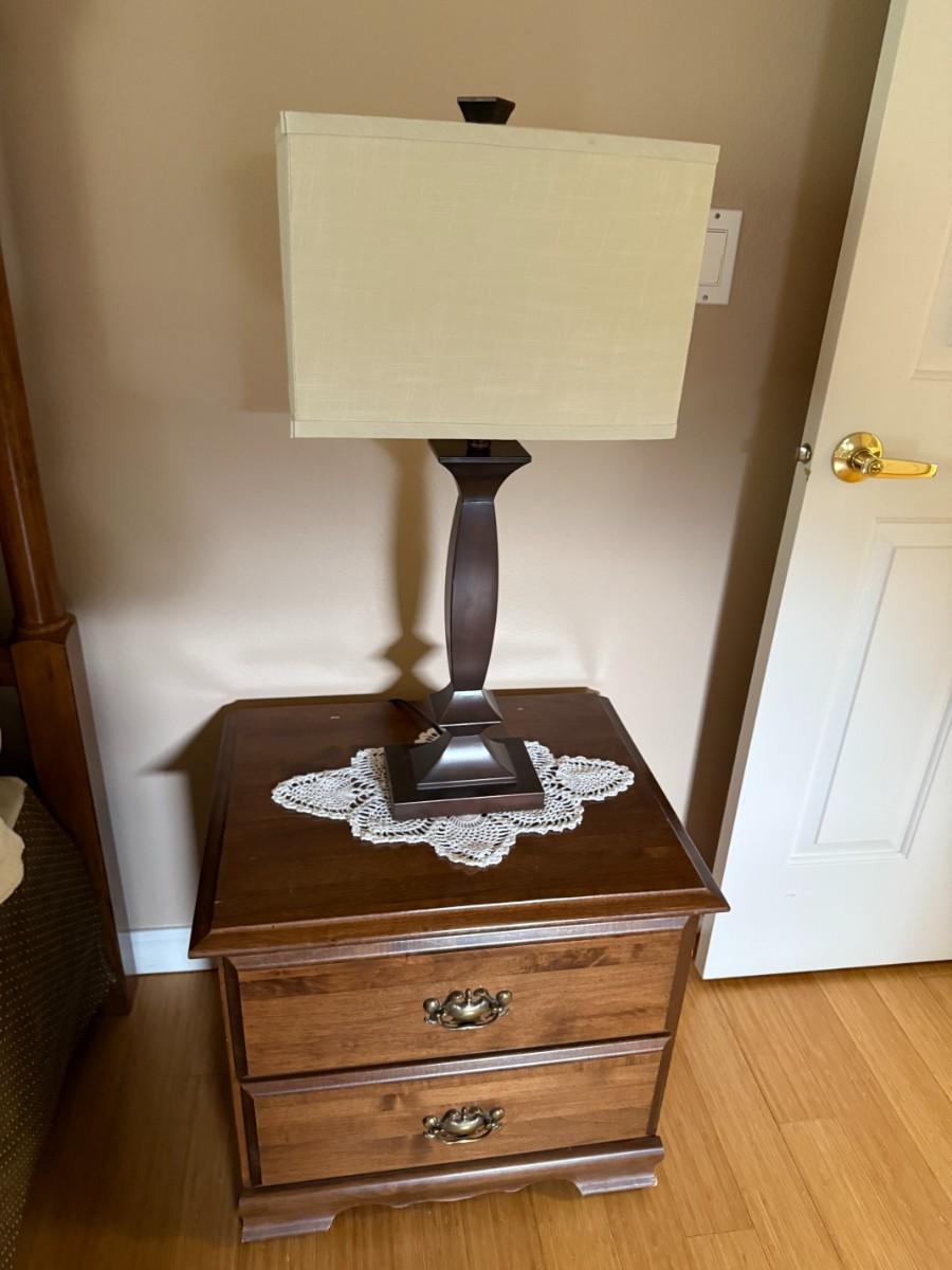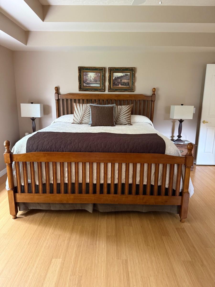 King size bedframe, mattress, 2 end tables, lamps, and two pictures
