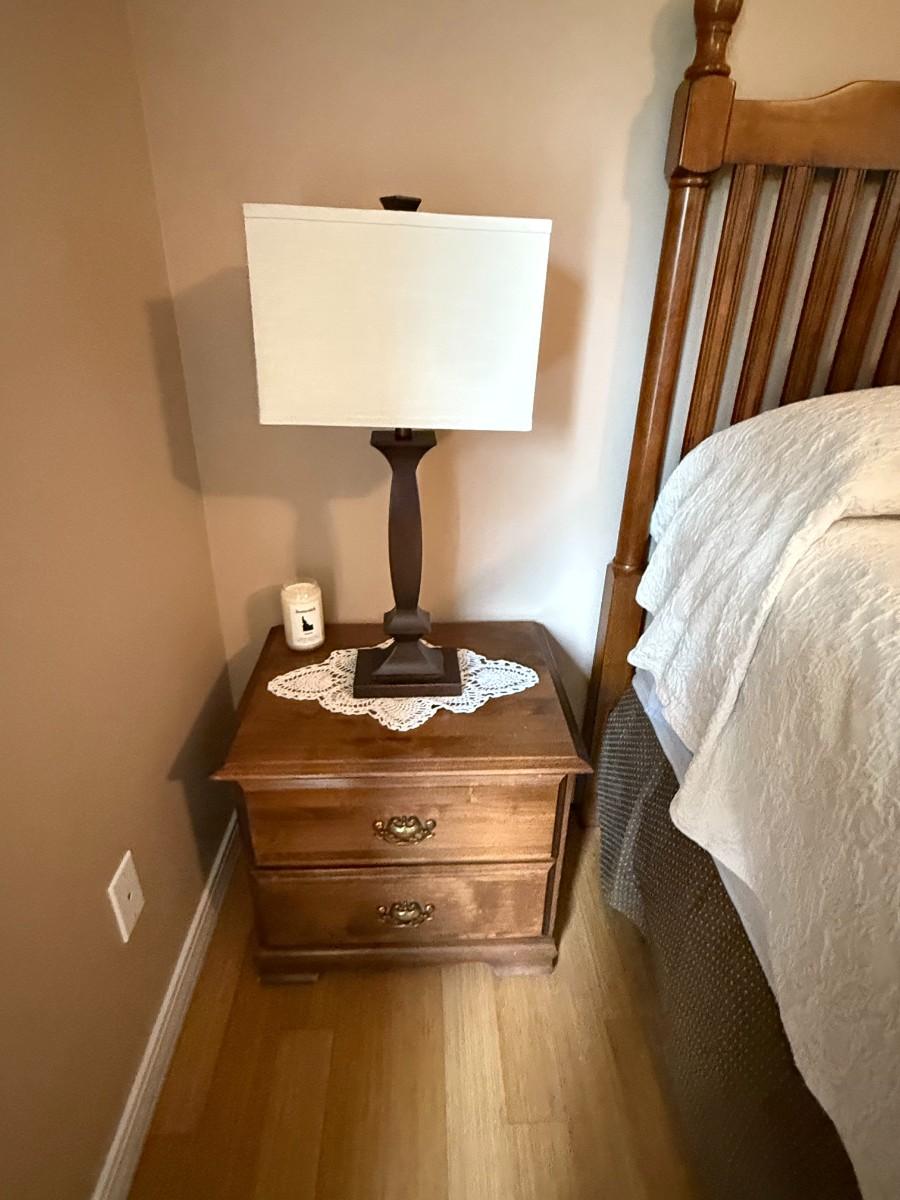 A complete bedroom set that includes a king-size bedframe and mattress, two elegant end tables, matching lamps, and decorative pictures to create a cozy and stylish retreat.