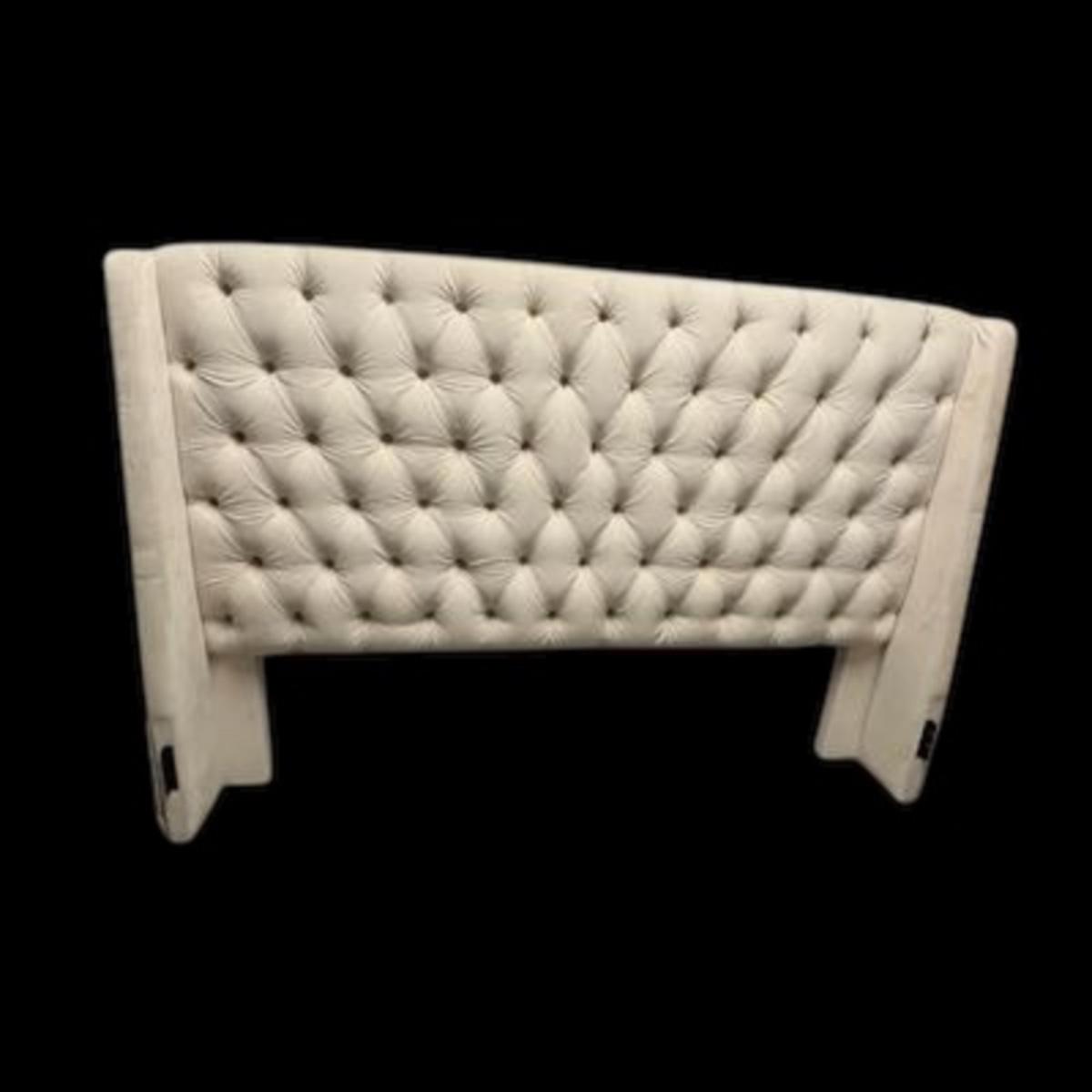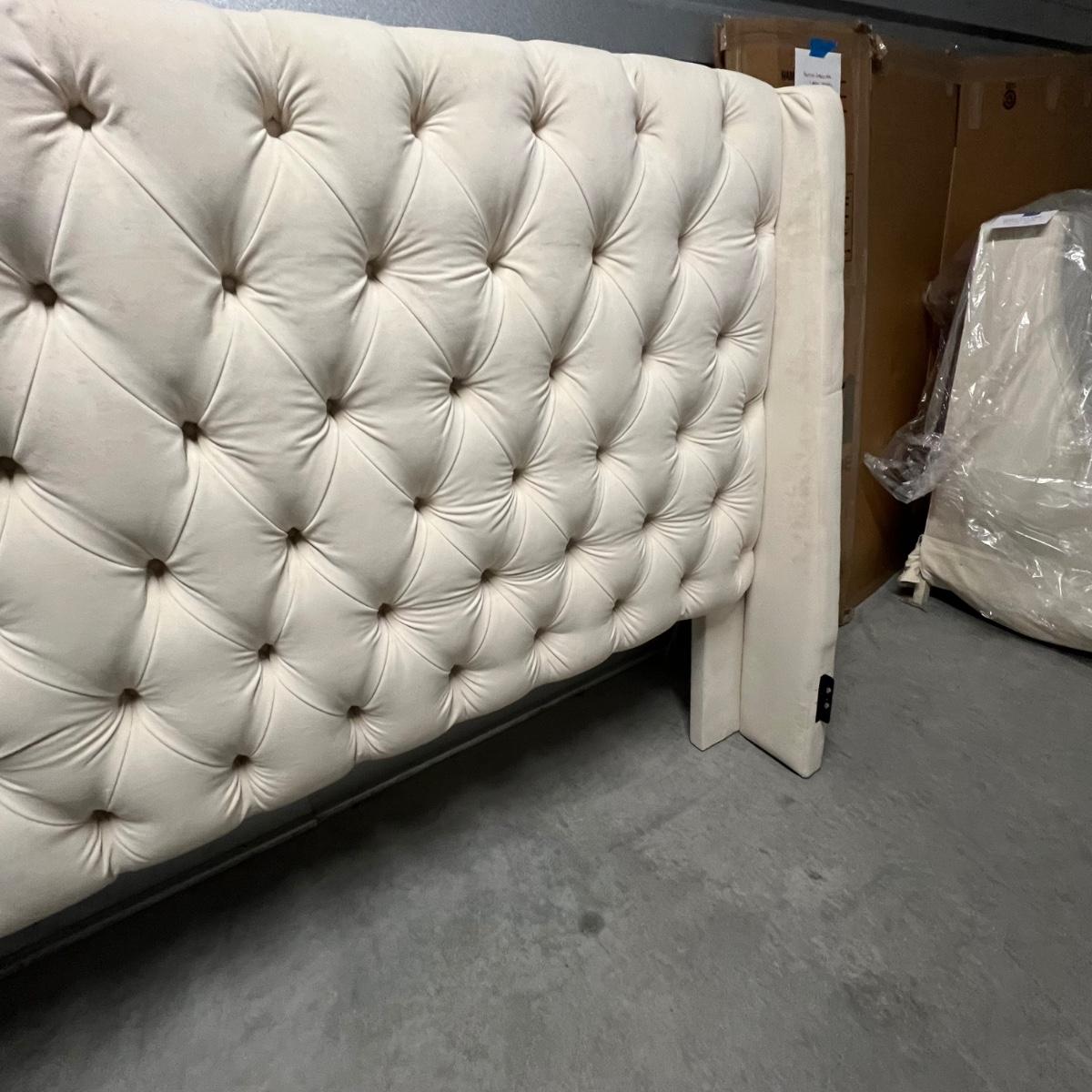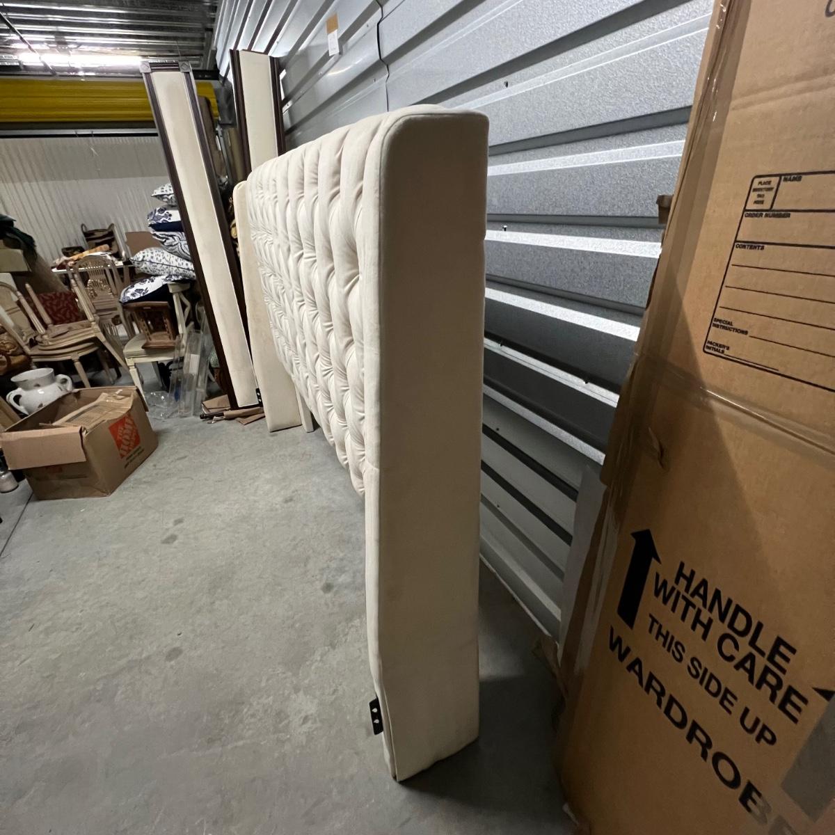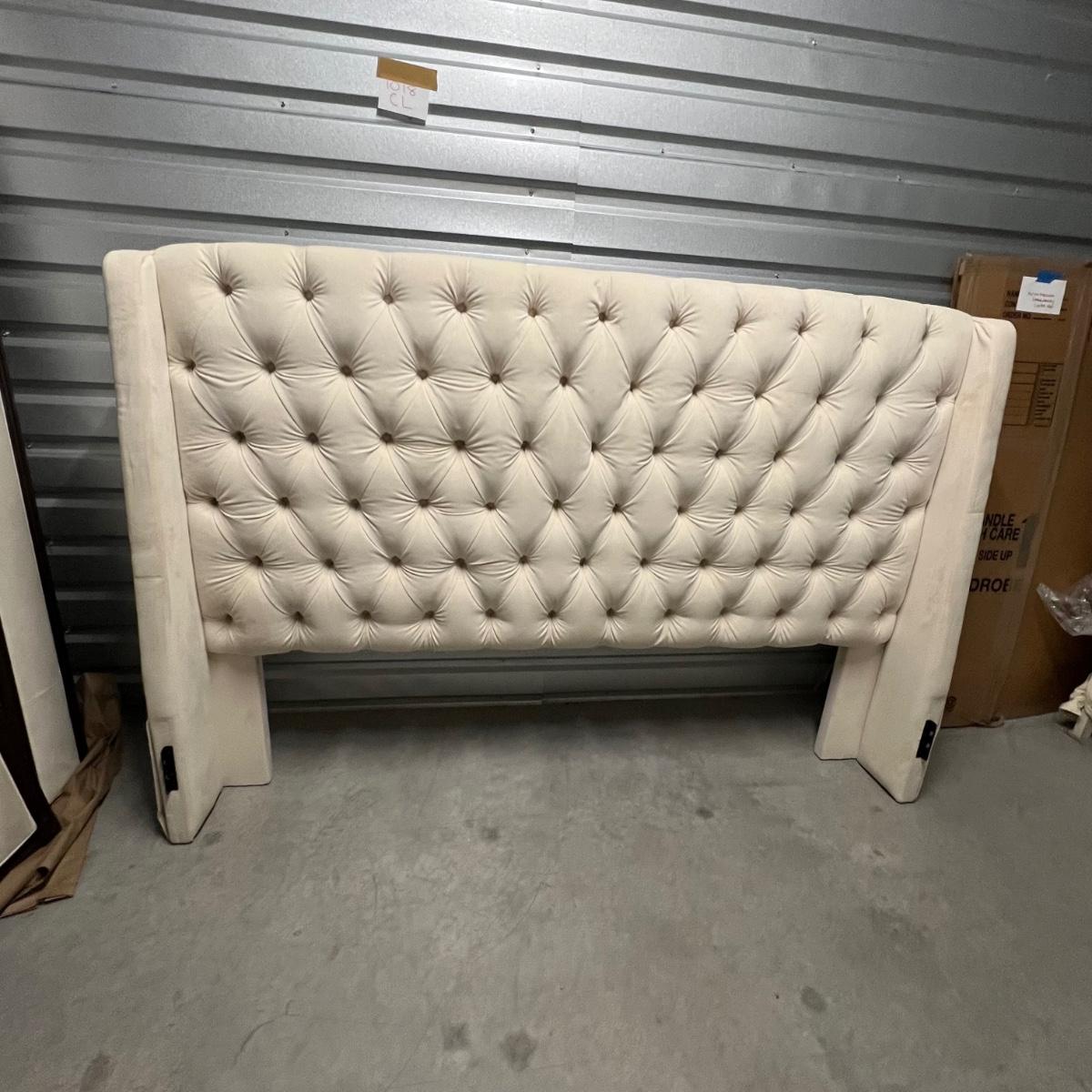 This luxurious headboard is for a king bed. It has a soft velour like button tufted cream colored upholstery. It has hardware for rails but no rails are included. The frame is most likely wood underneath, this is a sturdy frame. This item is is the back of a very full unit, will be available for a later pick up time.