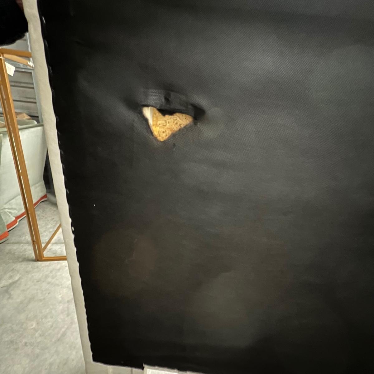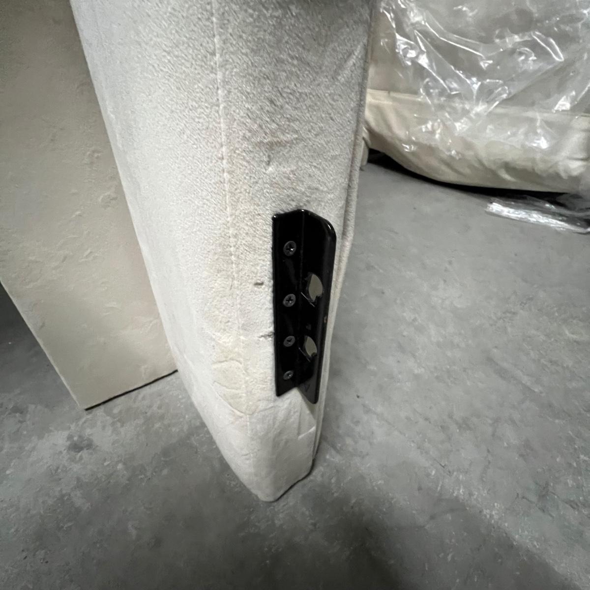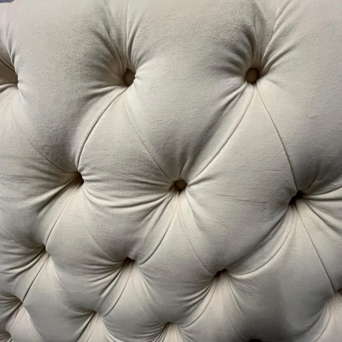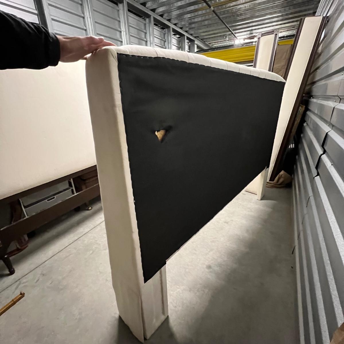 This luxurious headboard is for a king bed. It has a soft velour like button tufted cream colored upholstery. It has hardware for rails but no rails are included. The frame is most likely wood underneath, this is a sturdy frame. This item is is the back of a very full unit, will be available for a later pick up time.