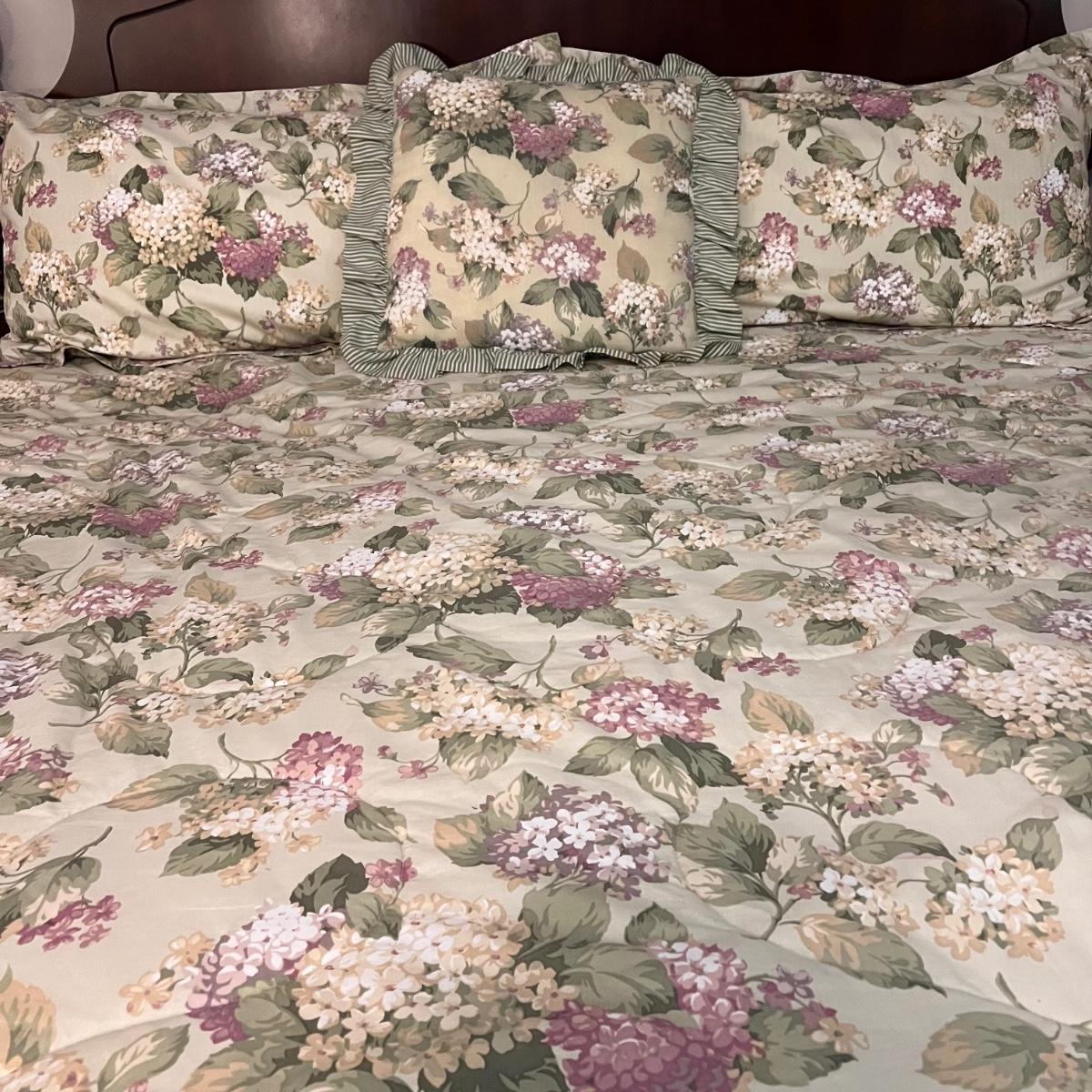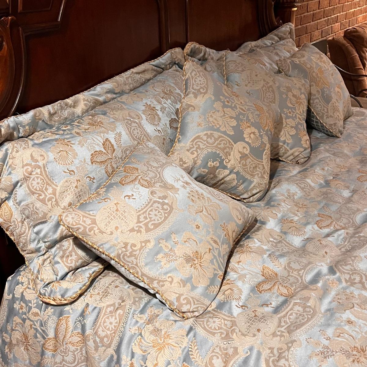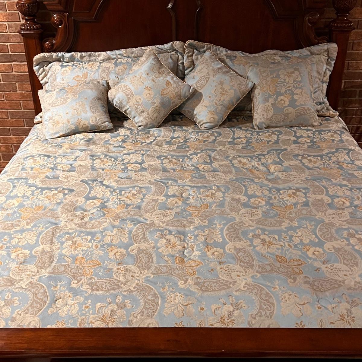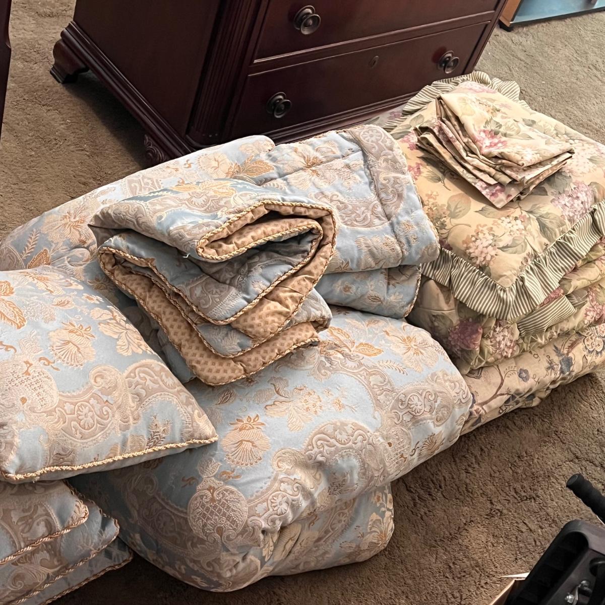 Lot includes three king size comforters that are all reversible, pillow shams to match each comforter, and a few decorative pillows. The first comforter shown is Martha Stewart. The second shown does not have any tags. The third comforter is Croscill. All in excellent condition. Shipping available. Shipping can be costly. We suggest contacting our preferred local shipping provider, Postage Express, with dimensions and getting an estimate before bidding: (828) 255-9250 or shipping@postageexpressnc.com.