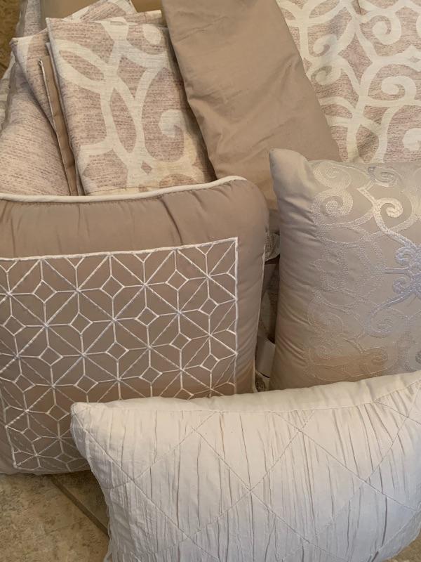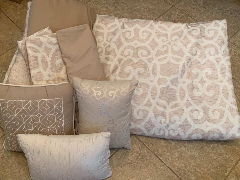 King size complete bedding. Comes with comforter, 2 shams. Bed skirt, decorative pillows, pillow cases