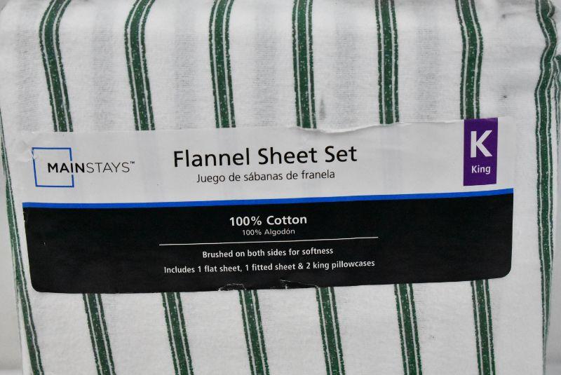 King Size Flannel Sheet Set, White with Green Stripes - New