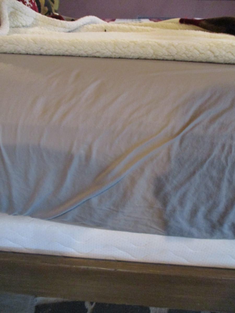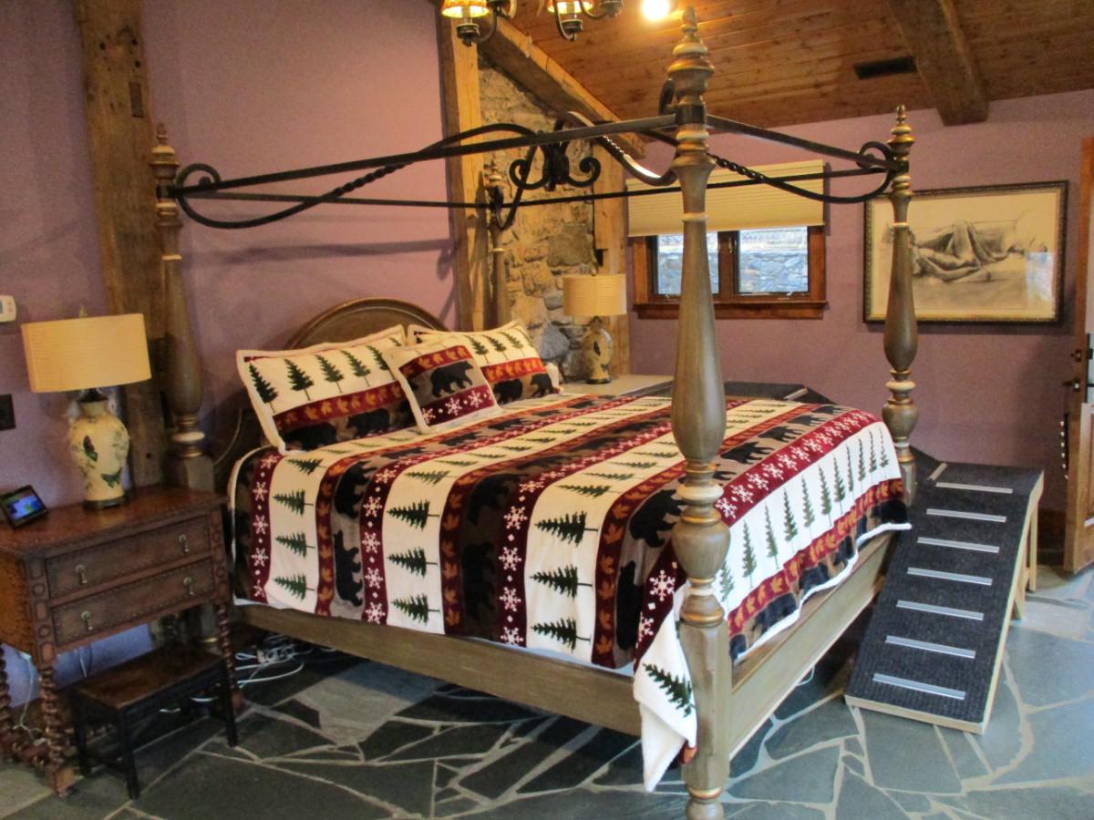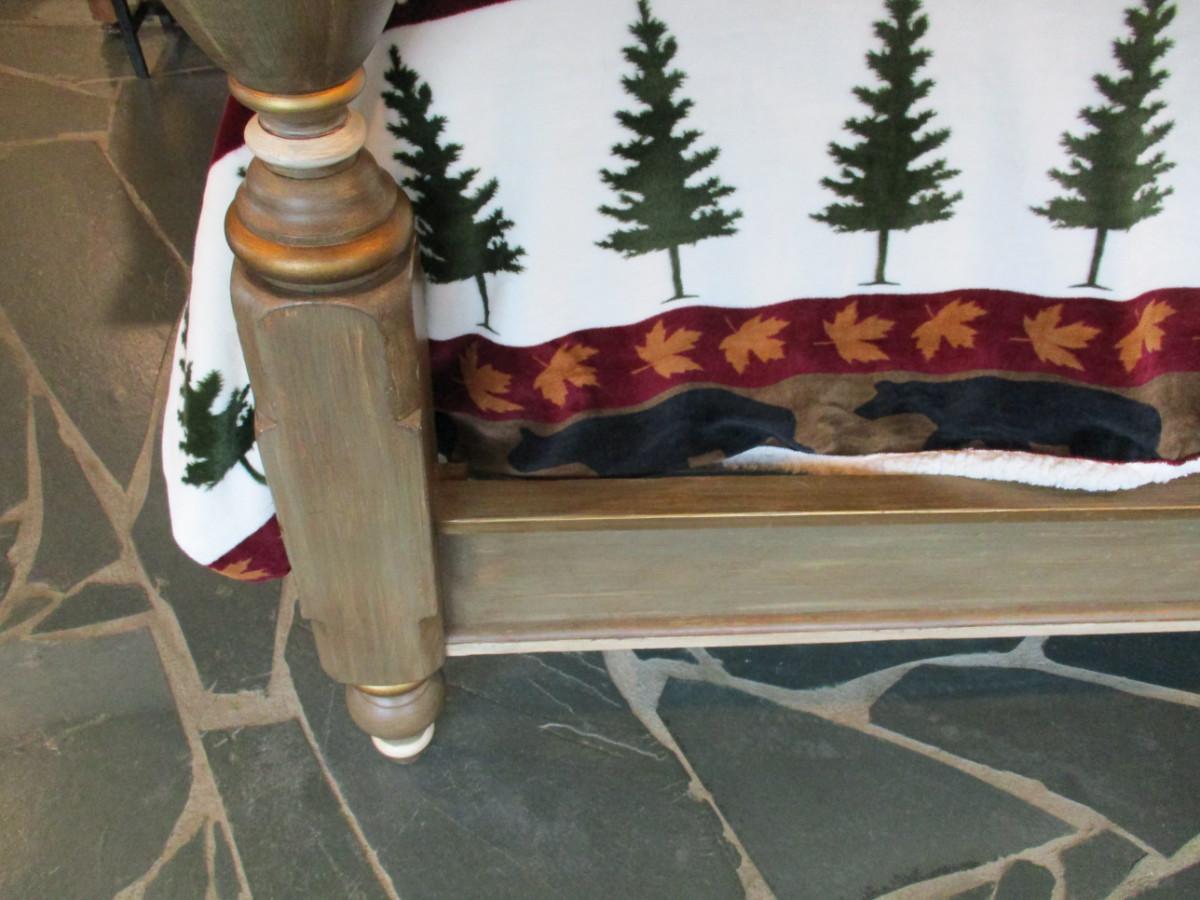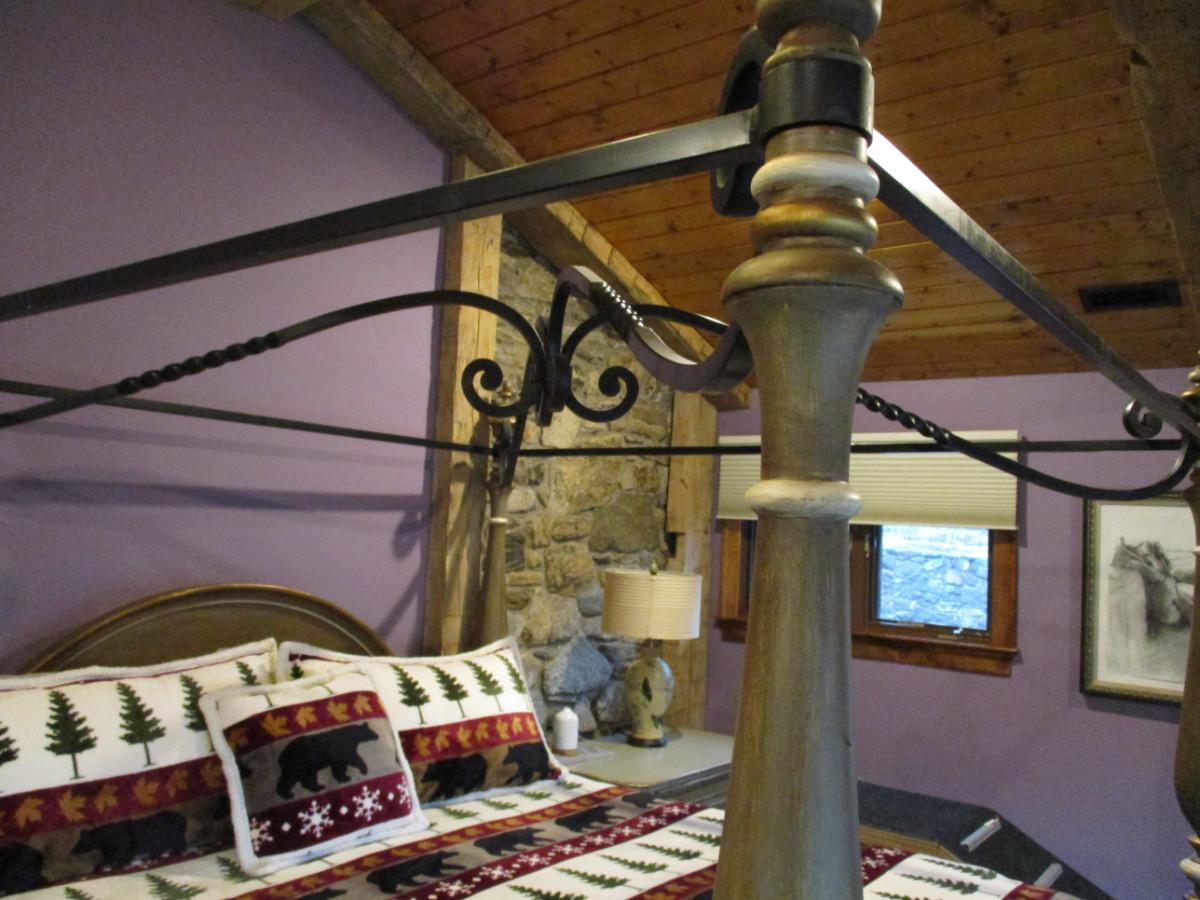 King Size Four Poster Bed with Wrought Metal Scroll Design Topper. Includes lovely, tree themed bedding and premium 16 inch mattress.