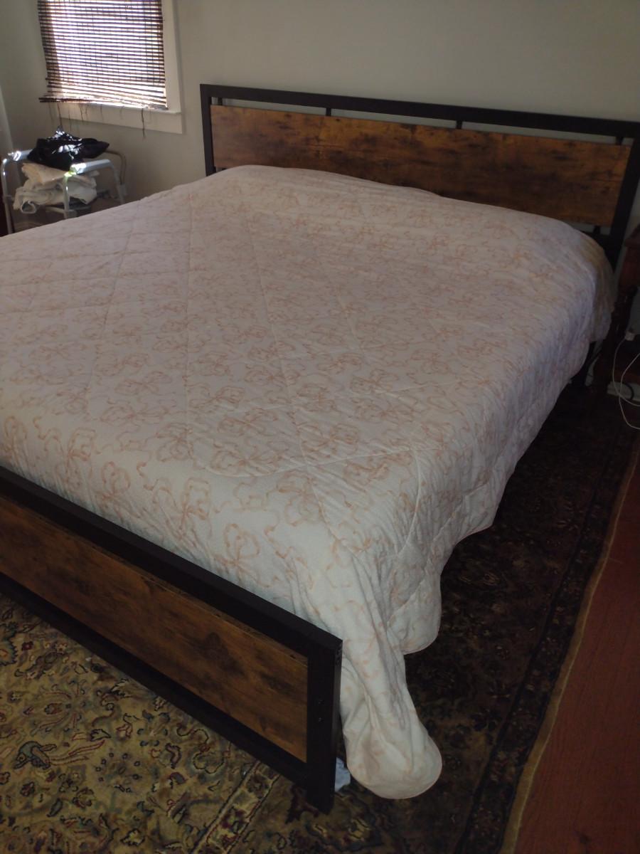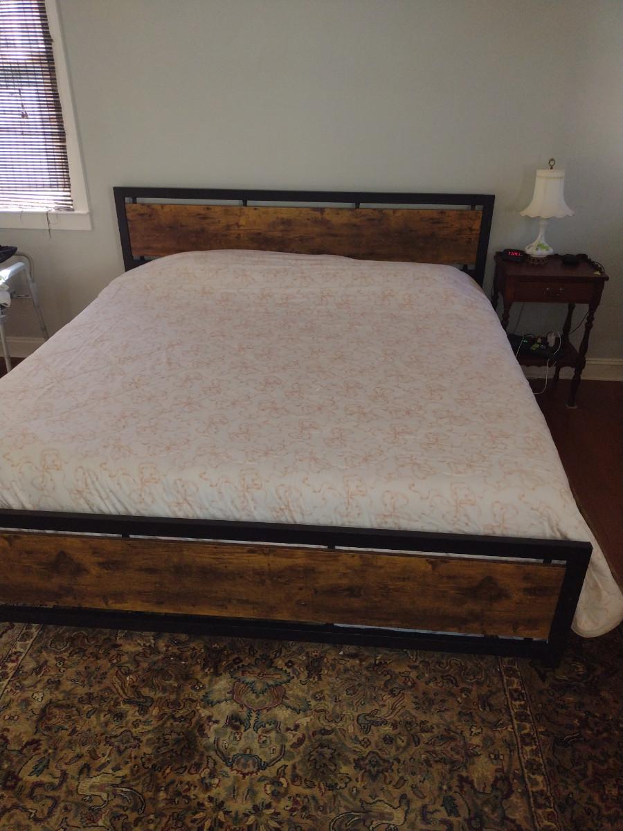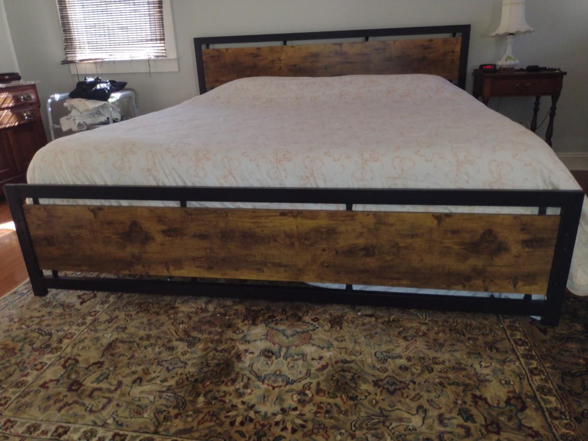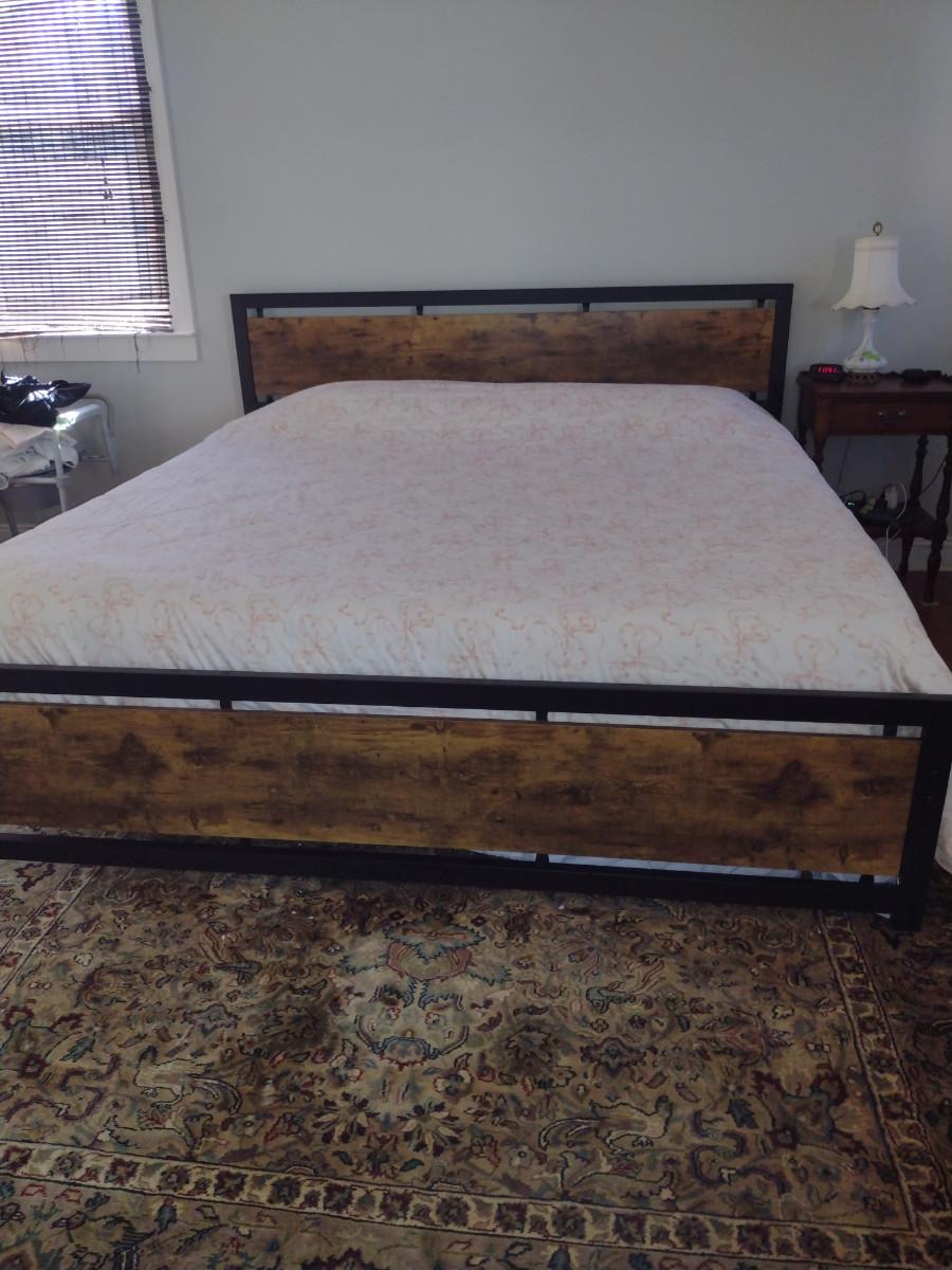 King Size Metal and Wood Bed Set with Mattress. Bedding not included. Mattress is Tuft & Needle and has some spotting- please see all pictures. Item measures approx 79" across, 82" long.